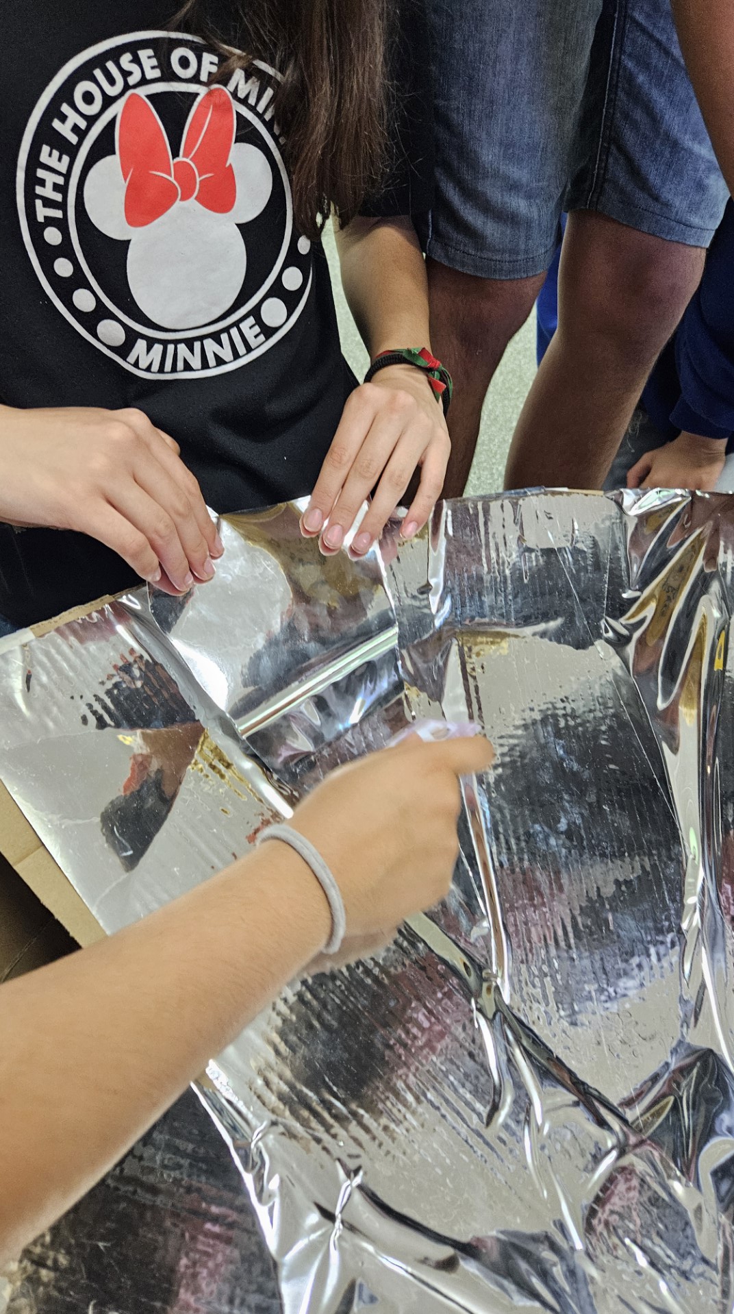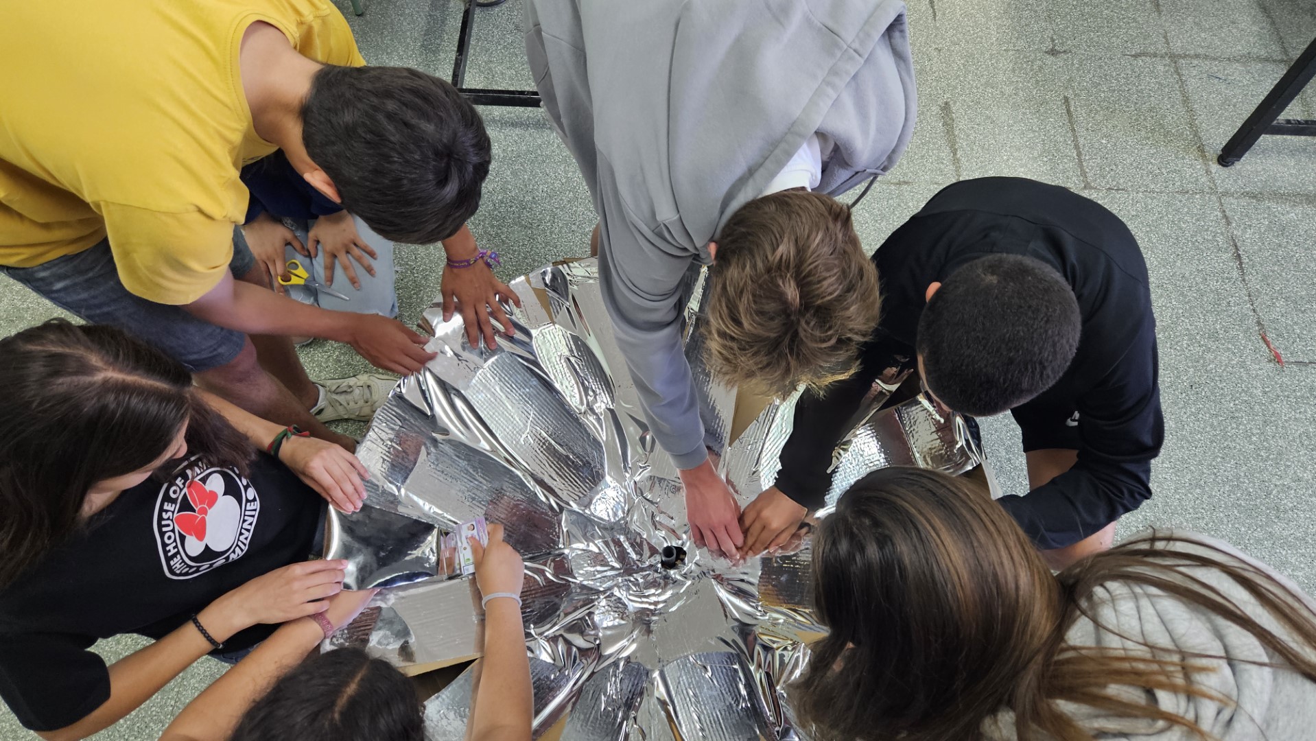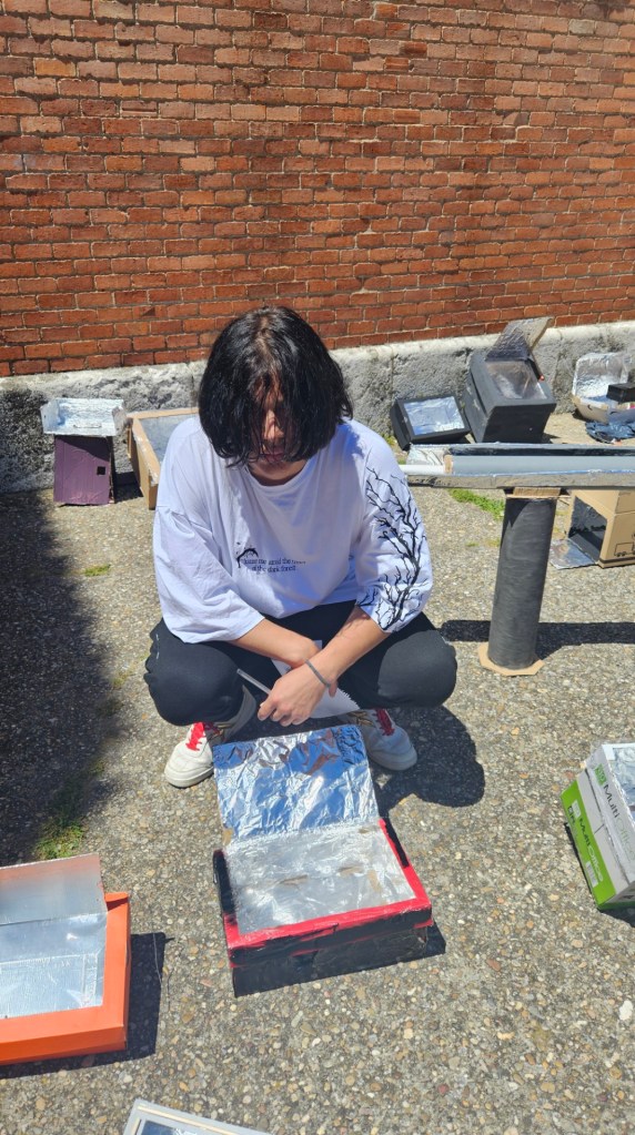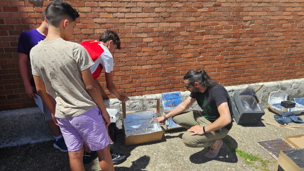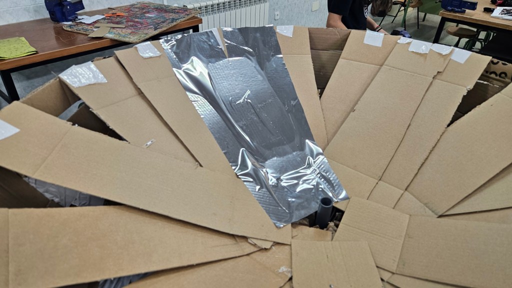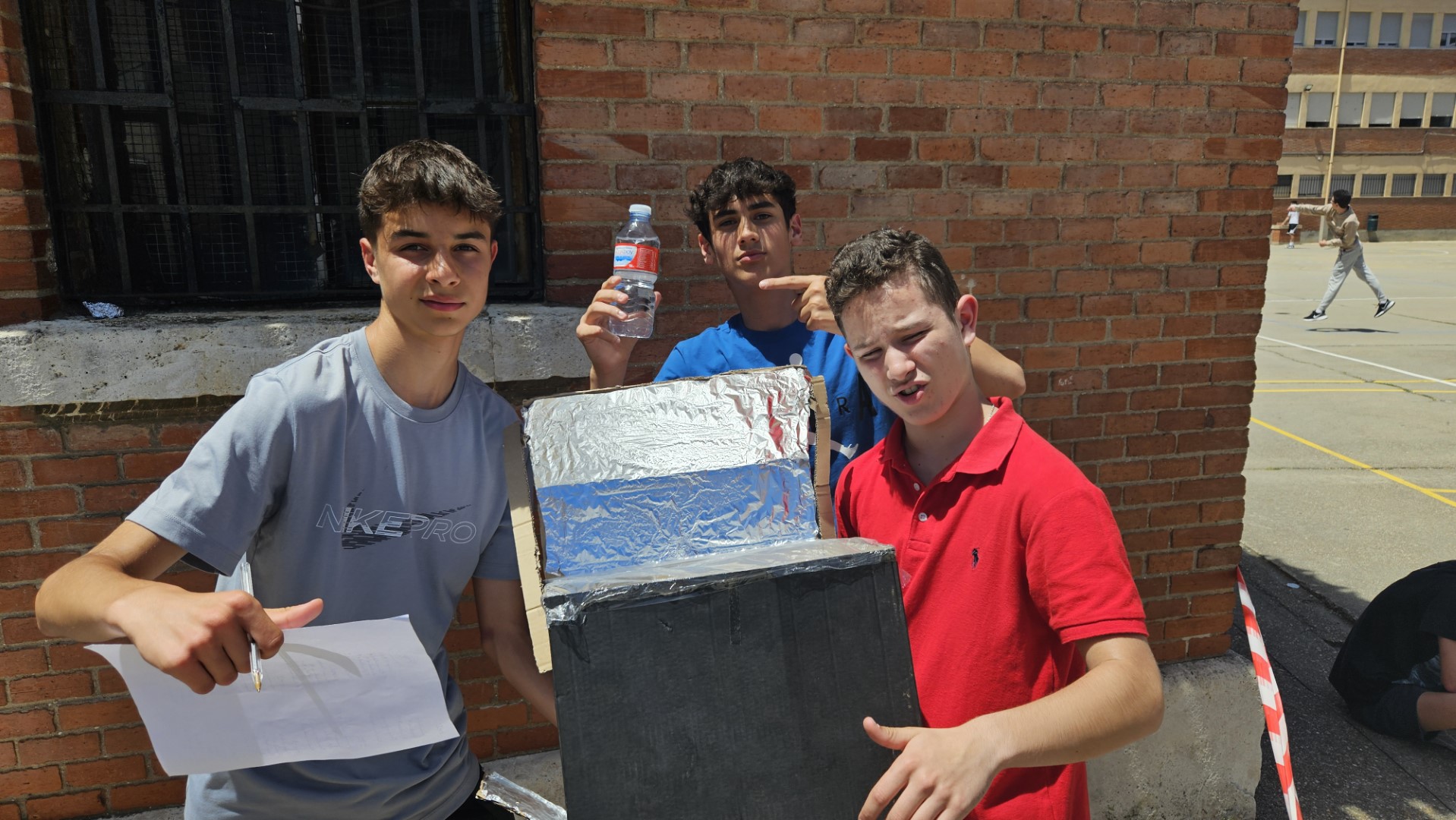 Aquí es donde la creatividad se puso a prueba. Los alumnos se dividieron en equipos y se pusieron manos a la obra para construir sus hornos solares. La mayoría utilizaron cajas de cartón para la estructura, forradas por dentro con papel de aluminio para reflejar el calor. Cubrieron la parte superior con plástico transparente para permitir la entrada de la luz solar y mantener el calor dentro. Lo que se llama efecto invernadero. Usaron cinta adhesiva para asegurar todas las partes y crear un sello hermético. Fue un proceso de prueba y error, donde cada equipo tuvo que ajustar sus diseños para mejorar la eficiencia del horno.