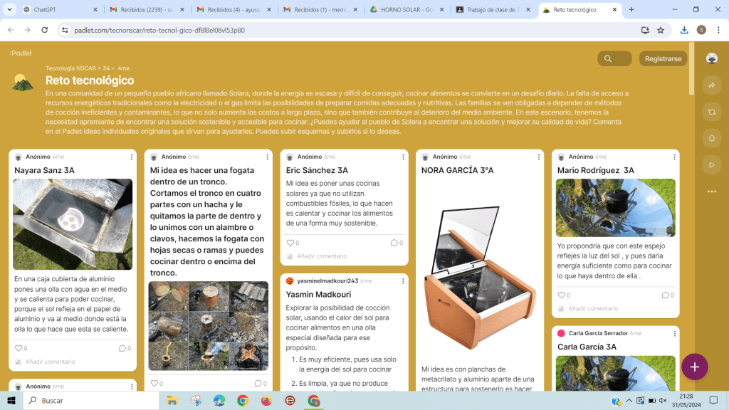 Primero, investigaron a fondo sobre Solara y los hornos solares. Las mejores ideas encontradas las suben a un padlet, donde pueden ser discutidas por el resto de compañeros. Vieron varios diseños de hornos solares y eligieron los que mejor se adaptaban a las necesidades y recursos de Solara.