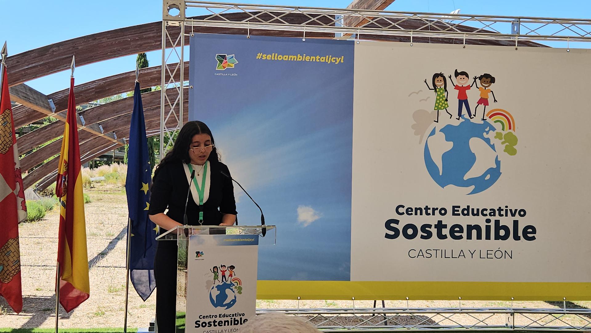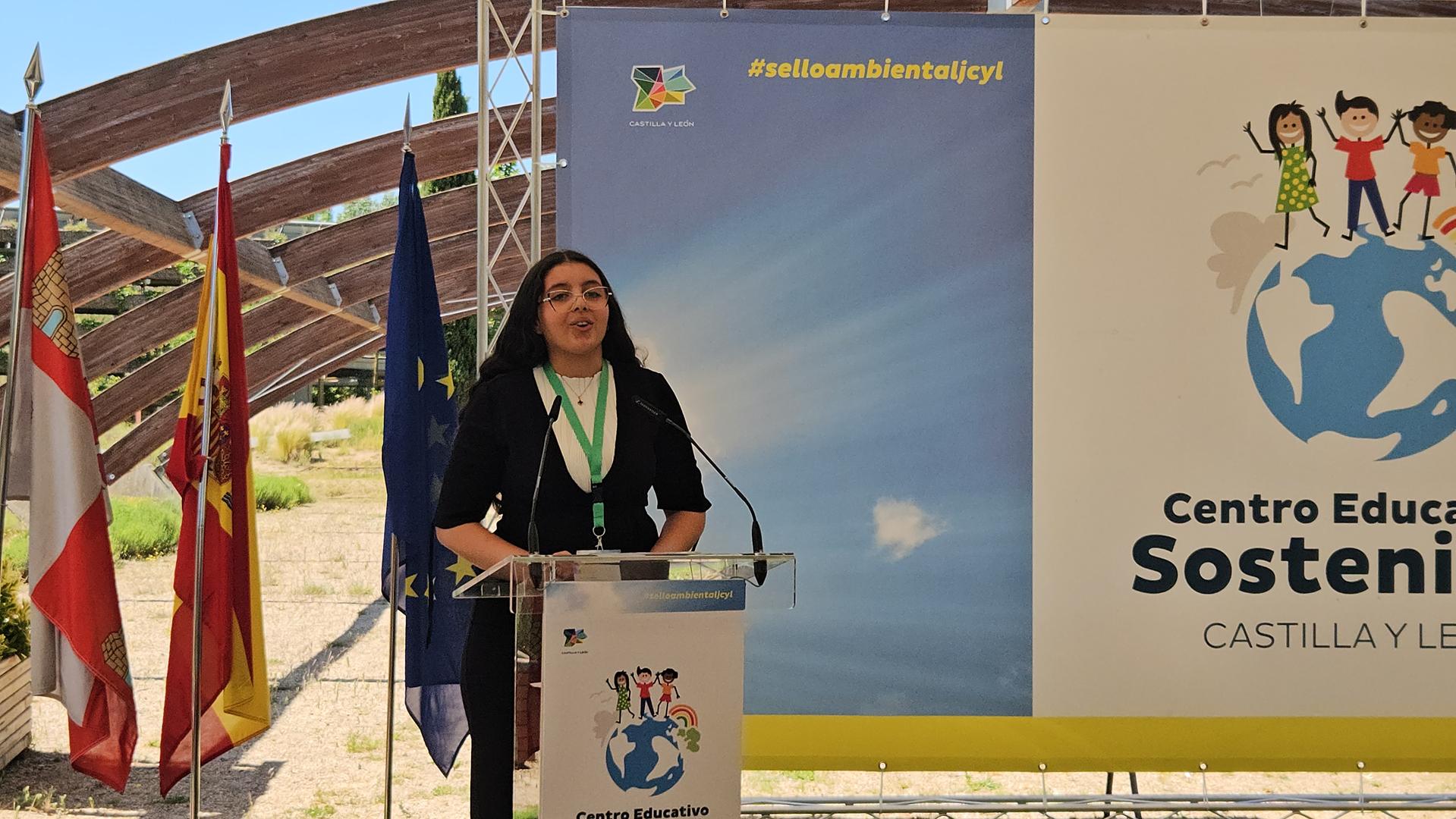 En una ceremonia celebrada en el PRAE de Valladolid, Fátima Ezhra Ait Mha Chahdaoui, alumna del Colegio Nuestra Señora del Carmen de Valladolid, ha hecho historia al convertirse en la primera joven de Castilla y León en tomar la palabra frente a instituciones públicas sobre los desafíos medioambientales y de sostenibilidad. Este evento, enmarcado en la entrega de los reconocimientos «Sello Educativo Sostenible» de la Junta de Castilla y León, contó con la presencia de los titulares de la Consejería de Medio Ambiente, Vivienda y Ordenación del Territorio, Juan Carlos Suárez-Quiñones, y de Educación, Rocío Lucas. ¡Enhorabuena a los Centros que han recibido tan distinguido sello este año!