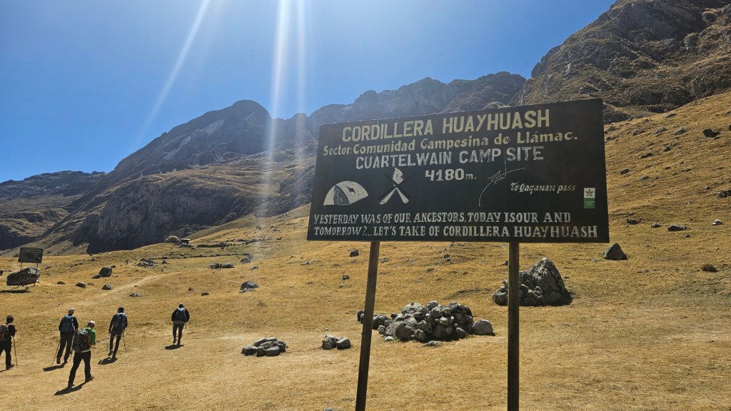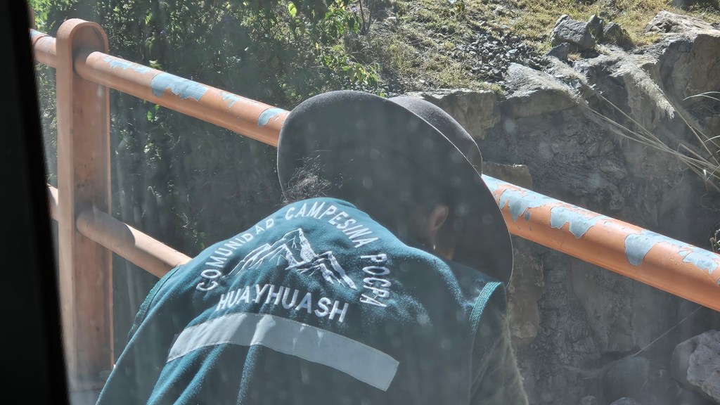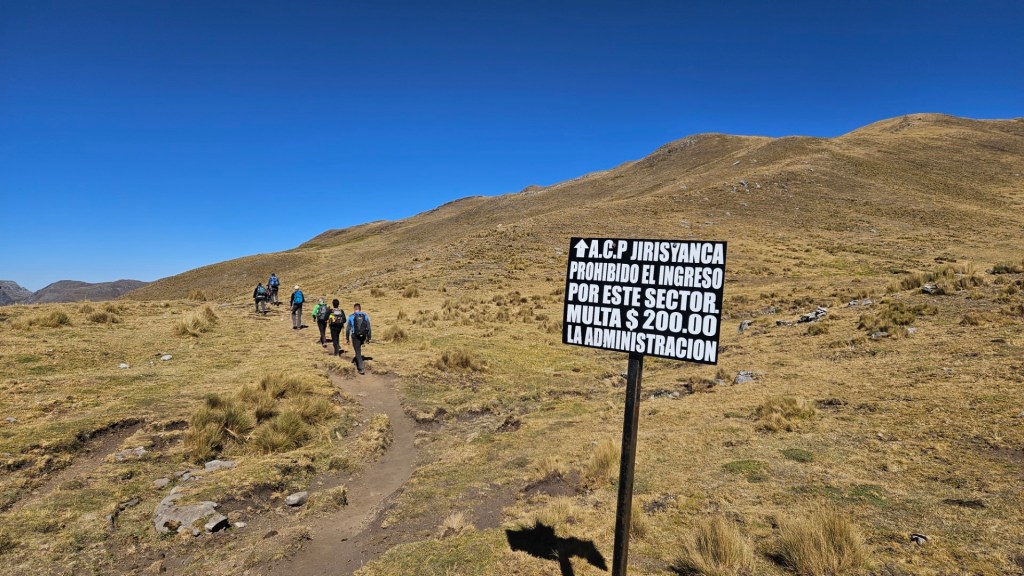 Durante el recorrido por carretera, pasamos por pequeños pueblos como Llamac y Pocpa, donde las comunidades locales nos recibieron con una tradición particular: el cobro de una entrada destinada al mantenimiento de las sendas y los servicios de los campamentos. En cada comunidad, debemos registrarnos en un libro de firmas, un recordatorio de la importancia de estas rutas para las economías locales. Nos enteramos que estas sendas fueron construidas gracias a la presencia de una mina de zinc y cobre, que ha cambiado significativamente la vida de los habitantes.