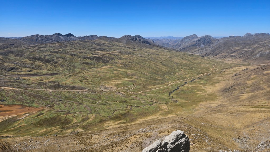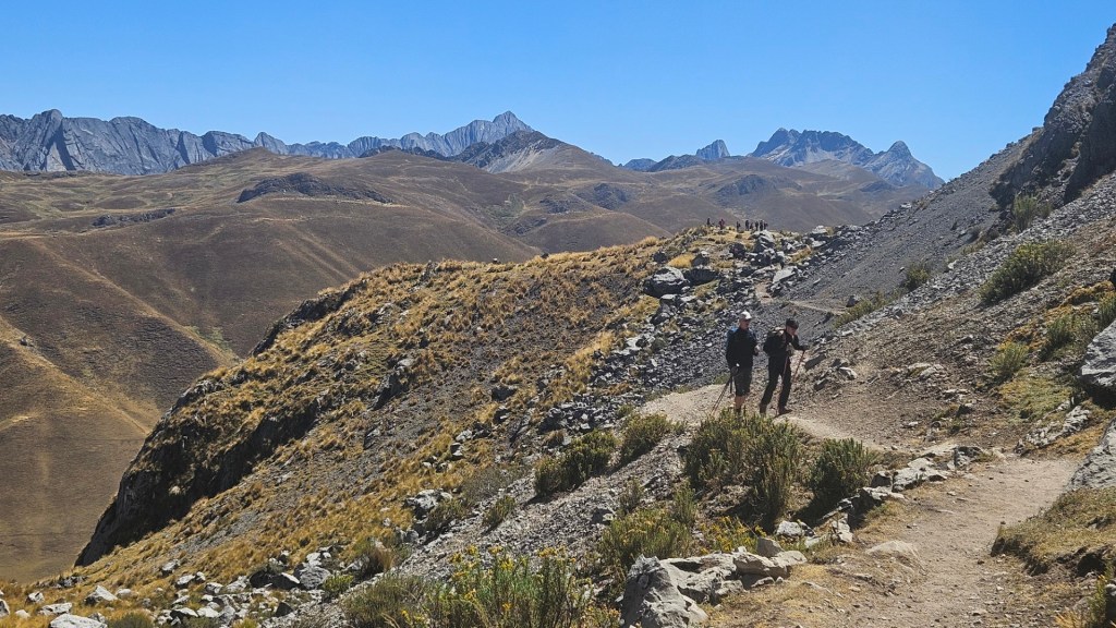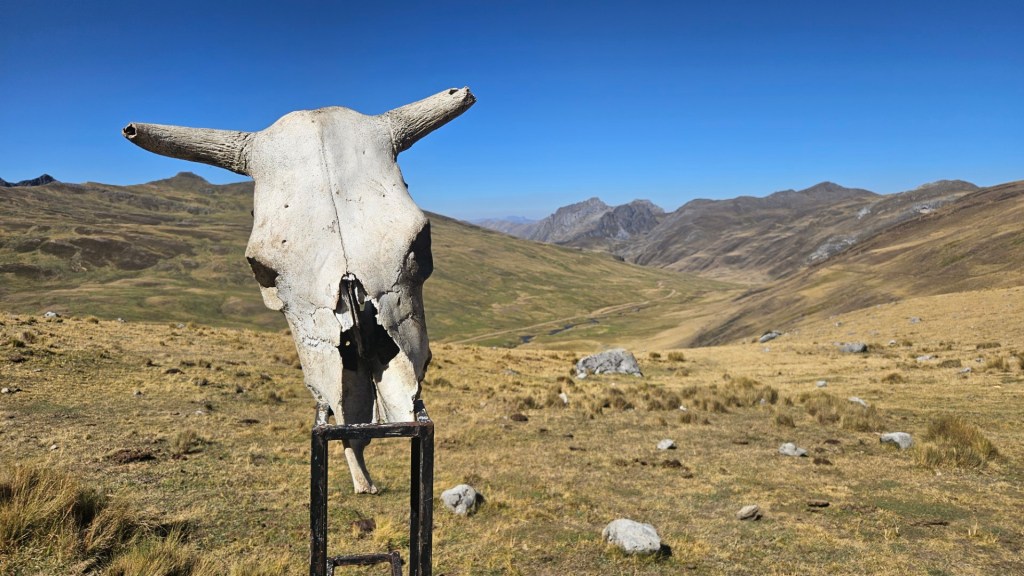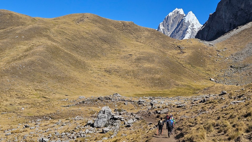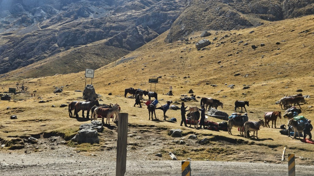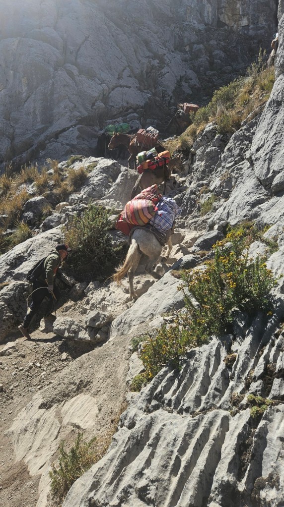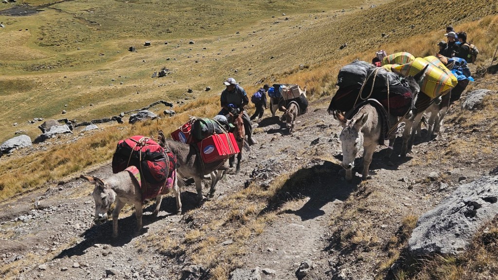 El primer desafío serio del día comienza pronto, el Paso Cacananpunta, a 4700 metros de altitud. El ascenso es duro, especialmente para las mulas que transportan el equipo, pero la recompensa es un paisaje espectacular que nos deja sin aliento.