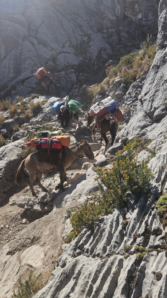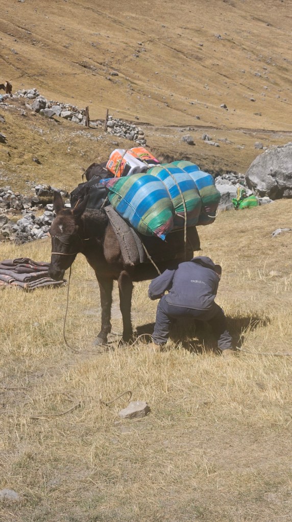 Finalmente, llegamos a Cuartelhuain, a 4180 metros sobre el nivel del mar, listos para comenzar a caminar. Este campamento lleva su nombre en honor a unas antiguas construcciones que servían de refugio para los Chaskis, los mensajeros del Imperio Inca que recorrían largas distancias a pie para entregar mensajes entre comunidades. En cierto modo, nos sentimos como esos antiguos mensajeros, cargados solo con nuestras mochilas para el día, mientras el resto de nuestro equipaje era llevado por las mulas bajo el cuidado de Ali y Octavio. Antes de iniciar la caminata, ayudamos a los muleros a descargar la furgoneta y cargar en las mulas todo el equipaje y el material que usaríamos durante el trekking.