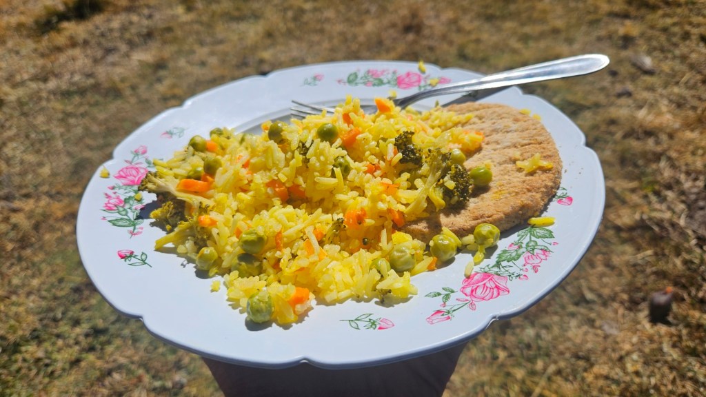 Descendemos a una zona más baja donde Pancho nos espera con un almuerzo reconfortante: un delicioso arroz con hamburguesa, que fue un verdadero manjar después del primer tramo de la caminata.