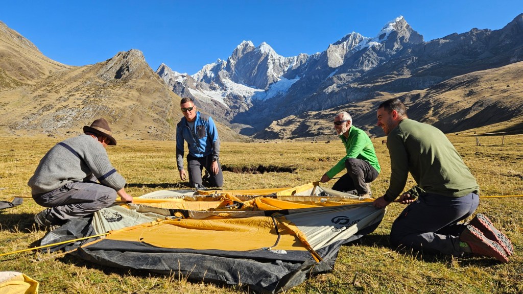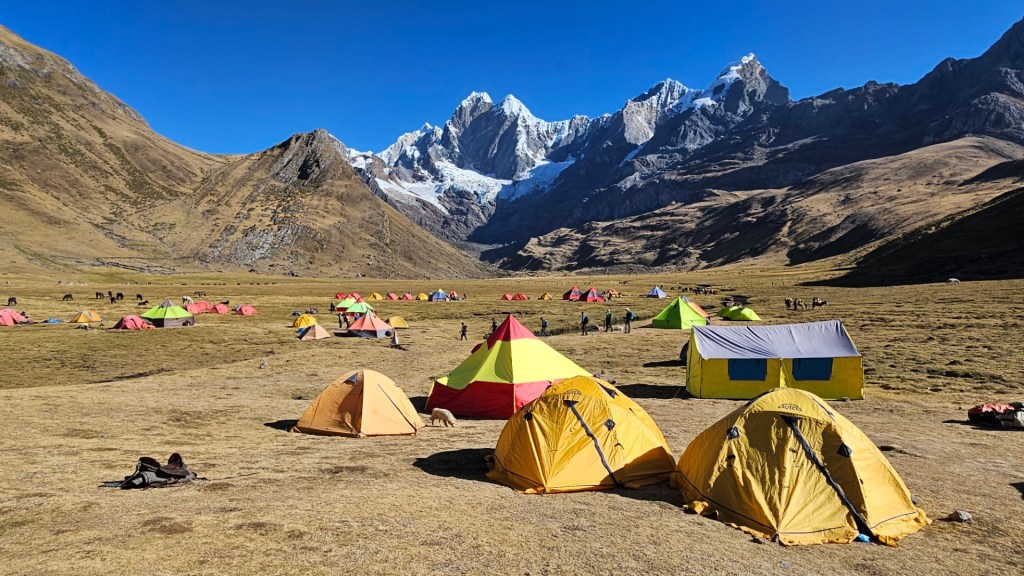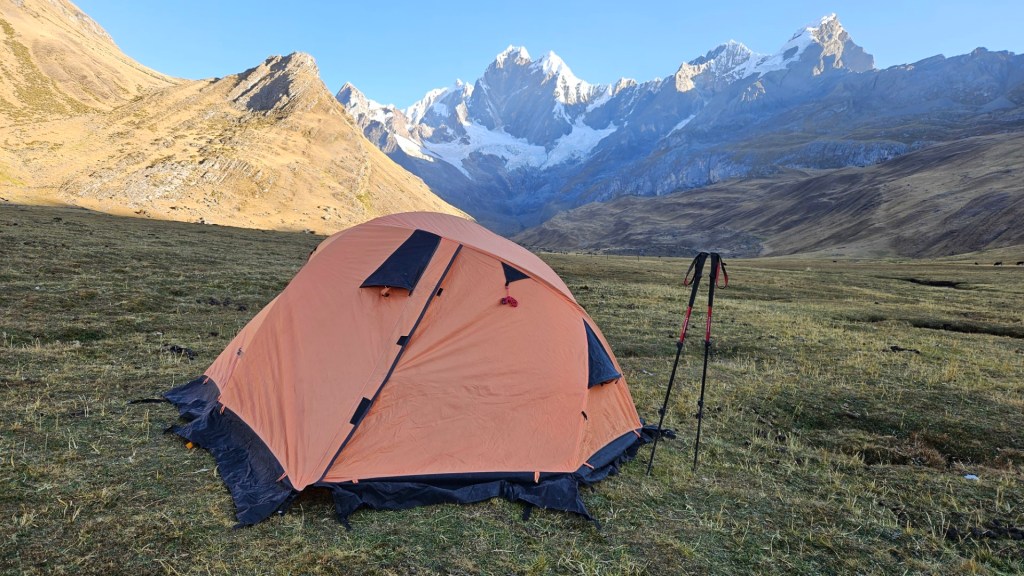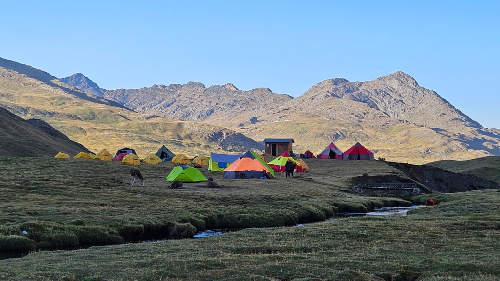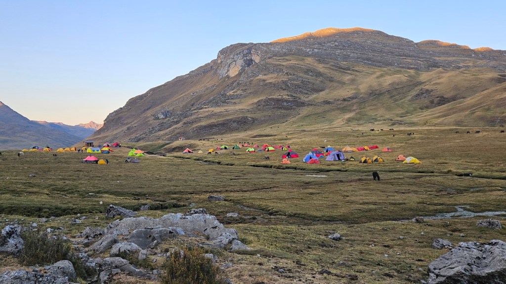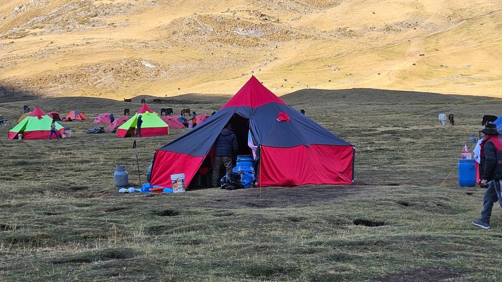 Mientras el sol se oculta, la temperatura comienza a descender rápidamente. Nos vamos a dormir envueltos en nuestros sacos de dormir, con el frío de la noche implacable, marcando el final de un primer día tan desafiante como memorable en nuestra aventura por la Cordillera Huayhuash.