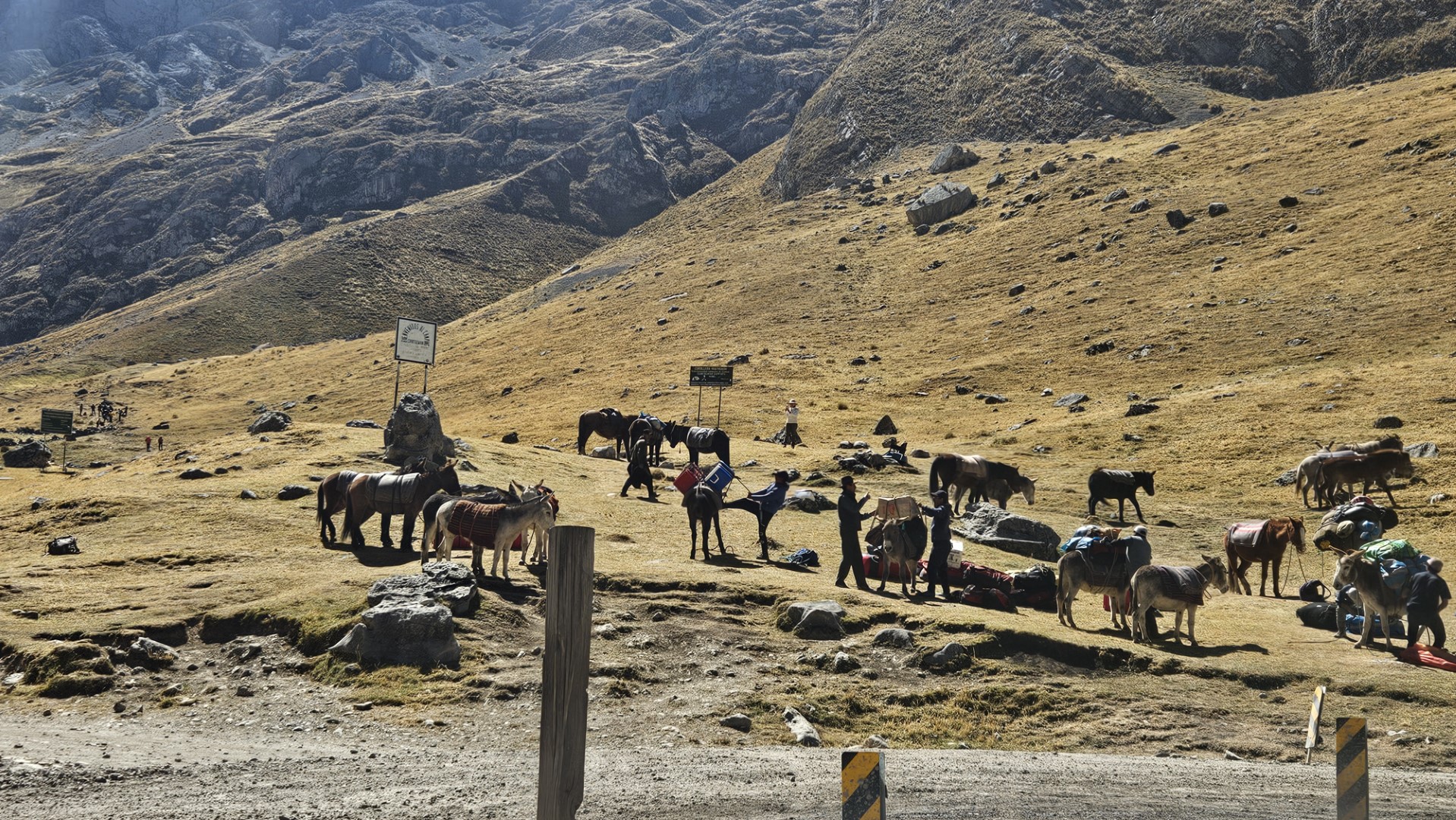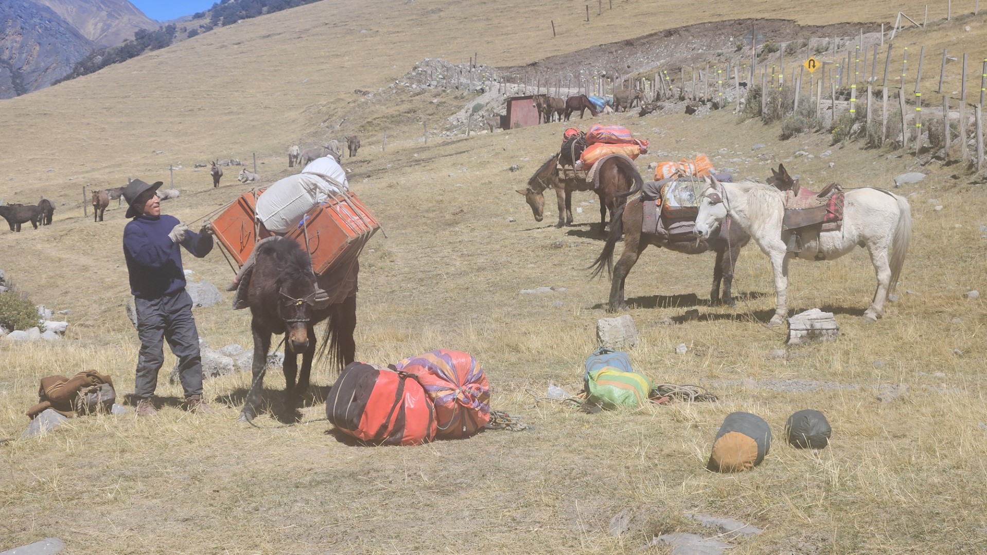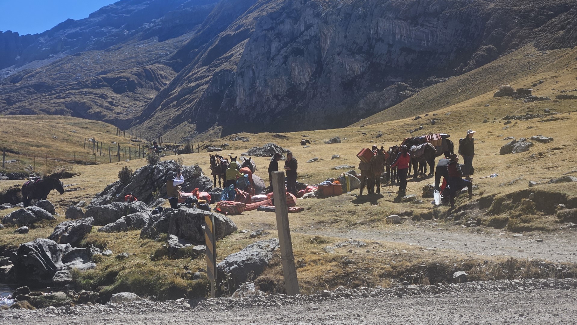 Finalmente, llegamos a Cuartelhuain, a 4180 metros sobre el nivel del mar, listos para comenzar a caminar. Este campamento lleva su nombre en honor a unas antiguas construcciones que servían de refugio para los Chaskis, los mensajeros del Imperio Inca que recorrían largas distancias a pie para entregar mensajes entre comunidades. En cierto modo, nos sentimos como esos antiguos mensajeros, cargados solo con nuestras mochilas para el día, mientras el resto de nuestro equipaje era llevado por las mulas bajo el cuidado de Ali y Octavio. Antes de iniciar la caminata, ayudamos a los muleros a descargar la furgoneta y cargar en las mulas todo el equipaje y el material que usaríamos durante el trekking.