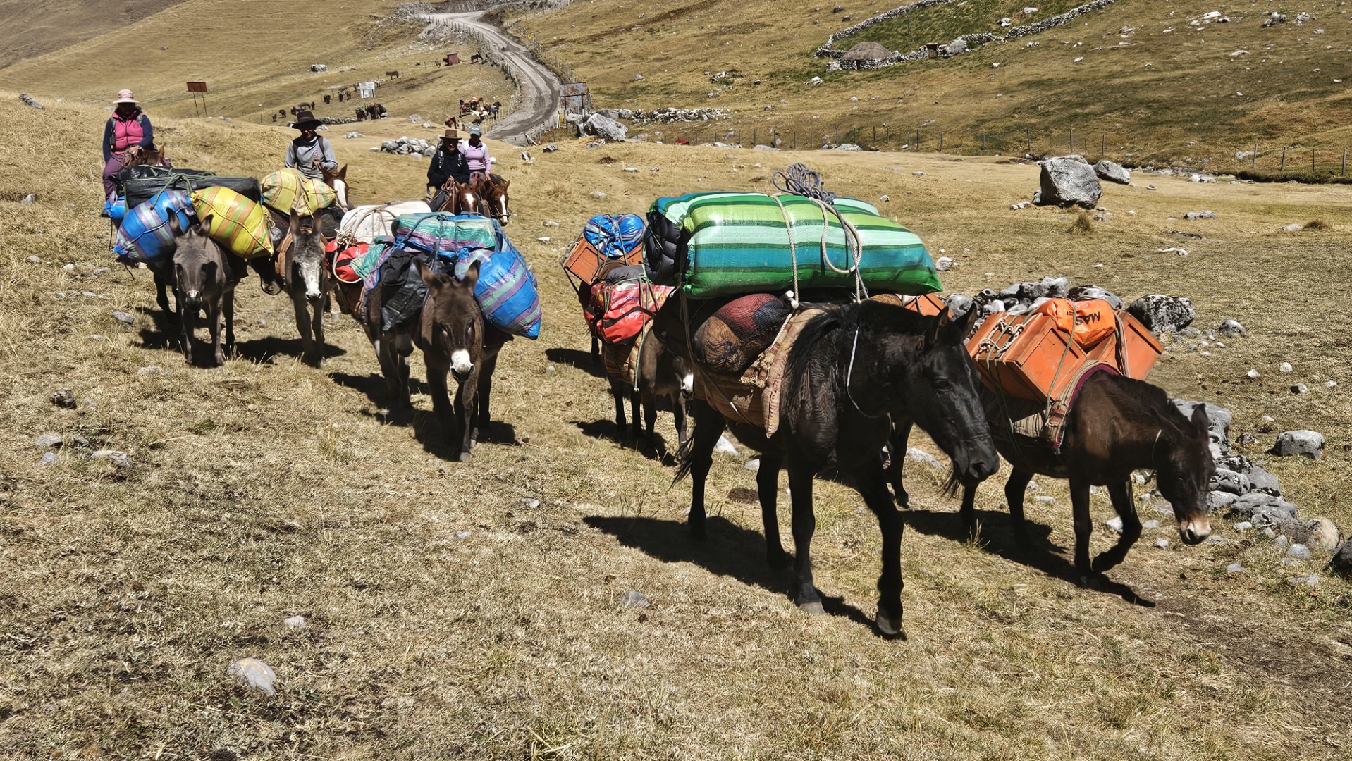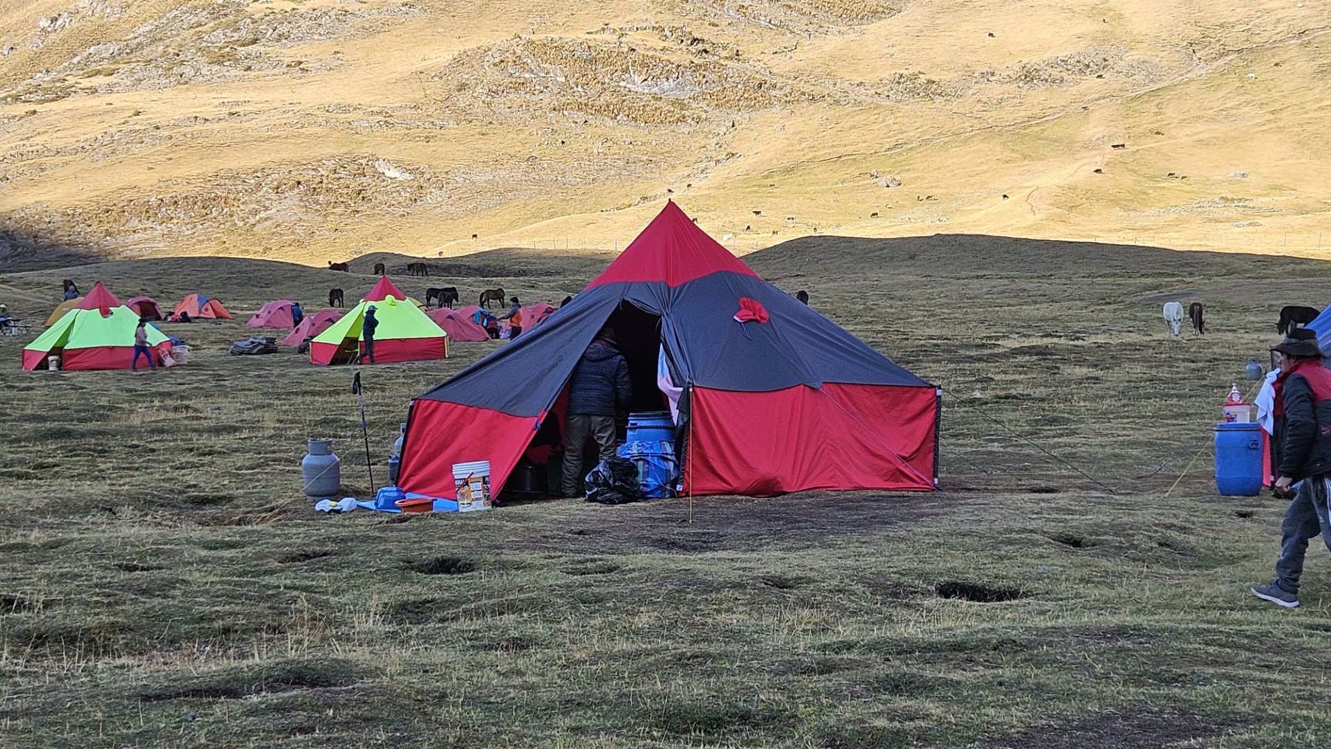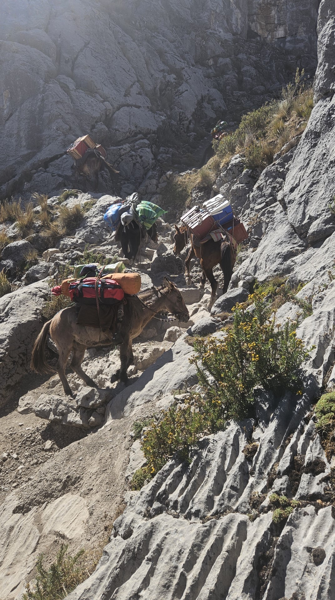Finalmente, llegamos a Cuartelhuain, a 4180 metros sobre el nivel del mar, listos para comenzar a caminar. Este campamento lleva su nombre en honor a unas antiguas construcciones que servían de refugio para los Chaskis, los mensajeros del Imperio Inca que recorrían largas distancias a pie para entregar mensajes entre comunidades. En cierto modo, nos sentimos como esos antiguos mensajeros, cargados solo con nuestras mochilas para el día, mientras el resto de nuestro equipaje era llevado por las mulas bajo el cuidado de Ali y Octavio. Antes de iniciar la caminata, ayudamos a los muleros a descargar la furgoneta y cargar en las mulas todo el equipaje y el material que usaríamos durante el trekking.