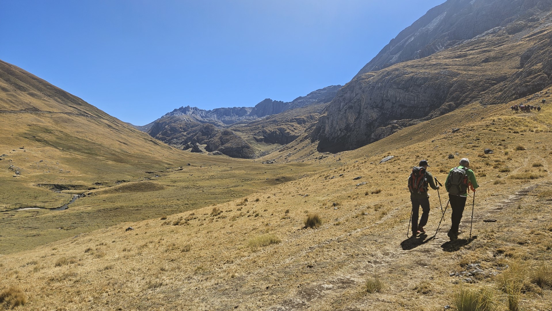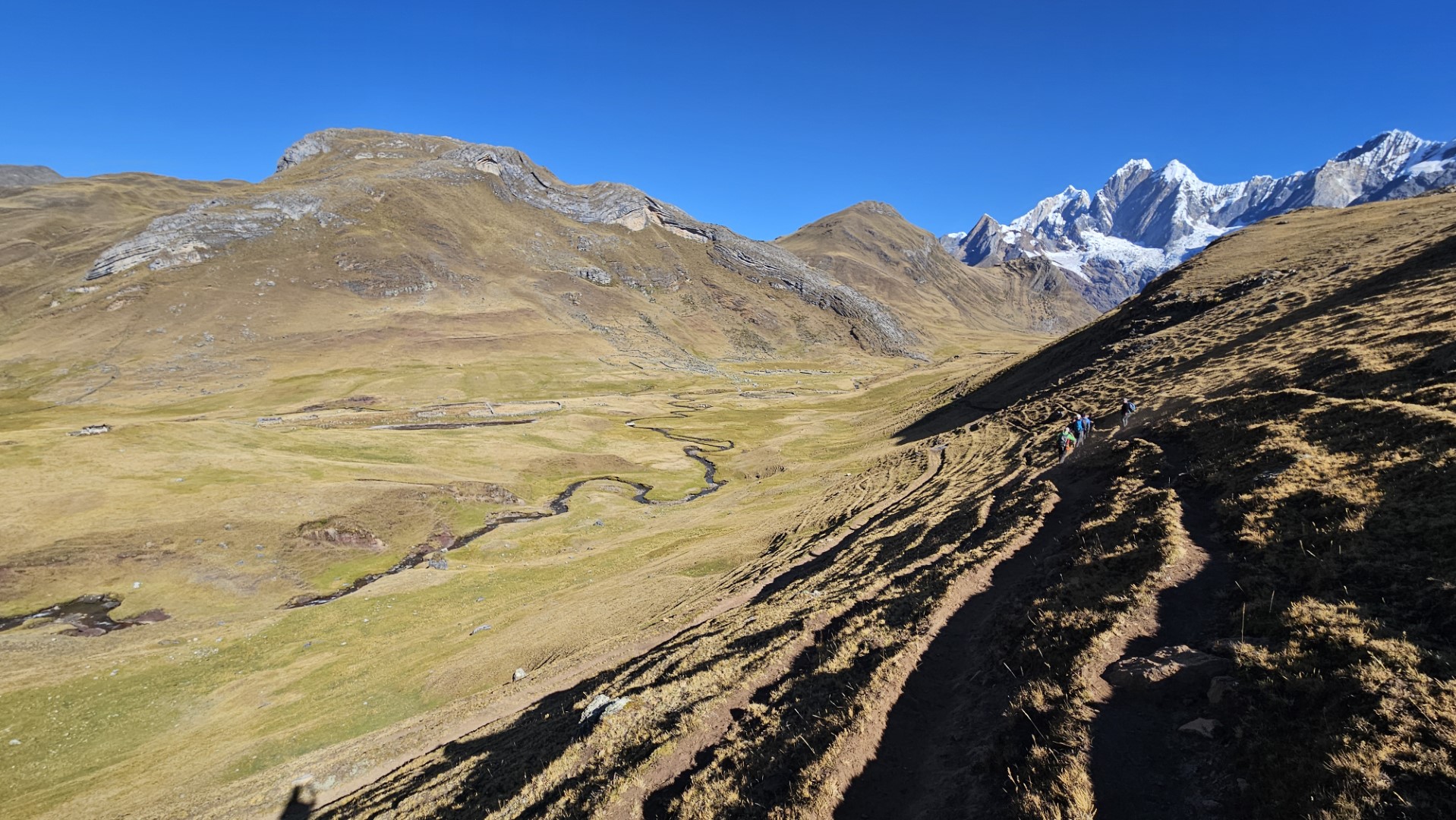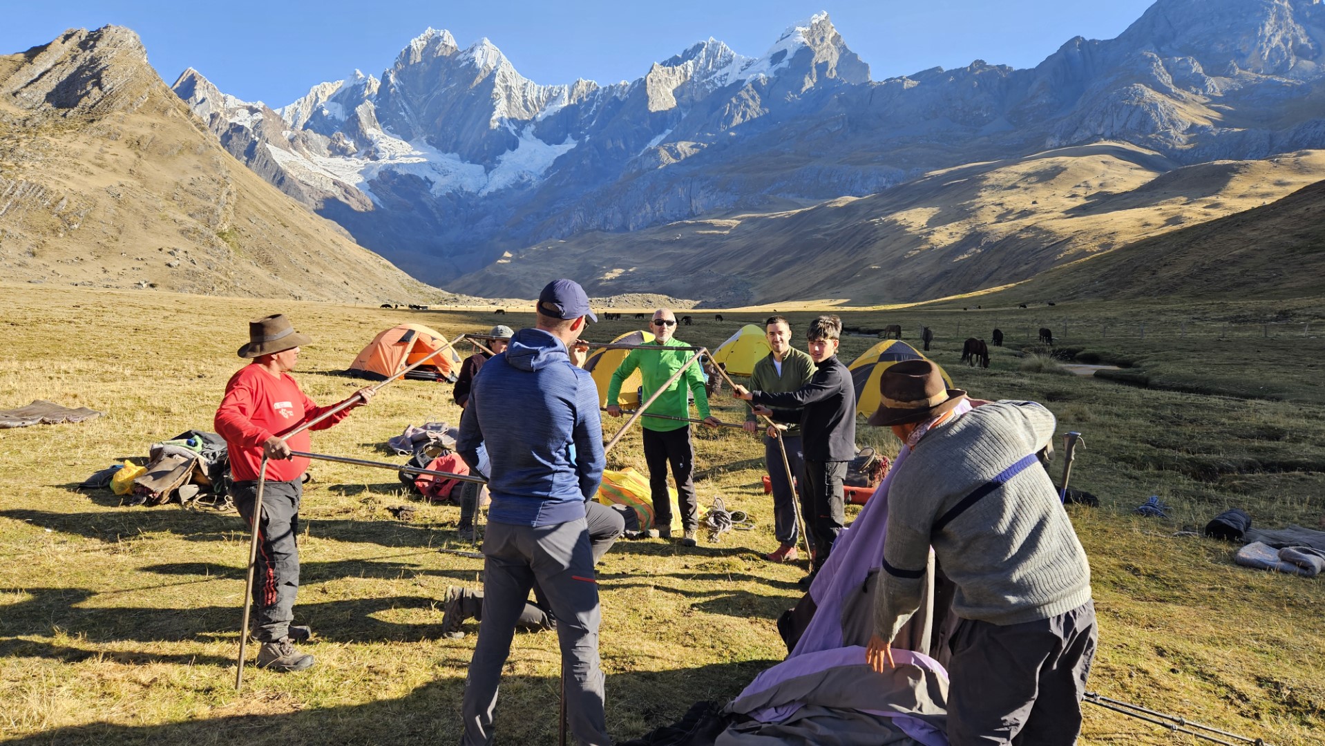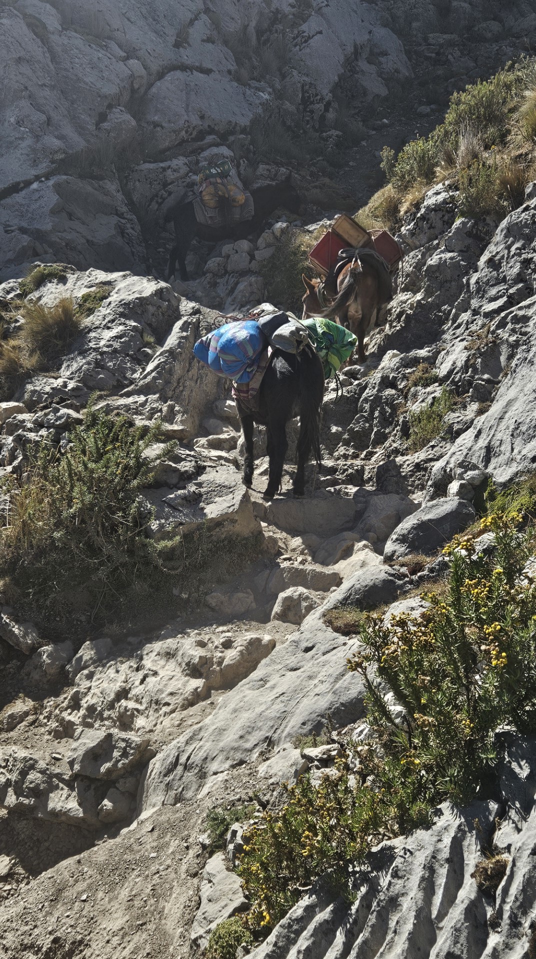 El primer desafío serio del día comienza pronto, el Paso Cacananpunta, a 4700 metros de altitud. El ascenso es duro, especialmente para las mulas que transportan el equipo, pero la recompensa es un paisaje espectacular que nos deja sin aliento.