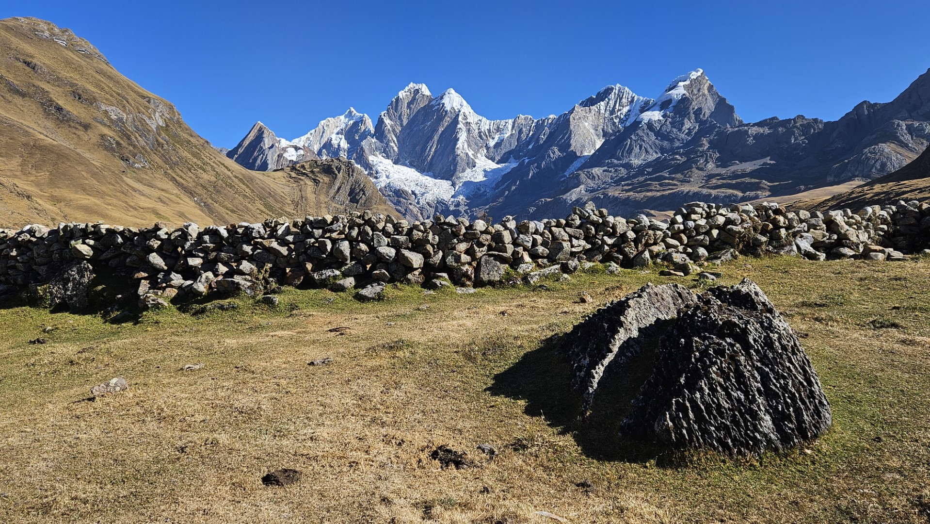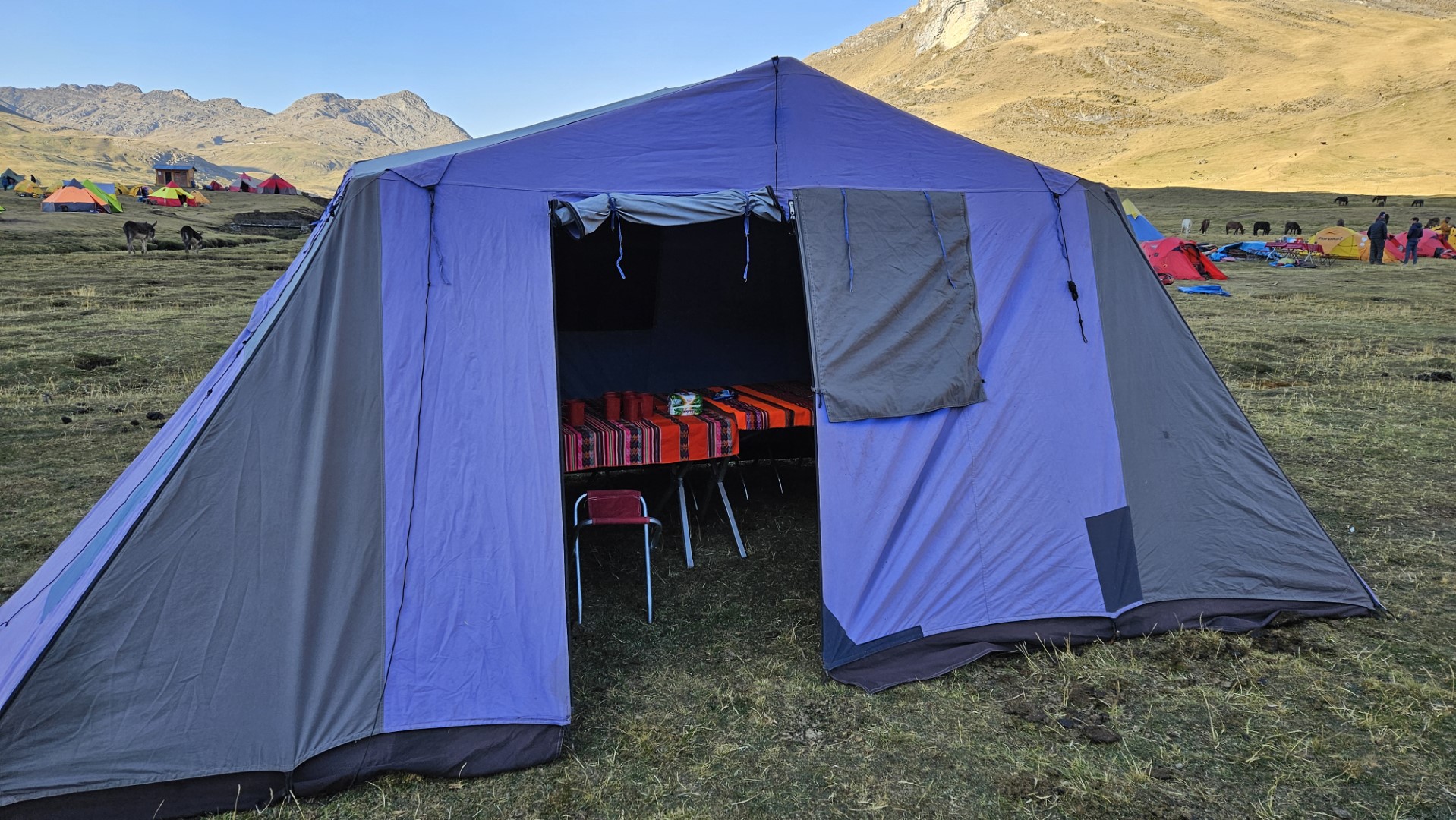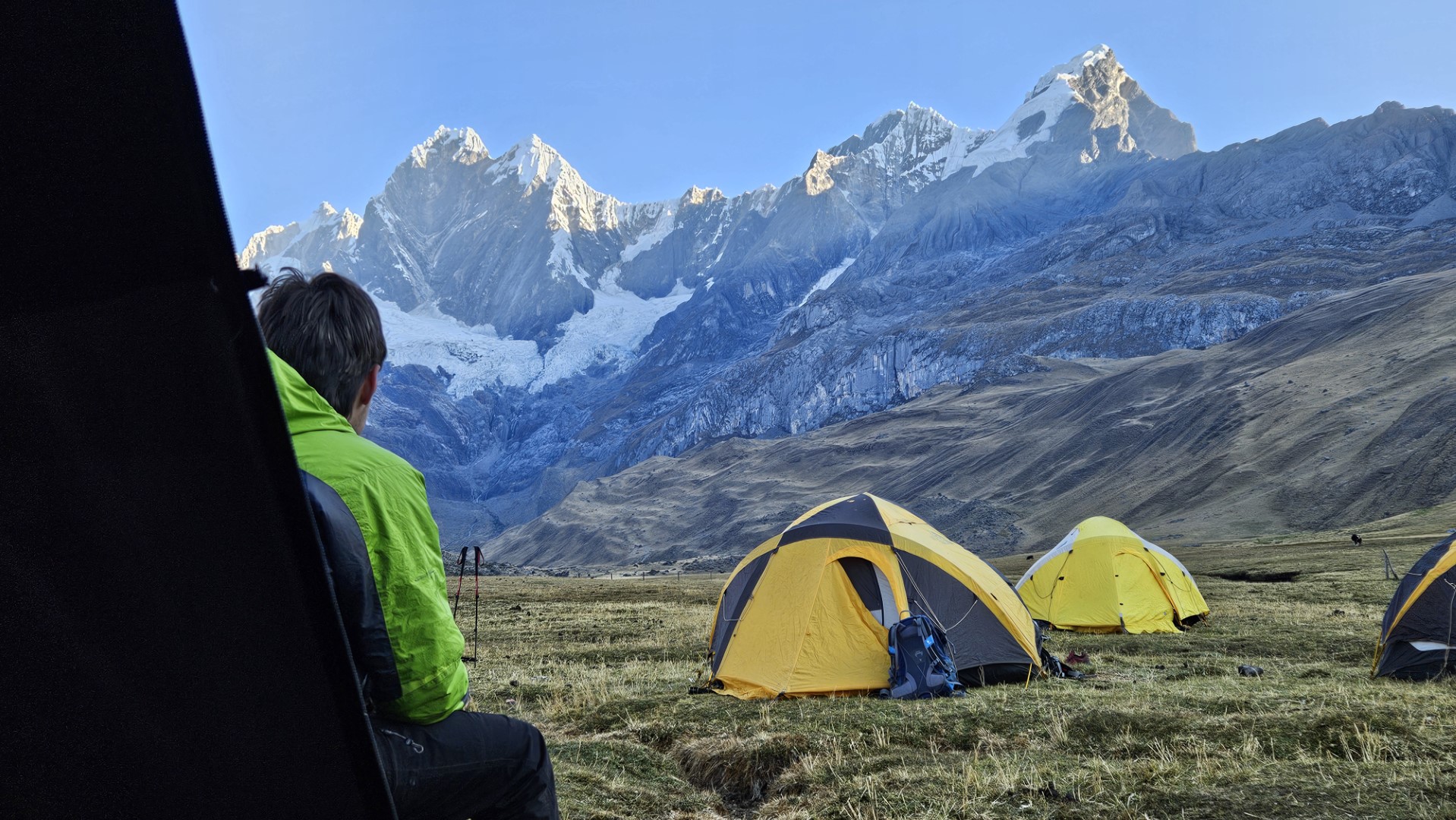 Mientras el sol se oculta, la temperatura comienza a descender rápidamente. Nos vamos a dormir envueltos en nuestros sacos de dormir, con el frío de la noche implacable, marcando el final de un primer día tan desafiante como memorable en nuestra aventura por la Cordillera Huayhuash.