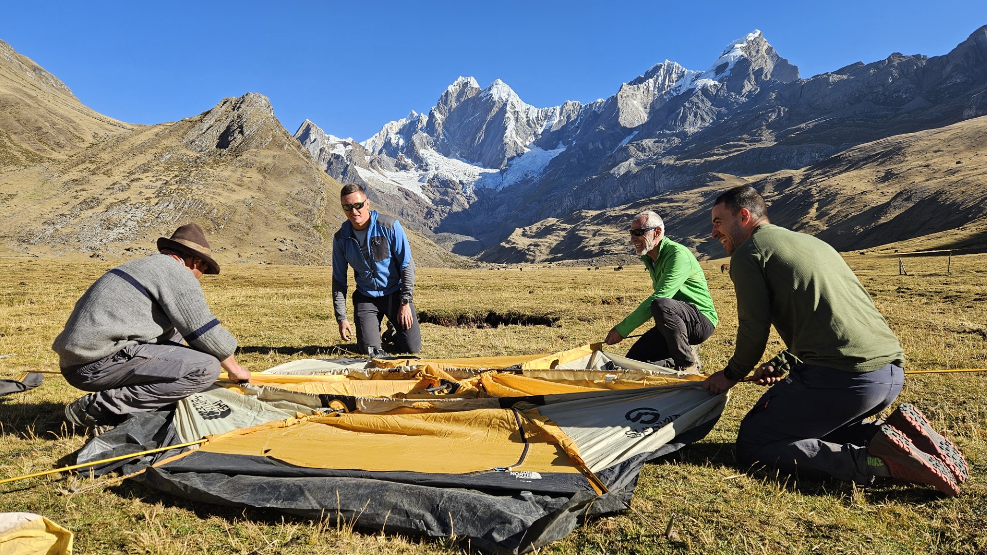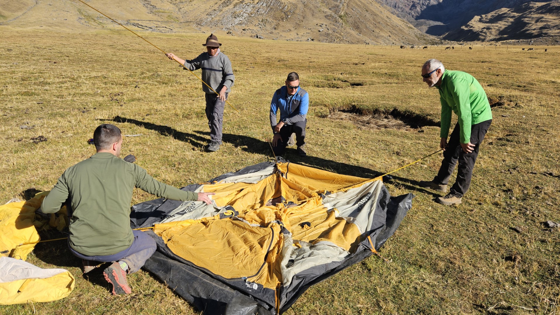 Montar las tiendas es tarea de los muleros que habiamos contratado, pero un pequeño retraso de los mismos hace que tomemos el asunto en nuestras propias manos y empecemos a montar las tiendas. Mientras luchamos con estacas y cuerdas, dos de nosotros nos las arreglamos para evitar cualquier tipo de trabajo. Uno de ellos, con una habilidad innata para hacerse el despistado, se dedica a dar vueltas y mirar al horizonte como si buscara algo de vital importancia.
