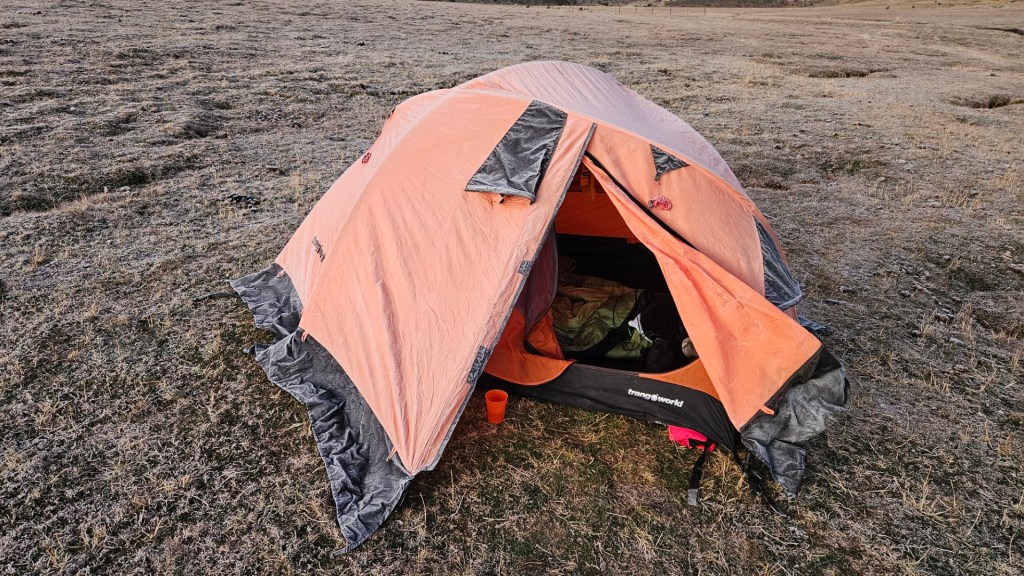 Como de costumbre, dormir dentro de una tienda de campaña no es lo mio. El espacio cerrado agobia y, por más que intentas relajarte, no logras conciliar el sueño. Paso la noche dando vueltas, mientras el frio y los sonidos de la naturaleza te mantienen despierto, deseando que llegue la mañana para poder salir al aire libre y escapar de esa sensación de encierro que no me deja descansar. ¡Paciencia!