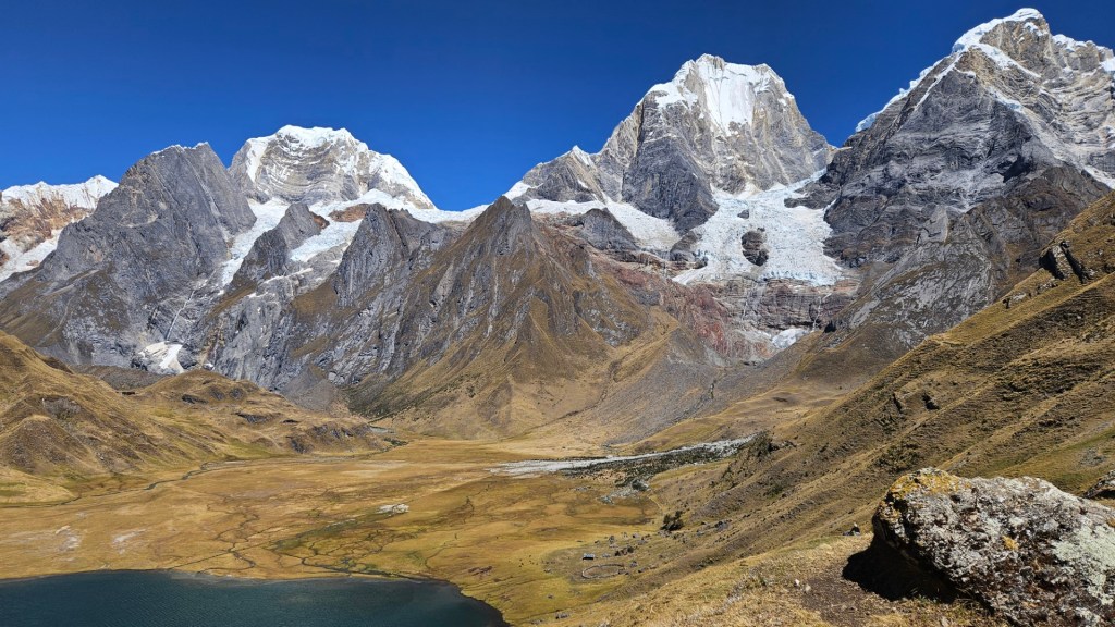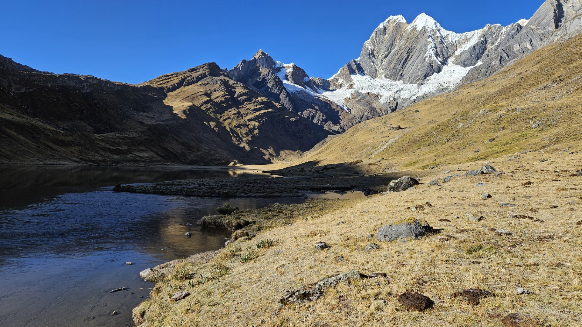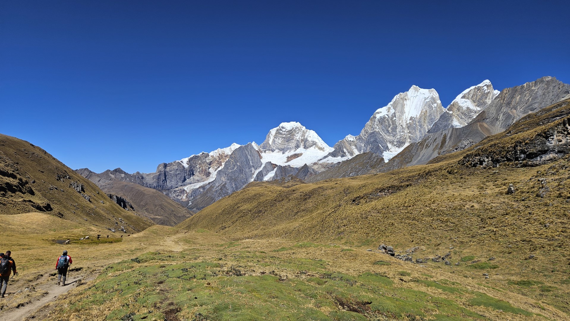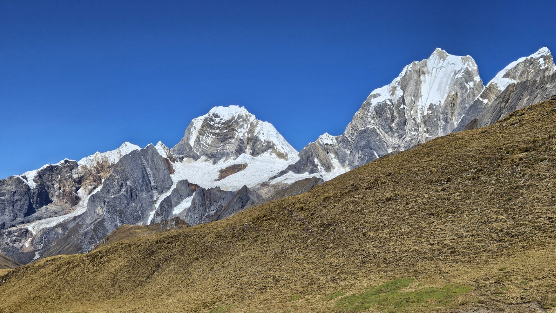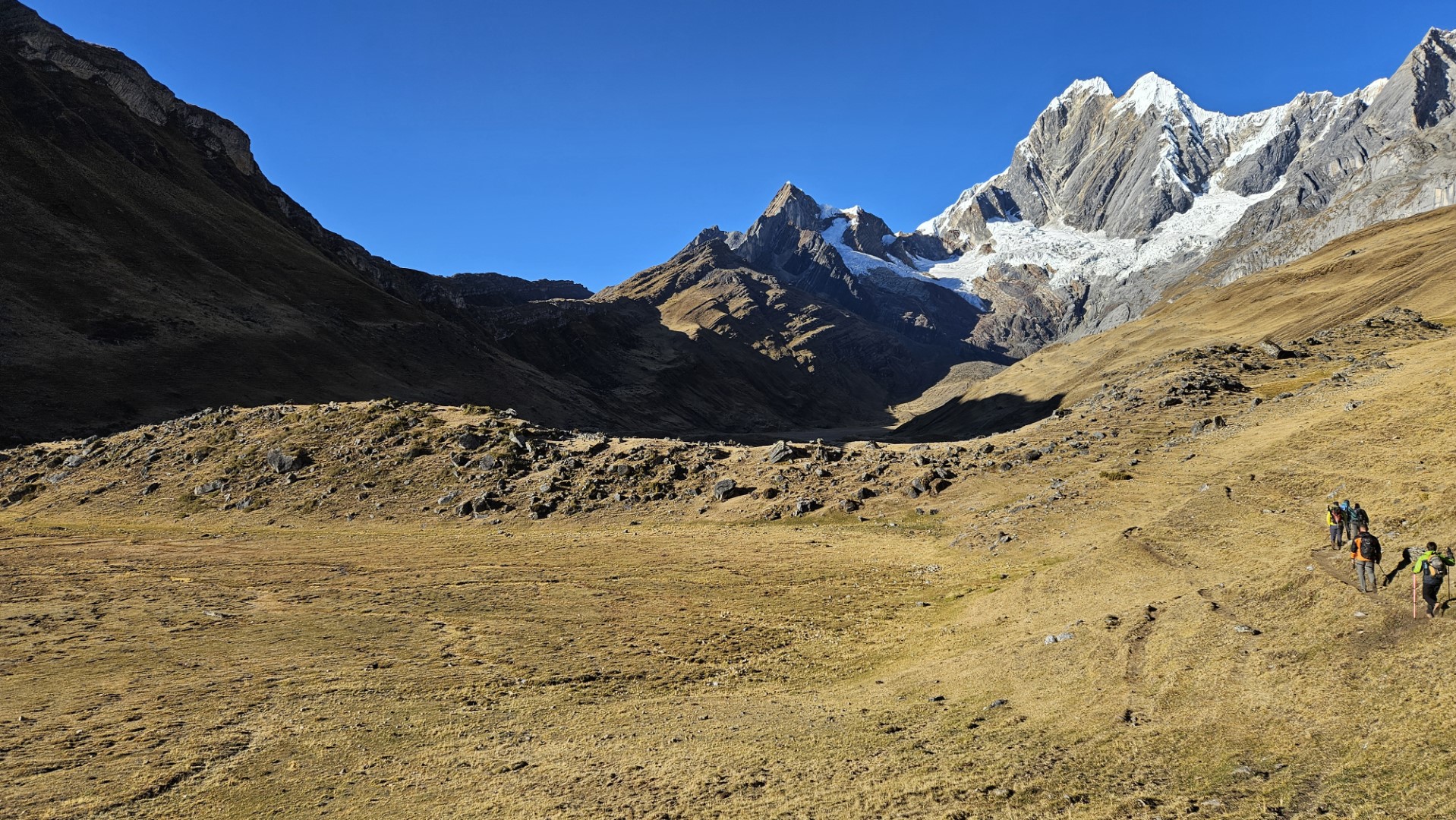 El trayecto nos llevó al Paso Punta Carhuac, situado a 4650 metros sobre el nivel del mar. Desde allí, las vistas del macizo eran impresionantes; pudimos contemplar en todo su esplendor los picos Jirishanca (6094 m), Yerupajá Chico (6089 m), Yerupajá Grande (6635 m) y el majestuoso Siulá Grande (6344 m).