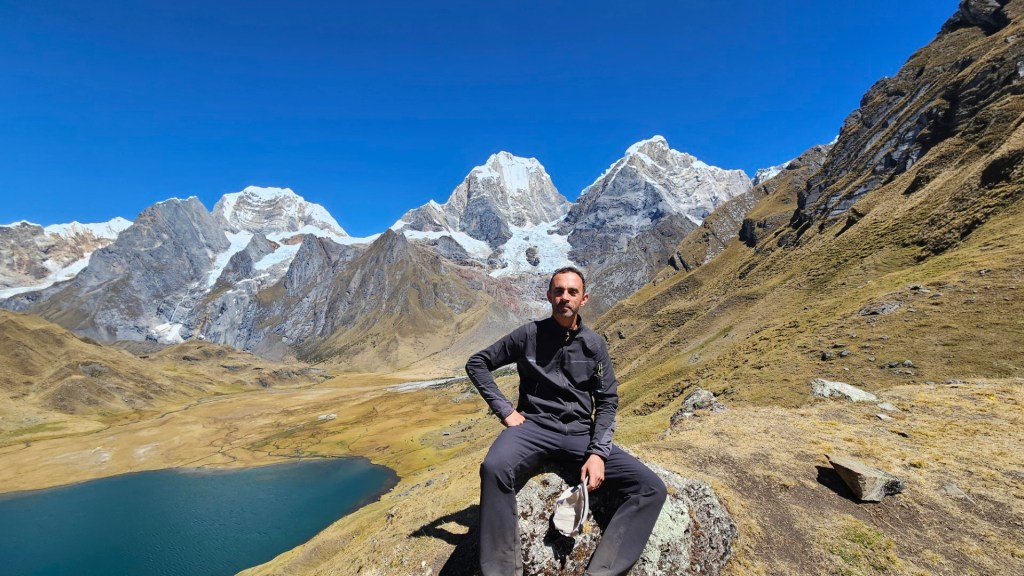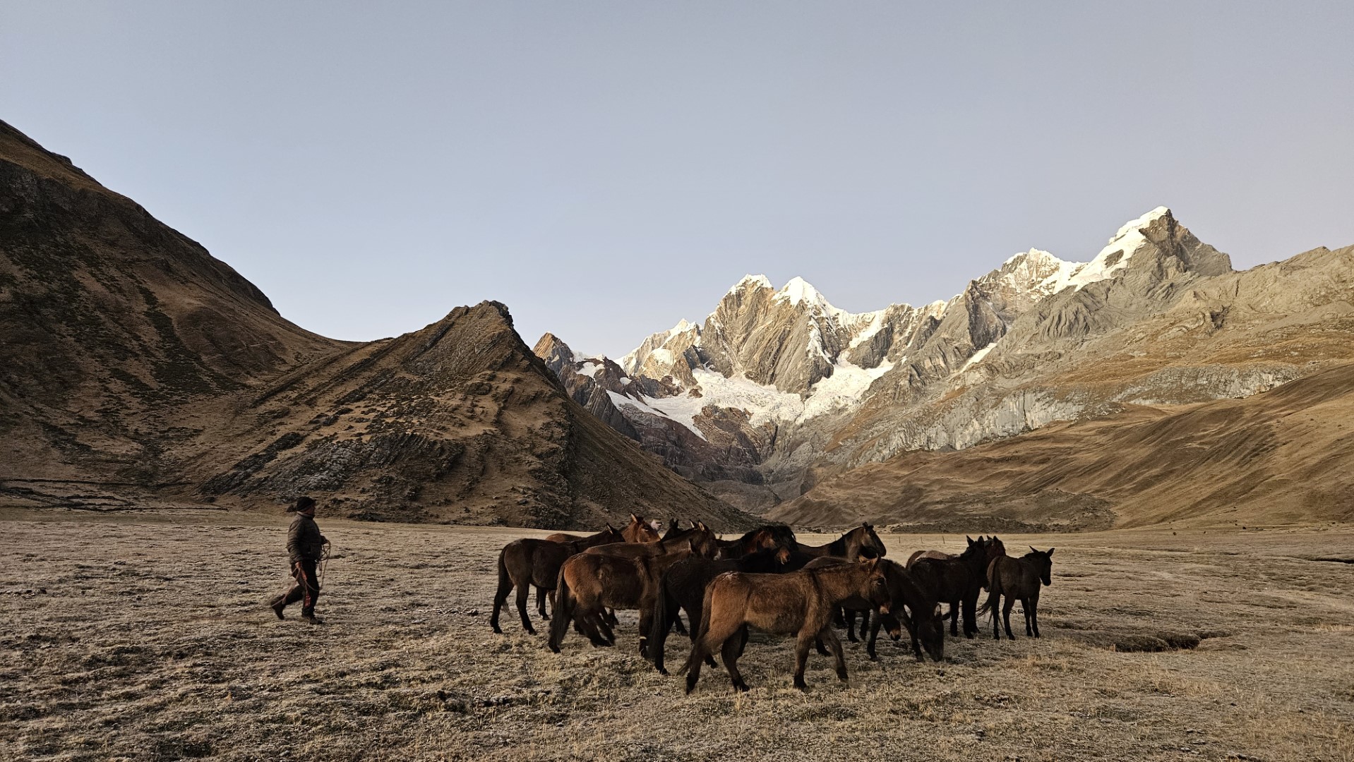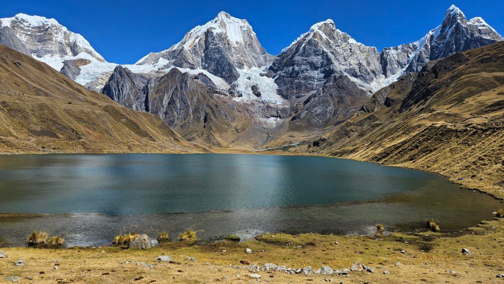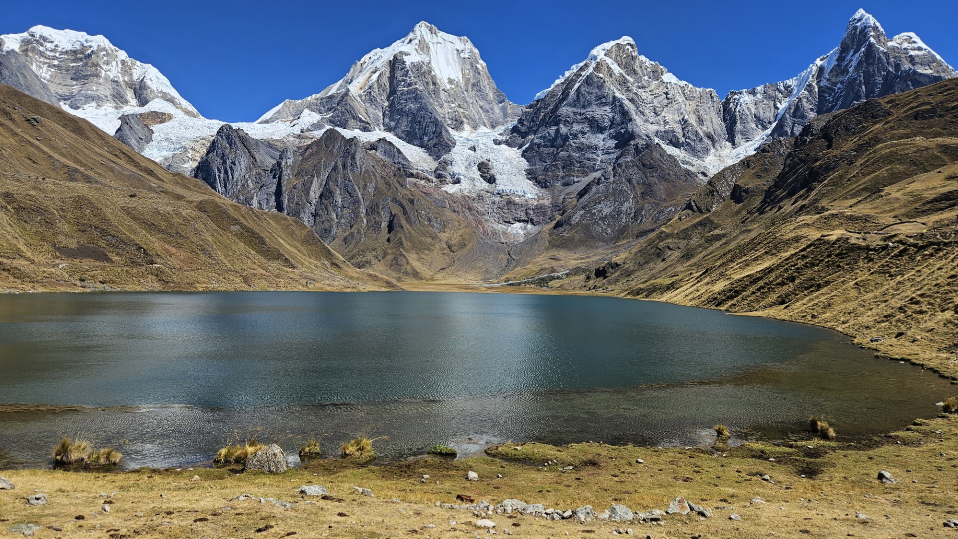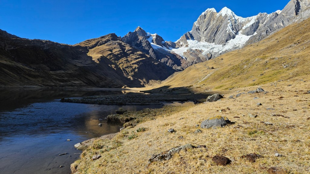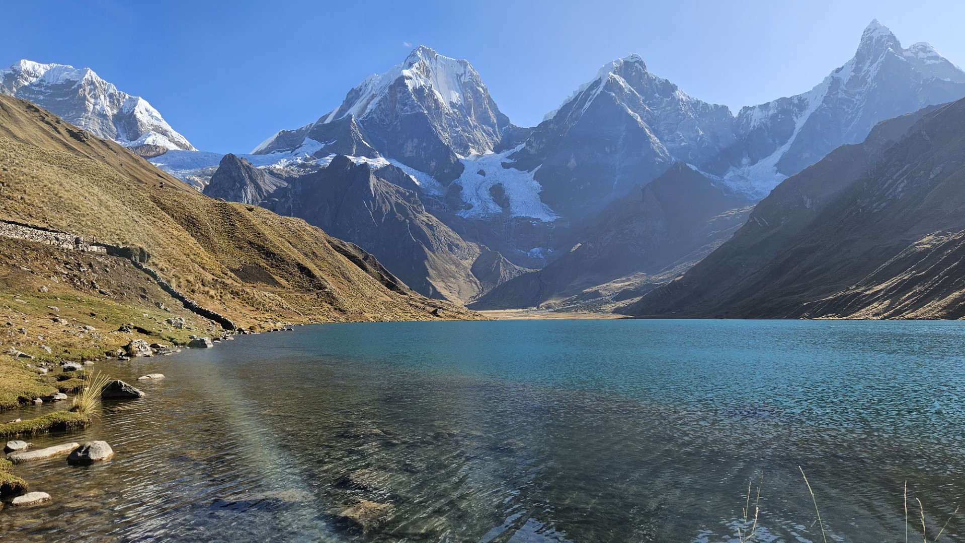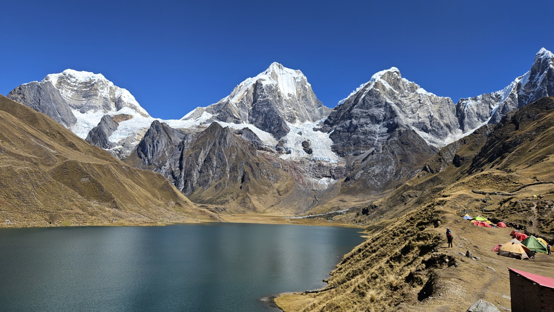 El trayecto nos llevó al Paso Punta Carhuac, situado a 4650 metros sobre el nivel del mar. Desde allí, las vistas del macizo eran impresionantes; pudimos contemplar en todo su esplendor los picos Jirishanca (6094 m), Yerupajá Chico (6089 m), Yerupajá Grande (6635 m) y el majestuoso Siulá Grande (6344 m).