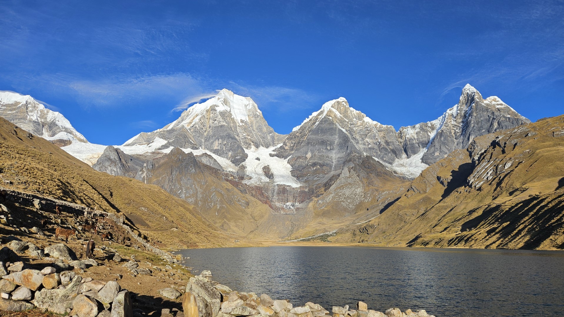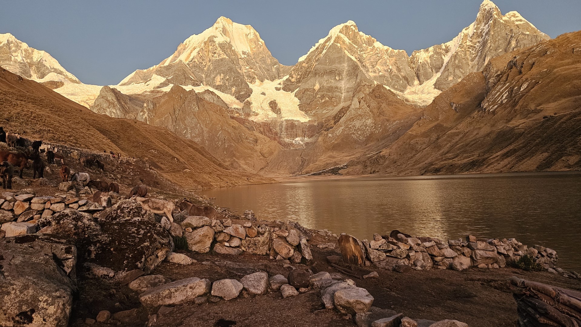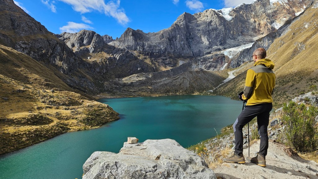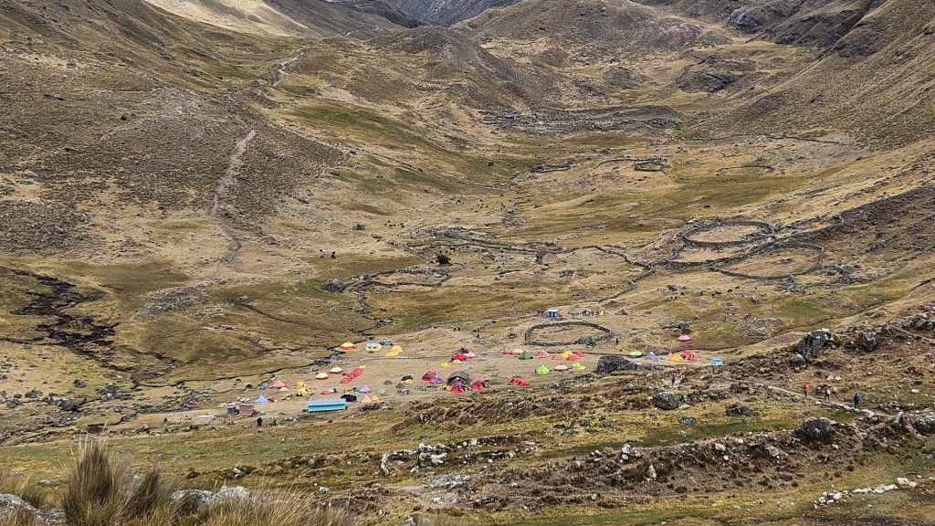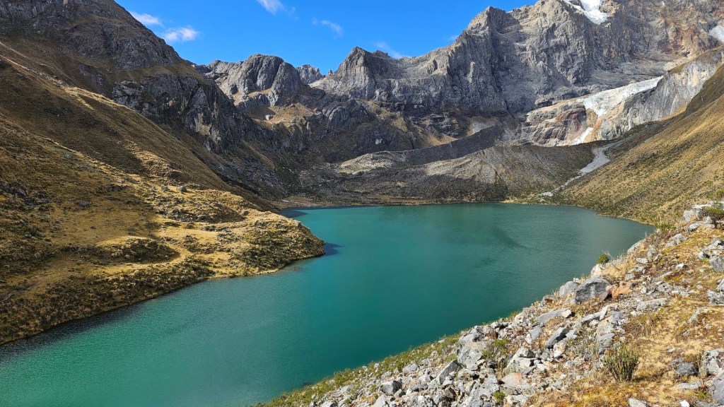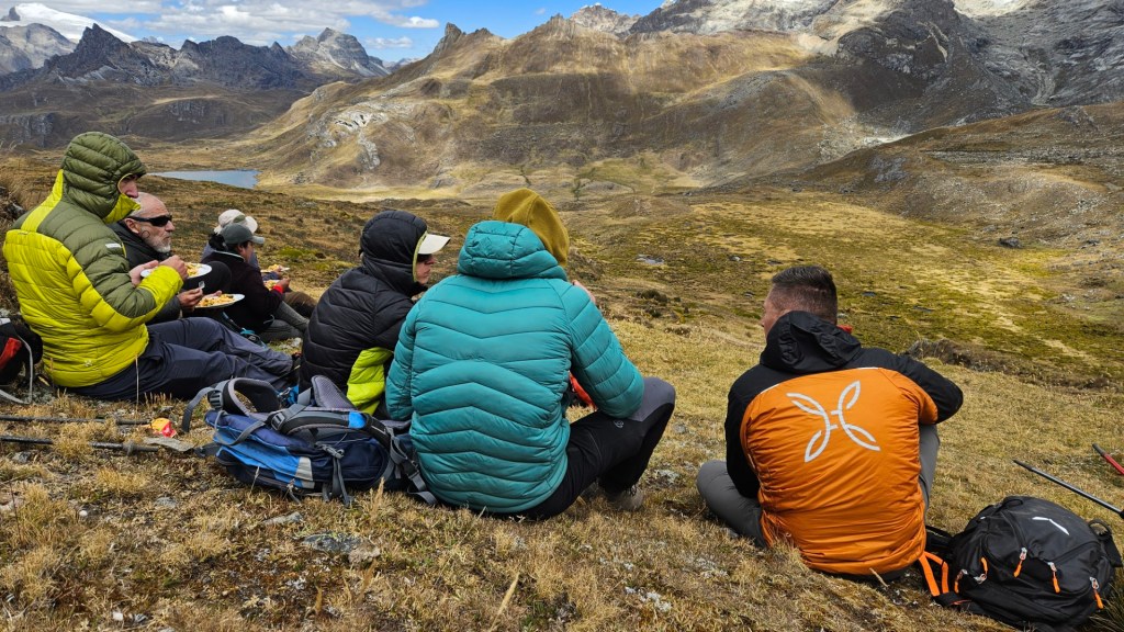 Después de disfrutar de un desayuno reparador, recogemos nuestras pertenencias y emprendemos la marcha hacia nuestro nuevo destino: el Campamento Huayhuash, que lleva el mismo nombre que el imponente macizo. A medida que nos alejamos del campamento inicial, las vistas se tornan aún más espectaculares. El amanecer sobre la laguna que dejamos atrás es de una belleza indescriptible, con las aguas reflejando las montañas que se elevan majestuosamente a su alrededor.
