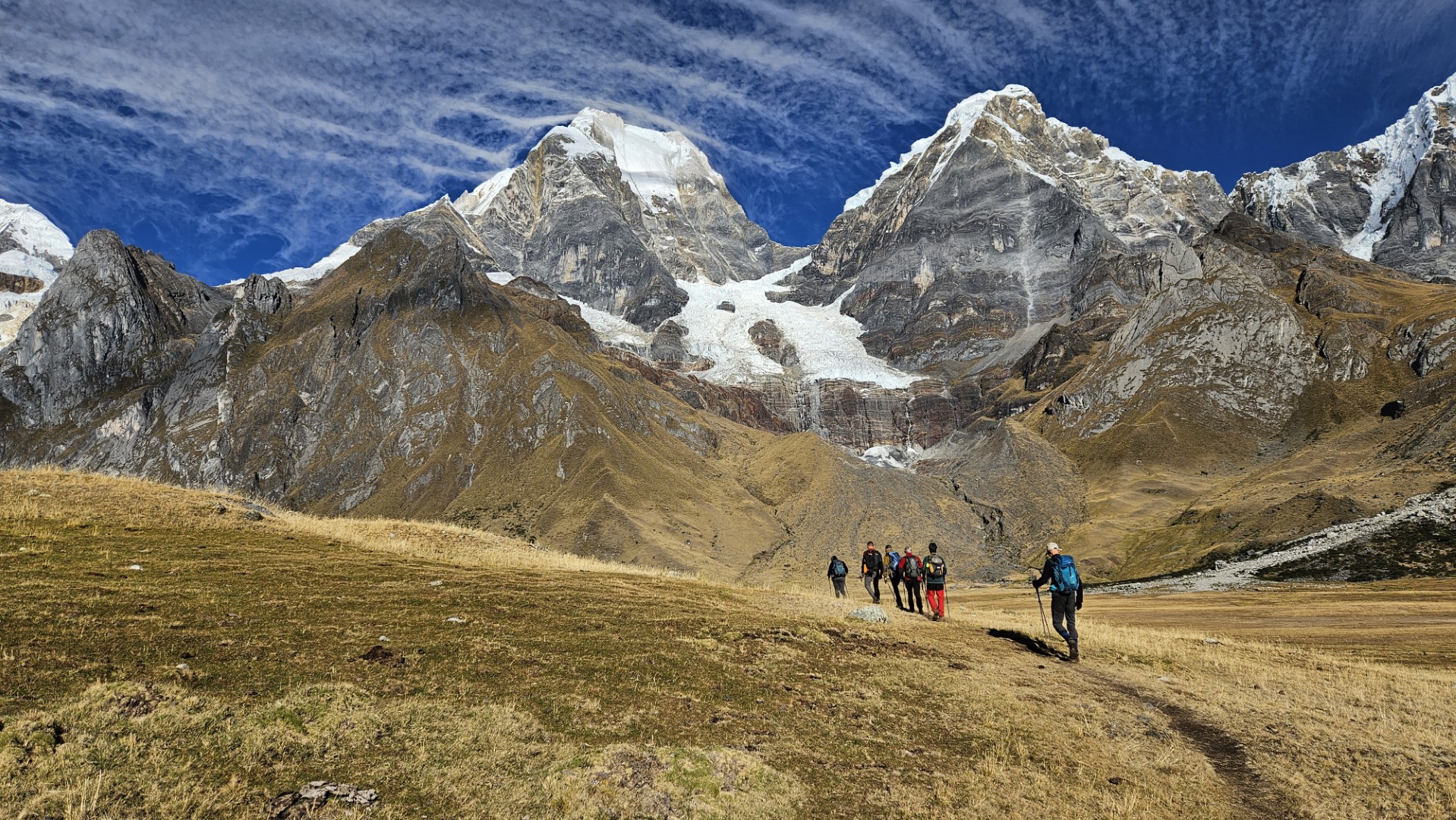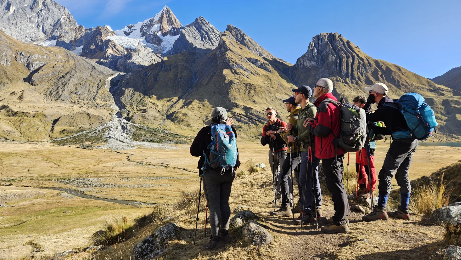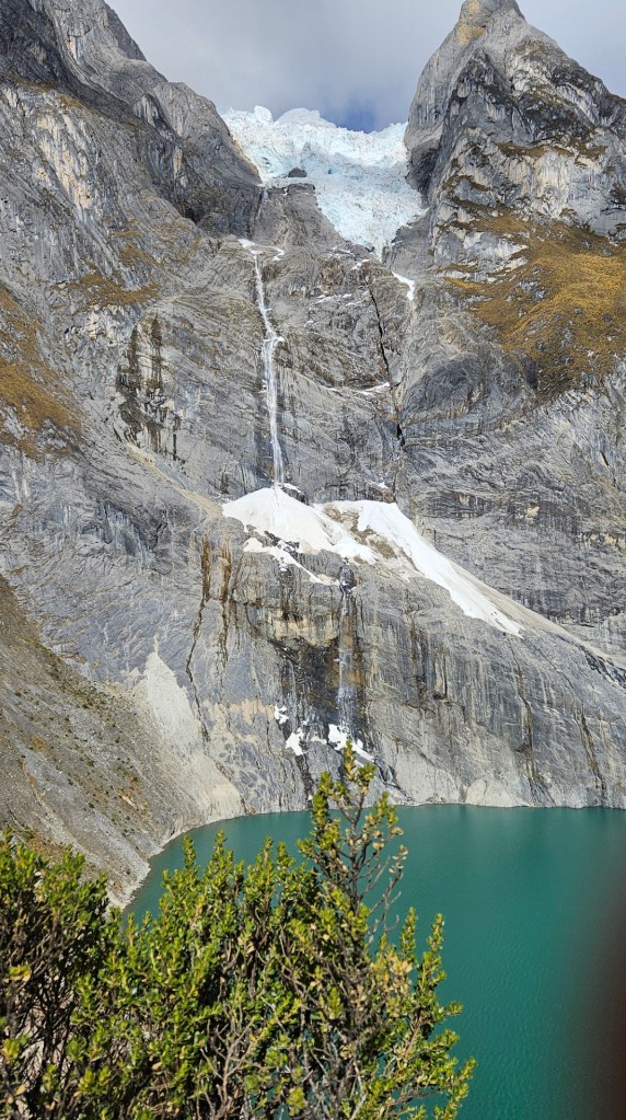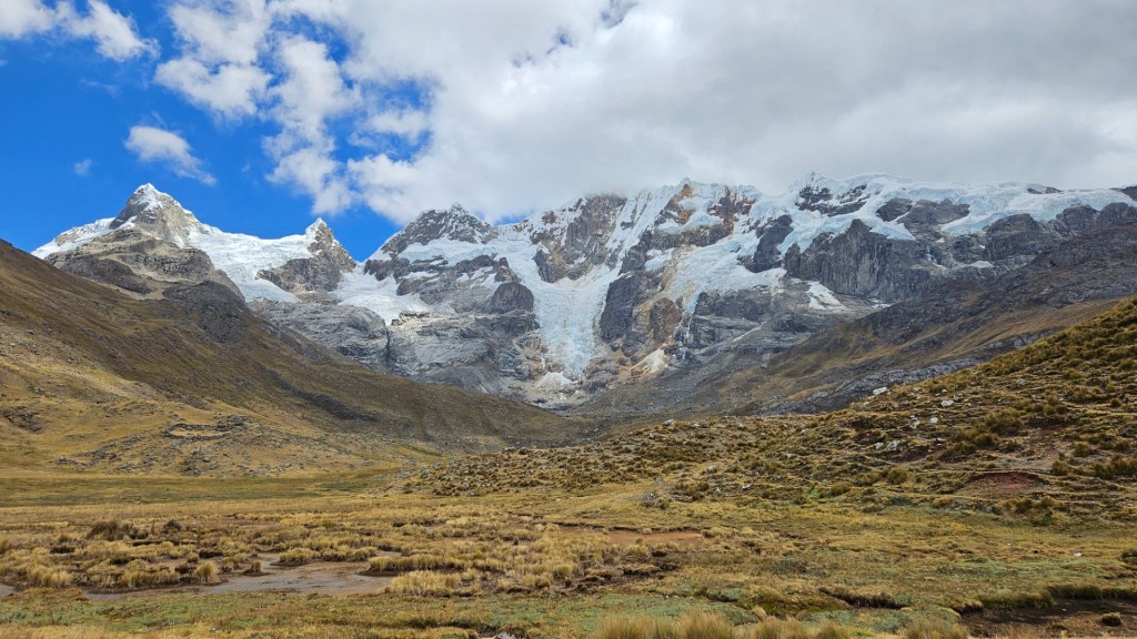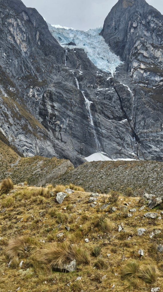 Durante el camino, Ruth nos anima a observar con tristeza cómo los glaciares han retrocedido considerablemente en los últimos años. Es un recordatorio tangible del impacto del cambio climático en estas zonas montañosas. El retroceso de los glaciares es un fenómeno alarmante que hemos observado de cerca durante nuestros pocos días de travesía por la Cordillera Huayhuash, donde los glaciares que antes cubrían extensas áreas de las montañas han ido disminuyendo drásticamente en los últimos años, dejando a su paso un paisaje marcado por el cambio climático.