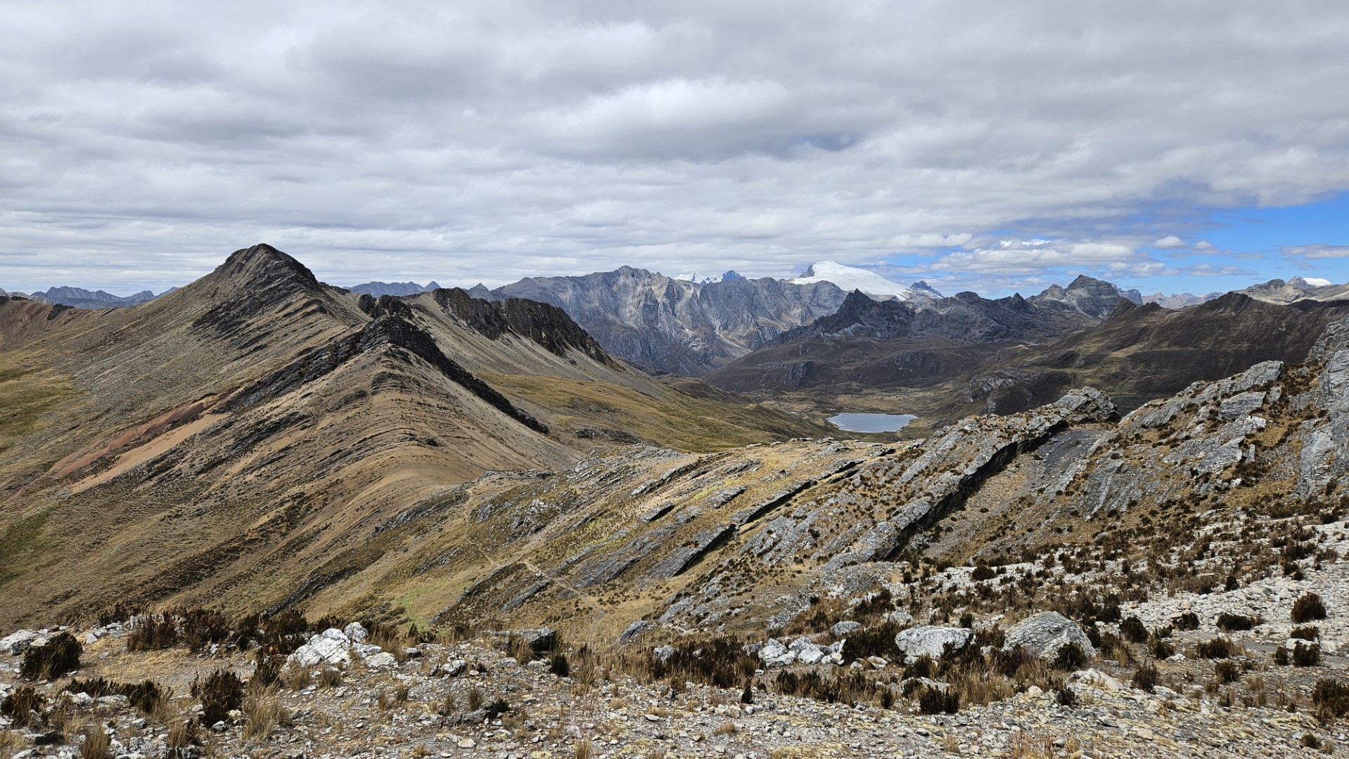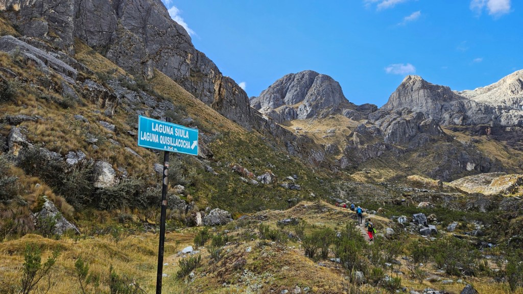 Continuamos nuestro ascenso hacia el Paso Siula, un reto muy exigente que nos llevará a alcanzar los 4800 metros de altitud. La caminata es intensa, y practicamente nos quedamos sin aire a medida que subimos. Sin embargo, el esfuerzo vale la pena cuando finalmente llegamos al mirador de Paso Siulá. Desde allí, la vista es simplemente espectacular: tres lagunas, Gangaracocha, Quesillococha y Siula, se extienden como joyas entre las montañas.