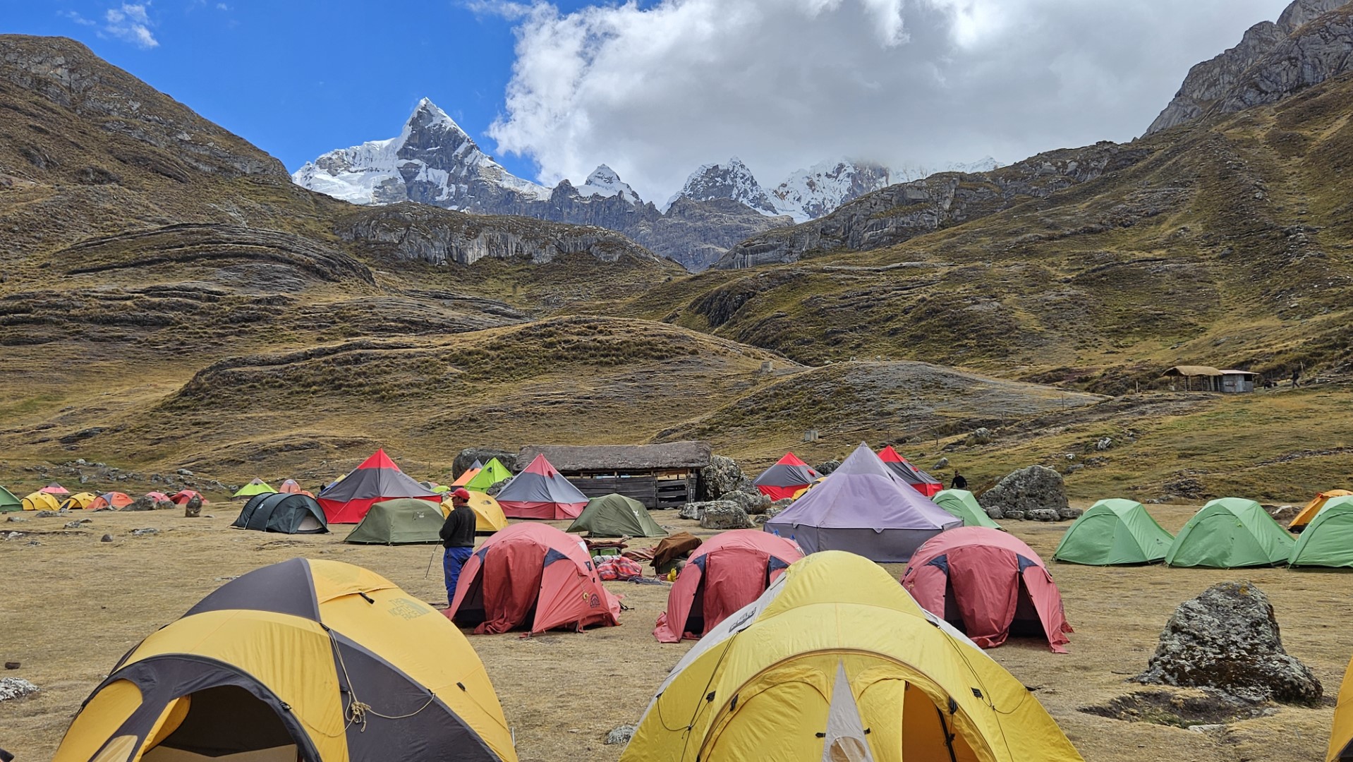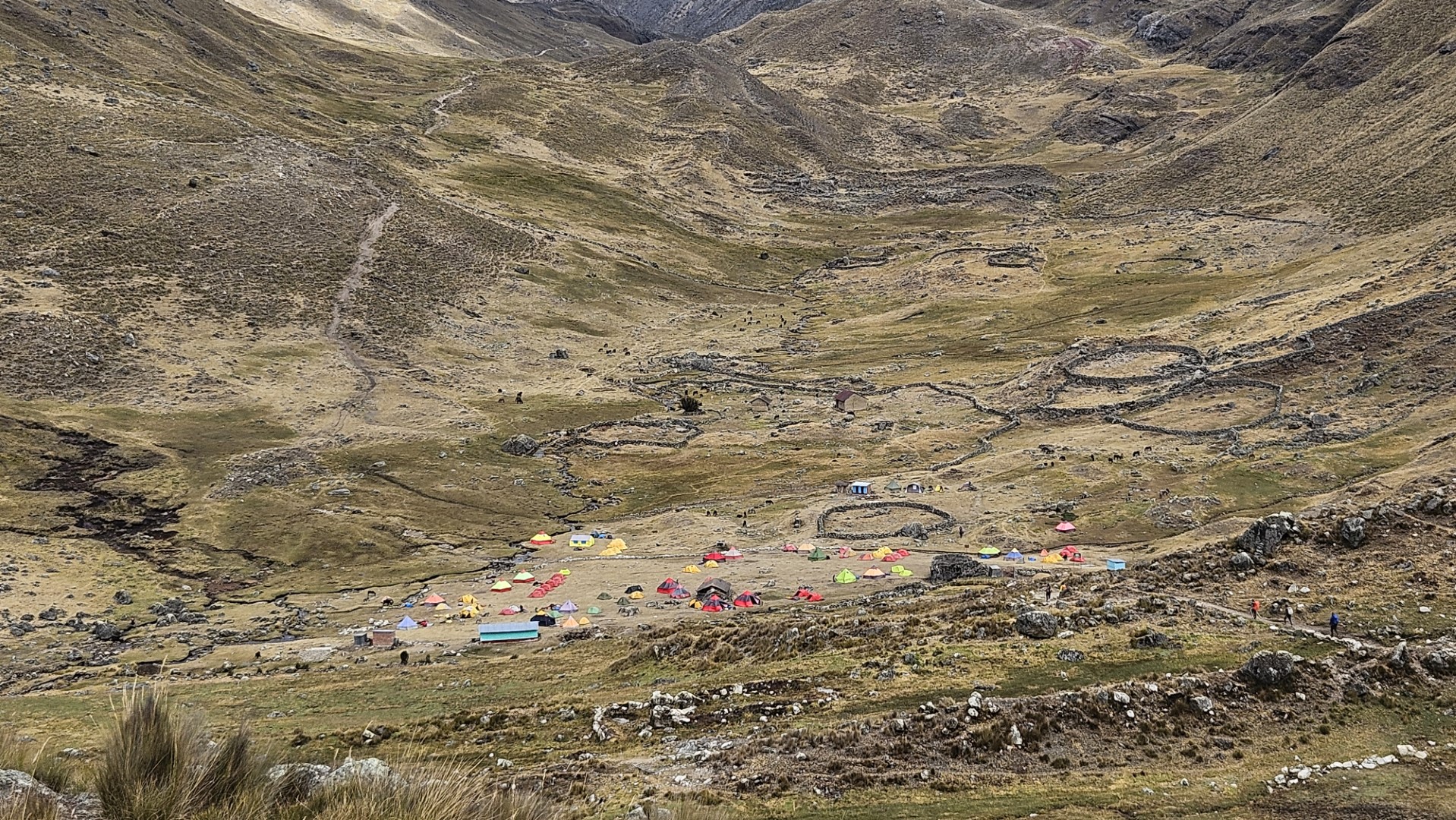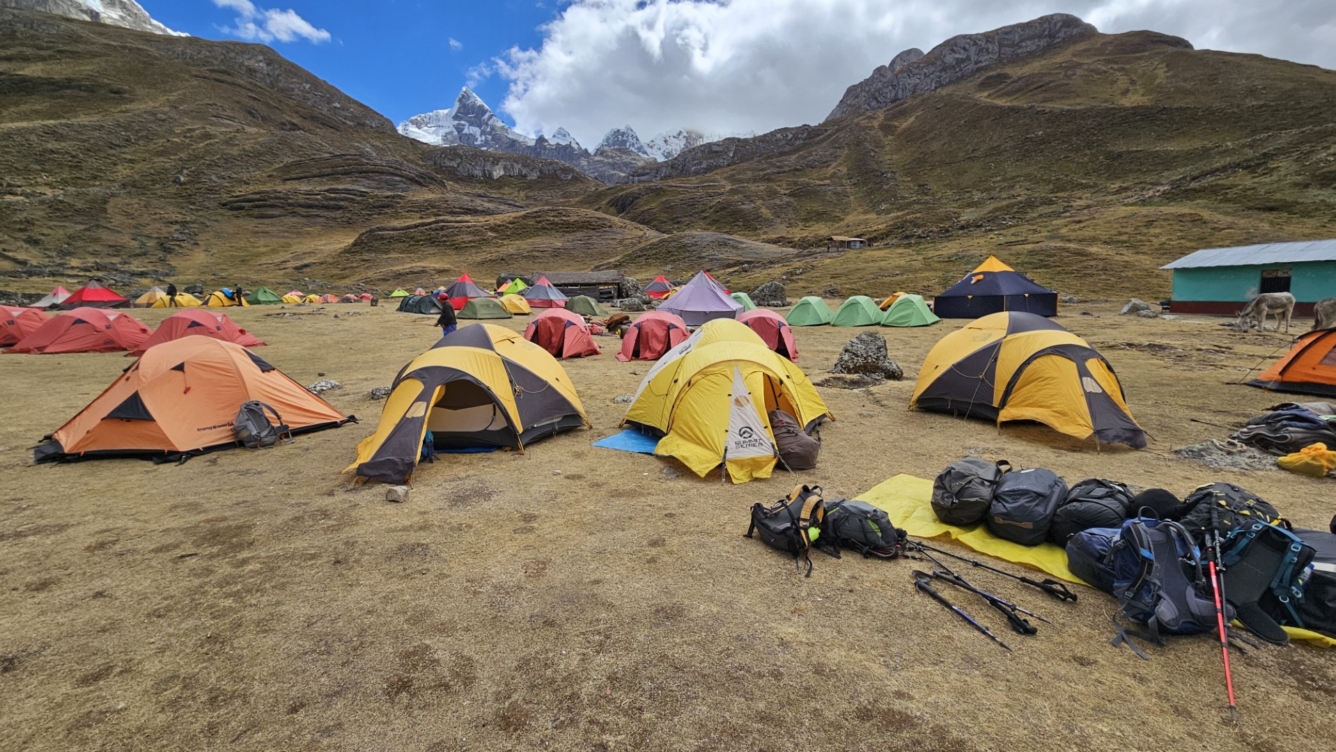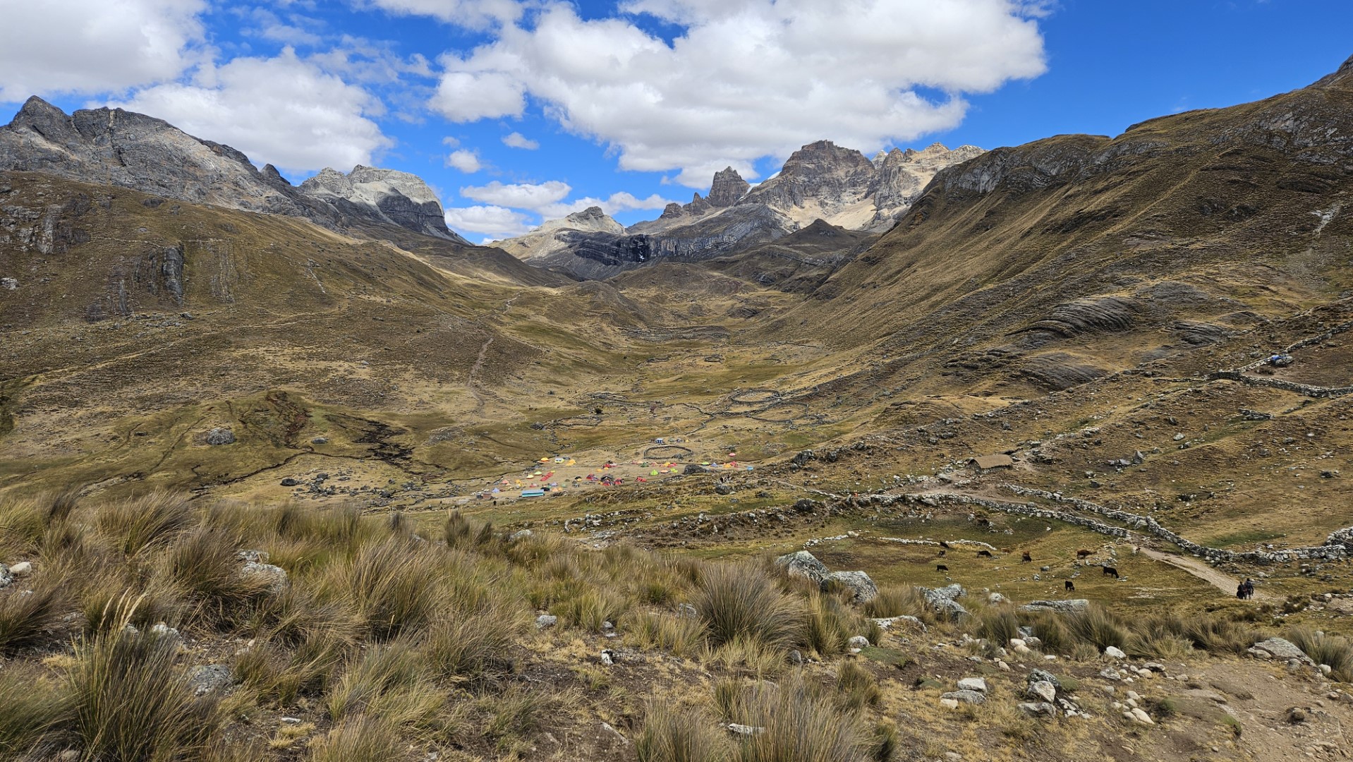 La bajada hacia el campamento Huayhuash, ubicado a 4300 metros sobre el nivel del mar, es relativamente cómoda y nos permite relajarnos después del esfuerzo del día. Llegamos al campamento alrededor de las 14:30 horas, satisfechos y con tiempo para descansar un poco antes de nuestra rutina diaria de limpieza.