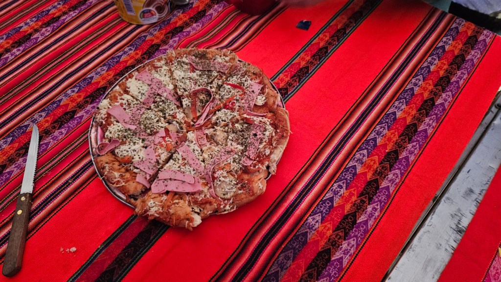 En medio de este paisaje remoto, disfrutar de una pizza recién horneada es todo un lujo, y nos hace sentir un poco más cerca de casa. Es una maravilla que todos disfrutamos con entusiasmo, y que cierra el día con una nota de calidez y satisfacción.