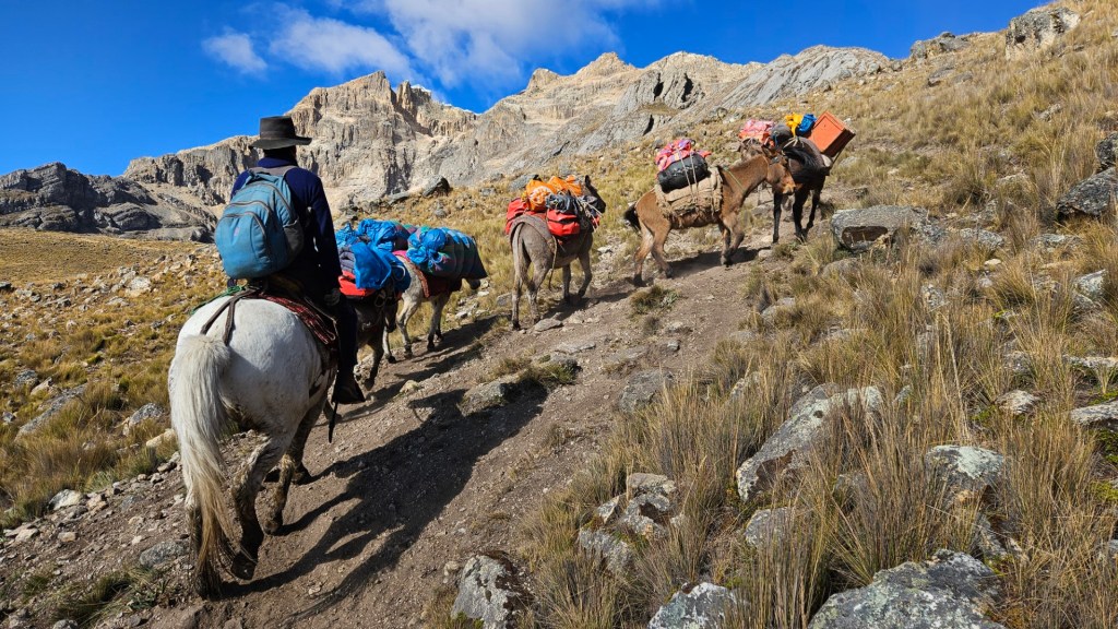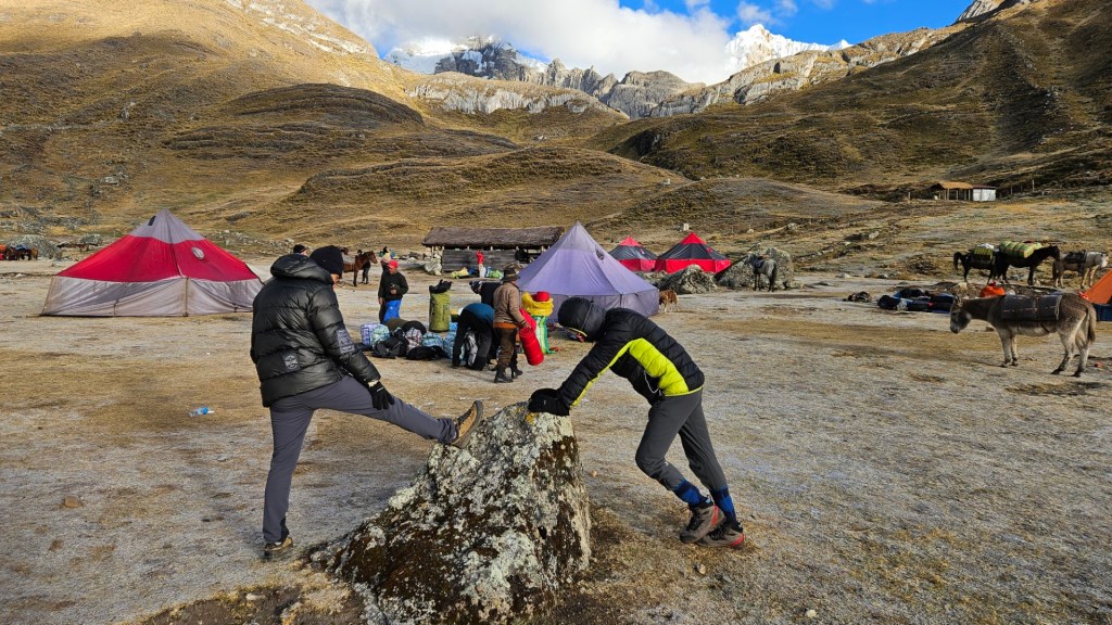 Rápida lavada de cara. La higiene diaria se está convirtiendo en un reto cada vez más difícil de gestionar. Aunque hacemos lo posible por mantener la dignidad, las condiciones no son fáciles. Después de ayudar a los muleros a recoger el campamento y realizar unos estiramientos, emprendimos la ascensión al Paso Trapecio.
