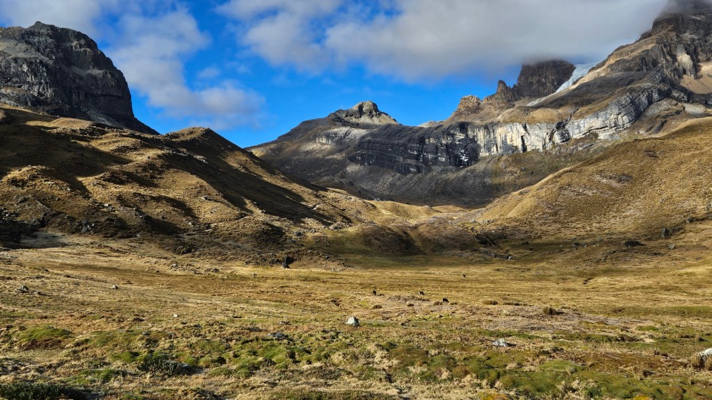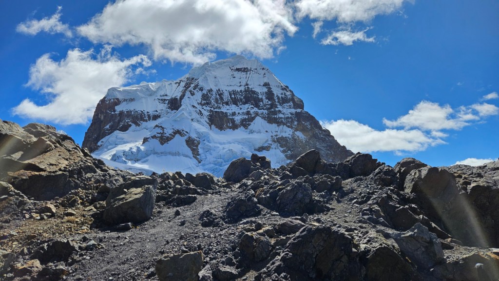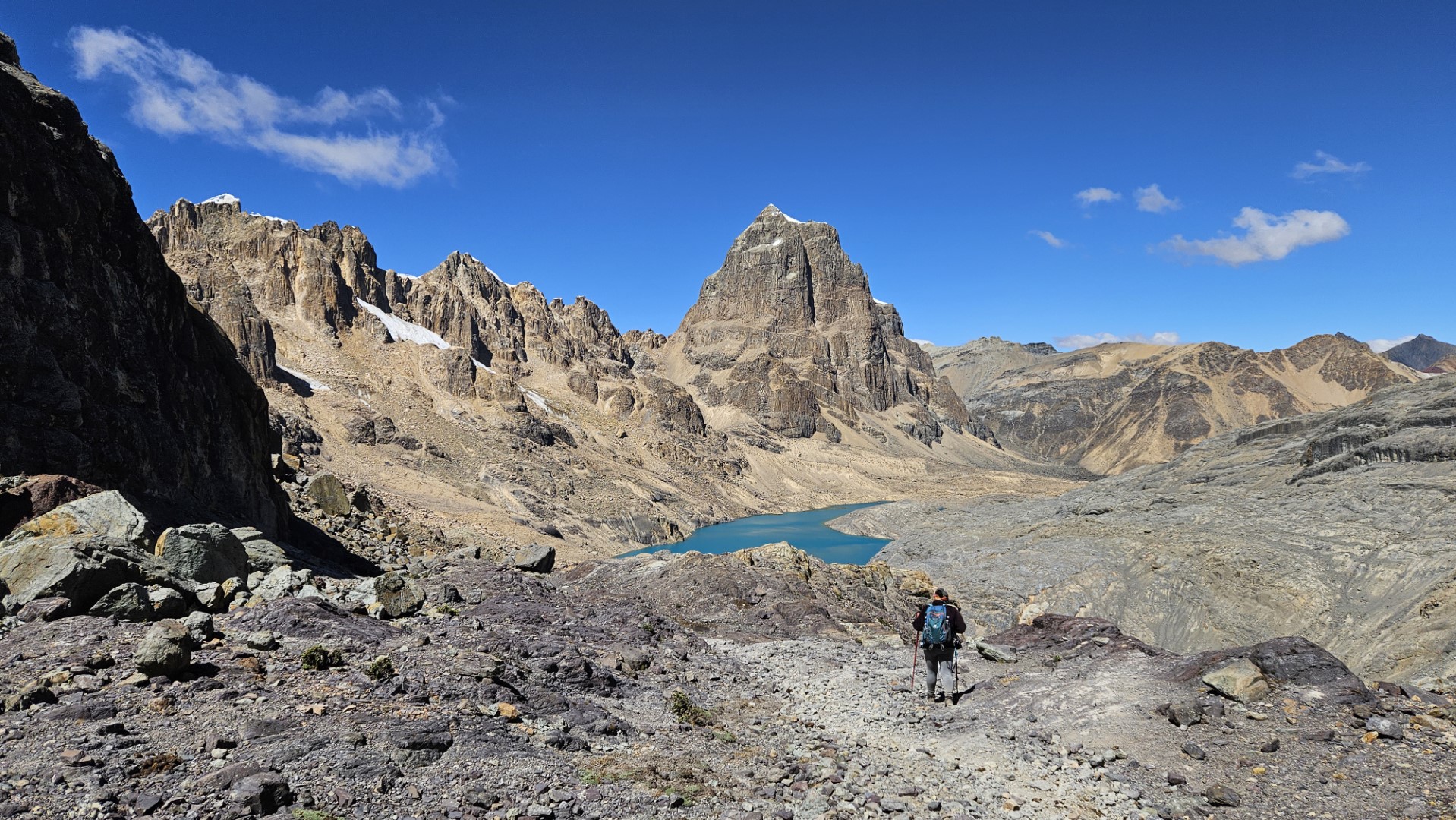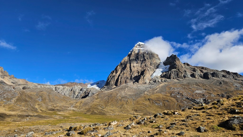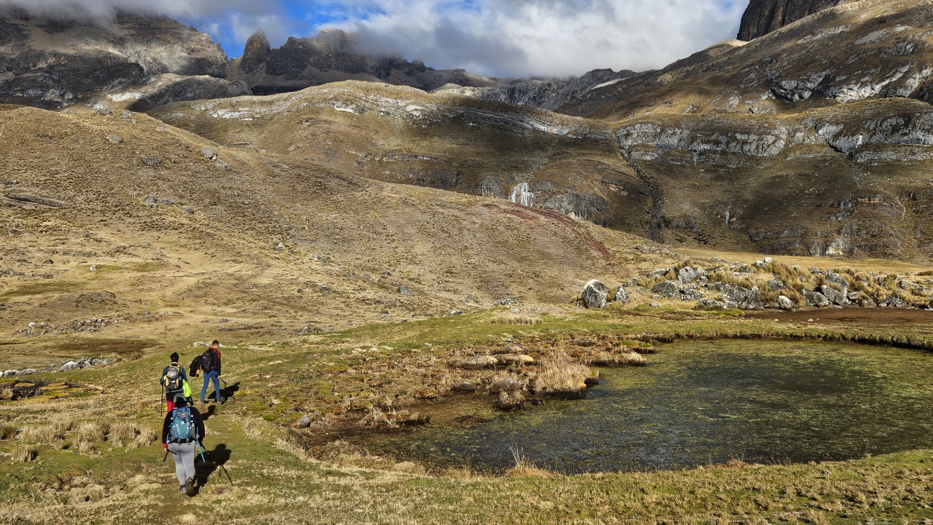 Después de un kilómetro de ascenso, el camino se bifurca: uno se dirige a los baños termales de Viconga, mientras nosotros nos preparábamos para atravesar el desafiante Paso Trapecio. La subida es bastante exigente, pero las vistas del Pico Trapecio (5633 m), el León Huacanan o Dormido (5420 m) y el Sueroraju (5442 m) compensaban con creces el esfuerzo.