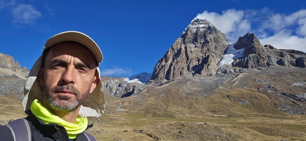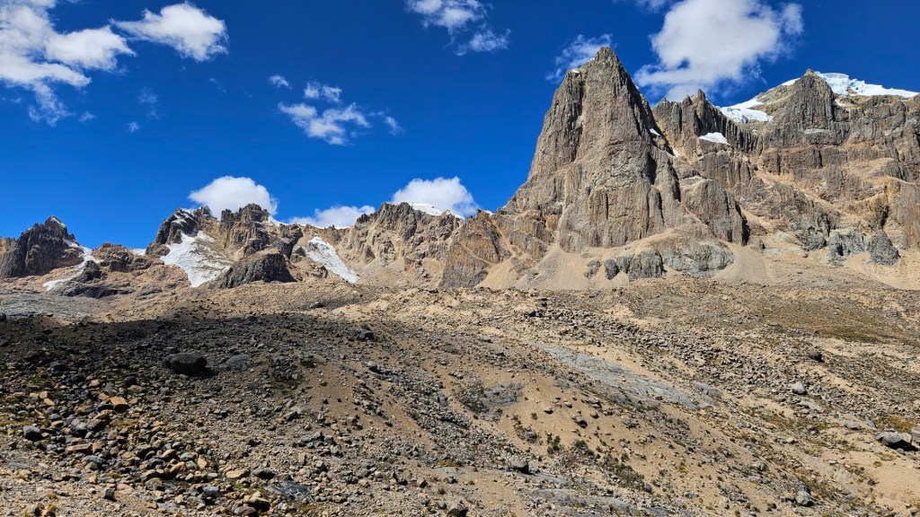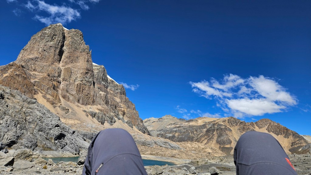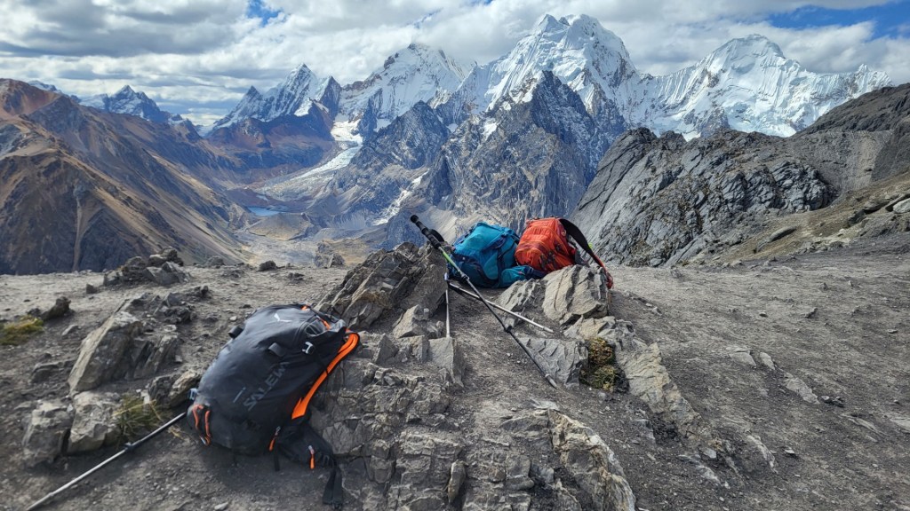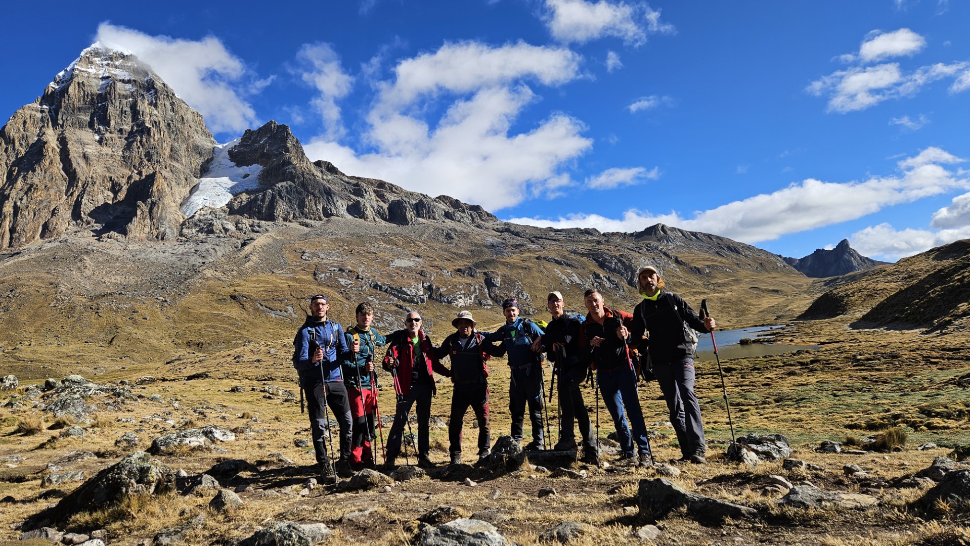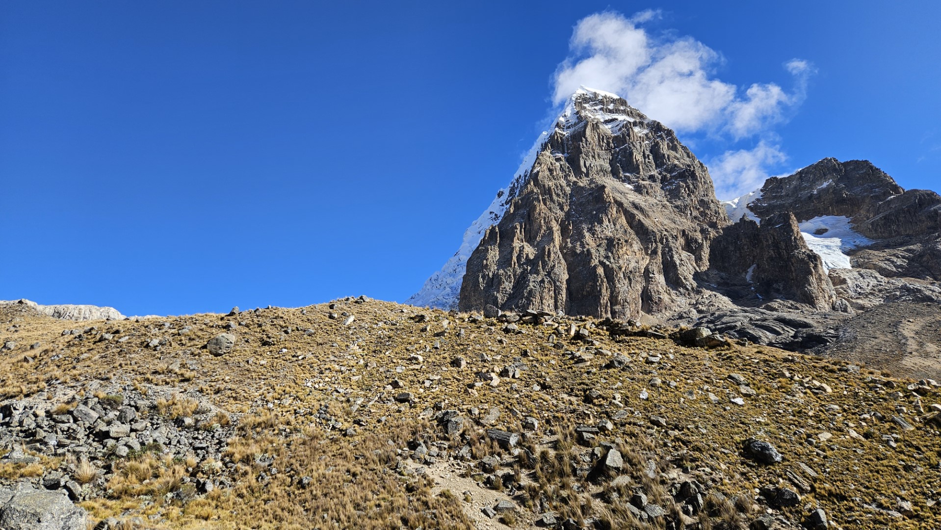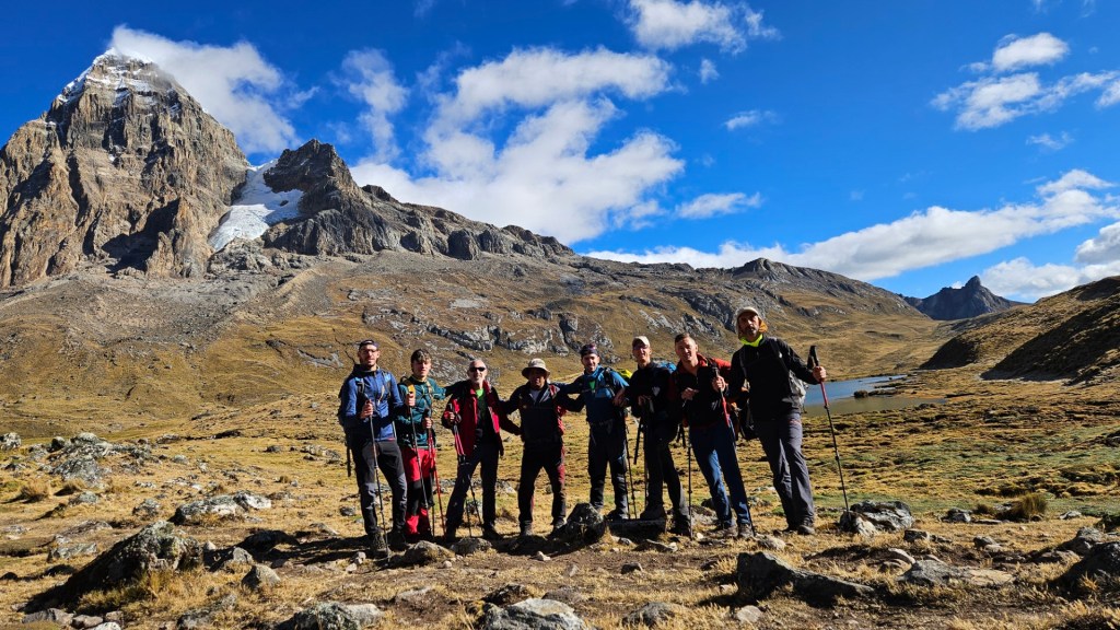 El día comienza con el Pico Trapecio, imponente y majestuoso a sus 5653 metros, emergiendo entre las nubes. Hoy atravesamos uno de los pasos más imponentes del macizo de Huayhuash: el Paso Trapecio. Aunque teníamos la opción de visitar la Laguna Viconga, famosa por sus baños termales, decidimos el reto de cruzar el Paso Trapecio, situado a más de 5030 metros de altitud. Un nuevo hito en nuestras ascensiones.