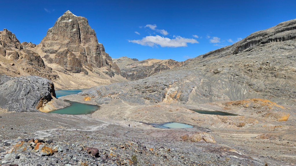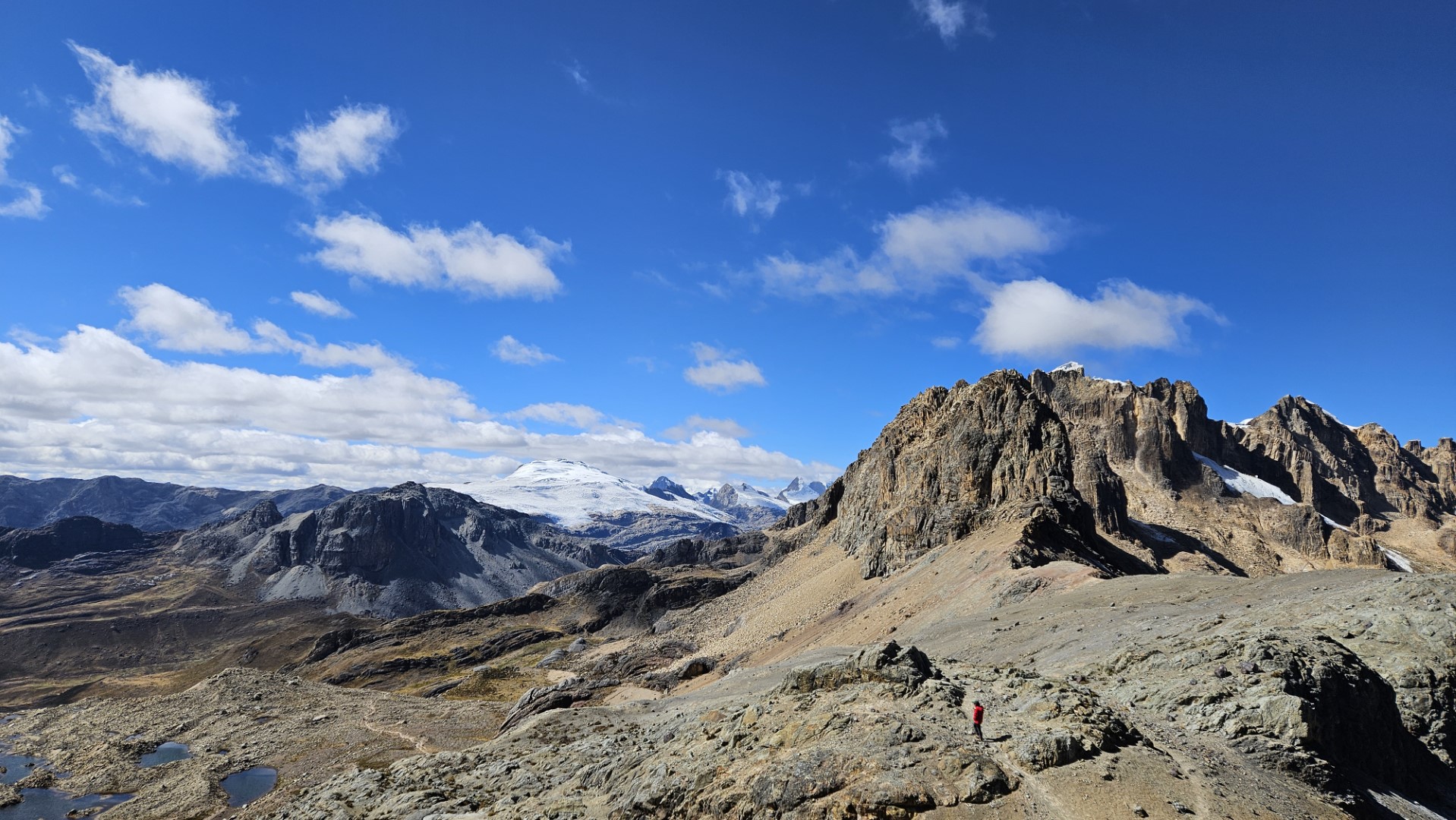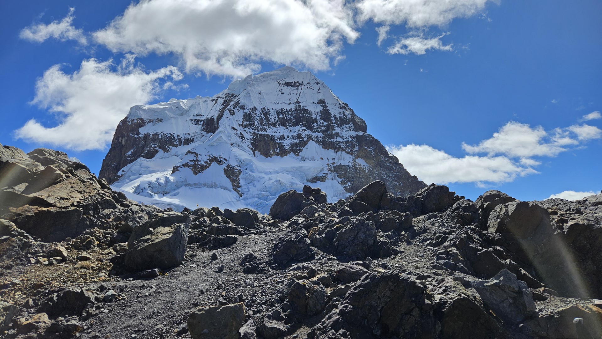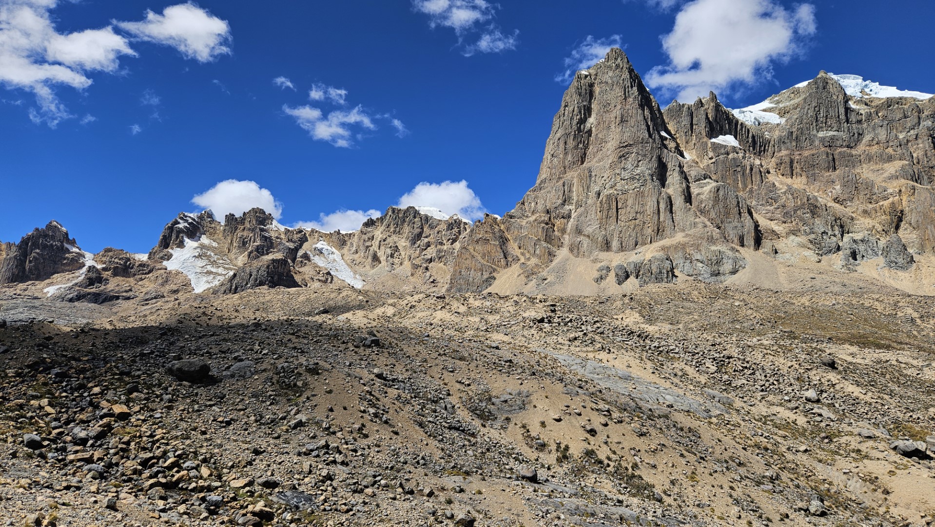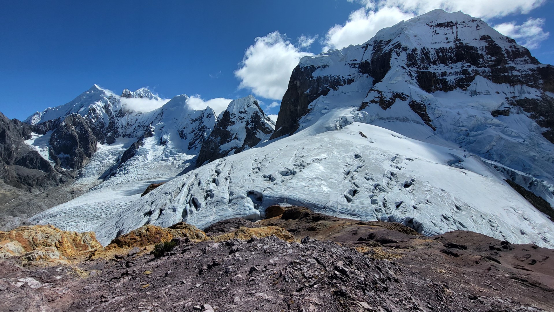 El día comienza con el Pico Trapecio, imponente y majestuoso a sus 5653 metros, emergiendo entre las nubes. Hoy atravesamos uno de los pasos más imponentes del macizo de Huayhuash: el Paso Trapecio. Aunque teníamos la opción de visitar la Laguna Viconga, famosa por sus baños termales, decidimos el reto de cruzar el Paso Trapecio, situado a más de 5030 metros de altitud. Un nuevo hito en nuestras ascensiones.