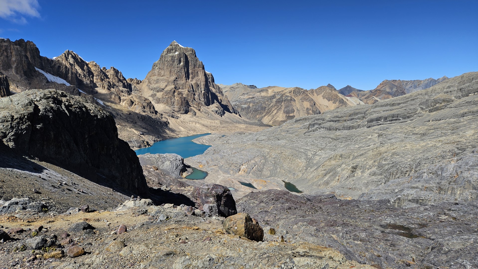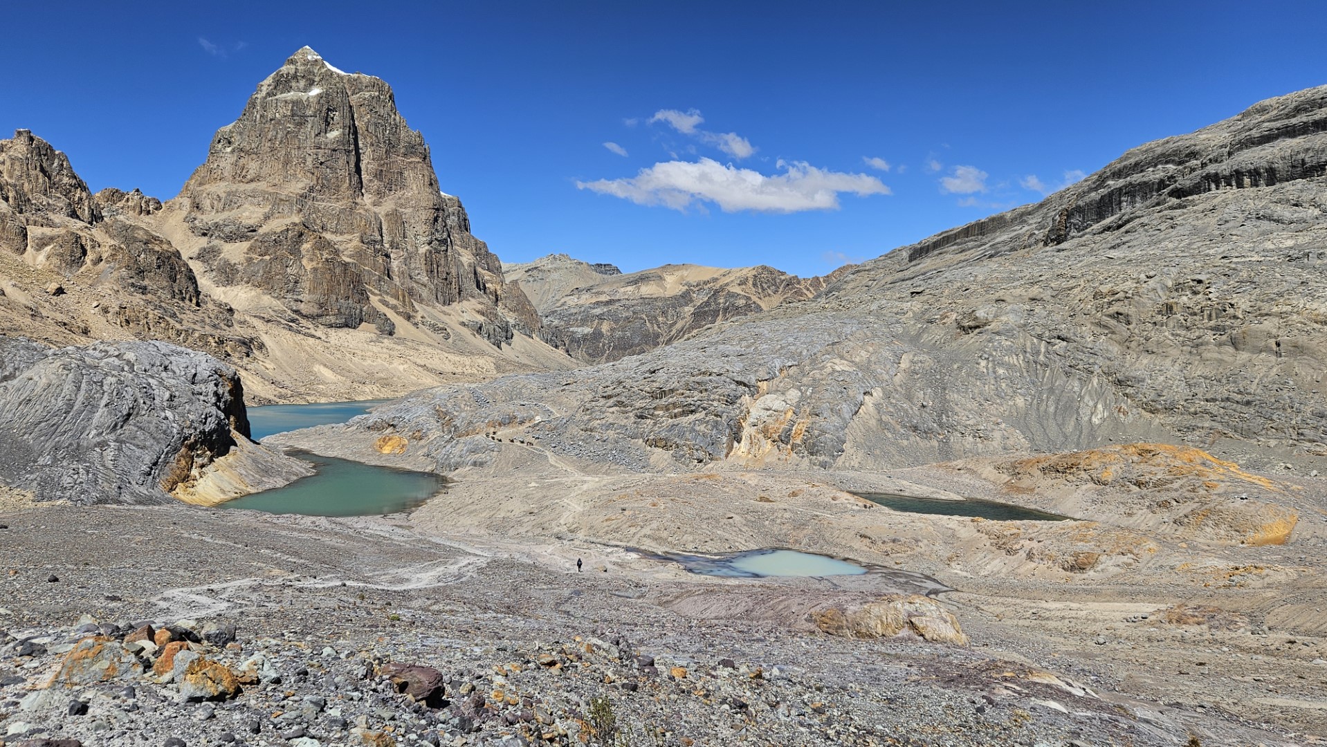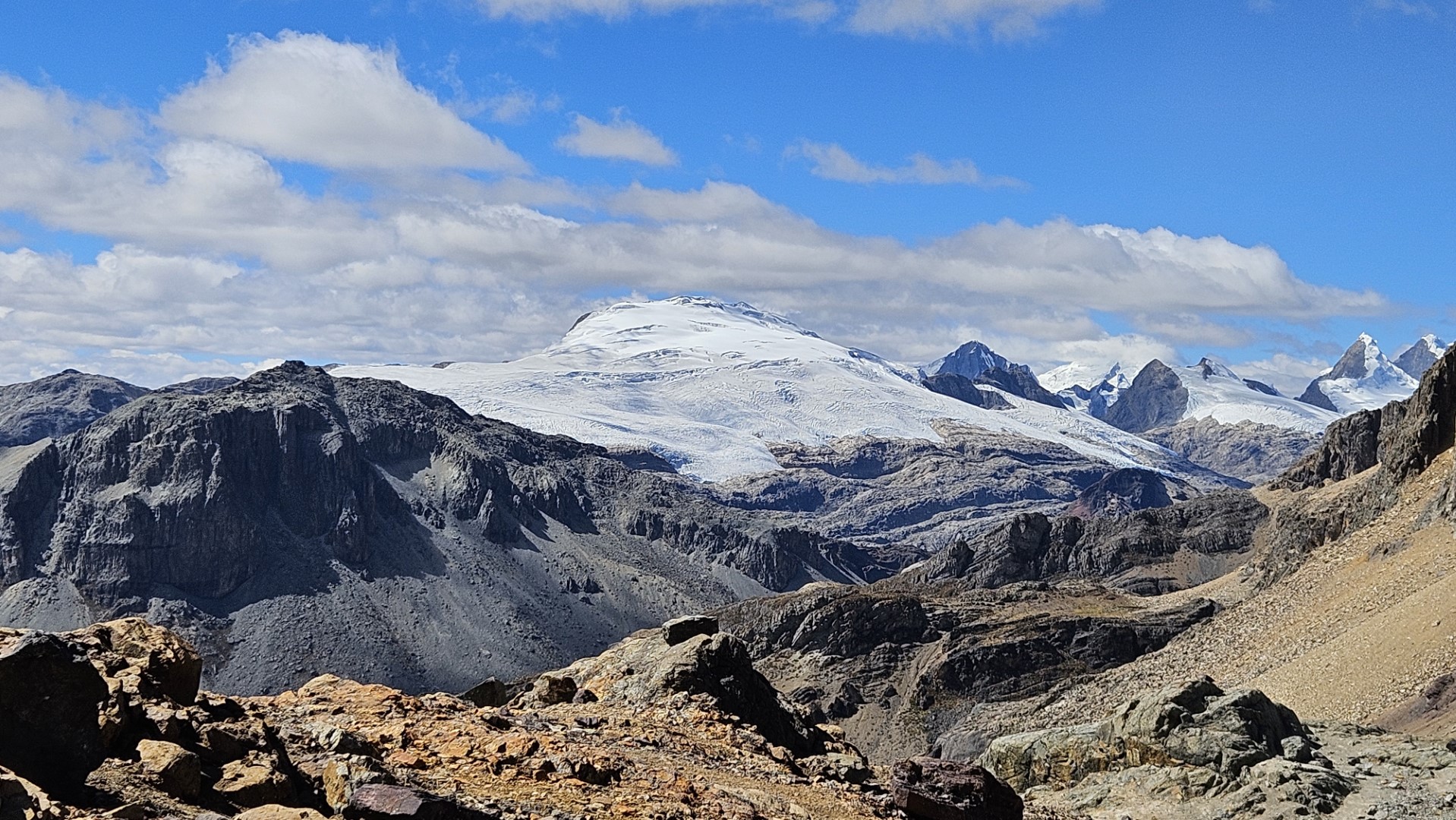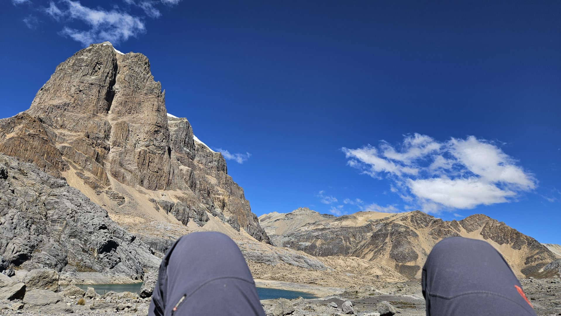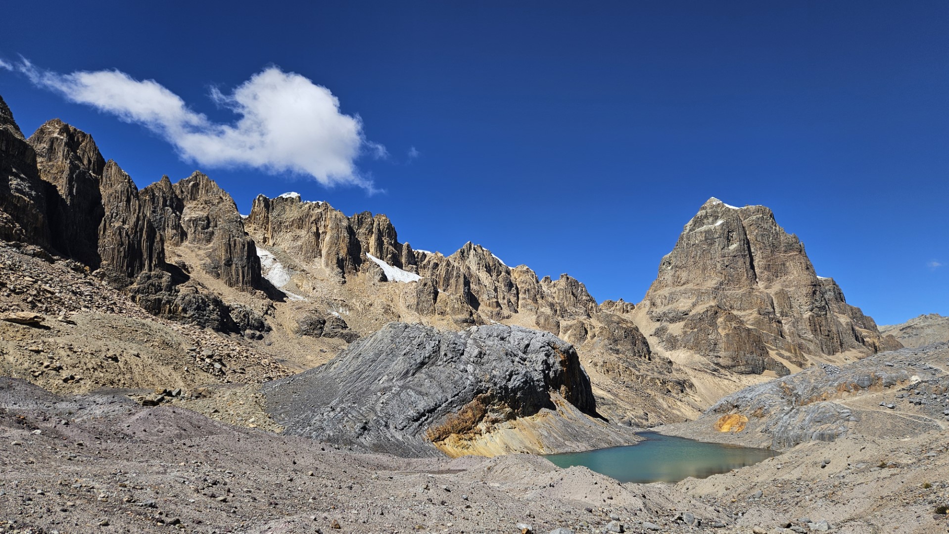 El día comienza con el Pico Trapecio, imponente y majestuoso a sus 5653 metros, emergiendo entre las nubes. Hoy atravesamos uno de los pasos más imponentes del macizo de Huayhuash: el Paso Trapecio. Aunque teníamos la opción de visitar la Laguna Viconga, famosa por sus baños termales, decidimos el reto de cruzar el Paso Trapecio, situado a más de 5030 metros de altitud. Un nuevo hito en nuestras ascensiones.