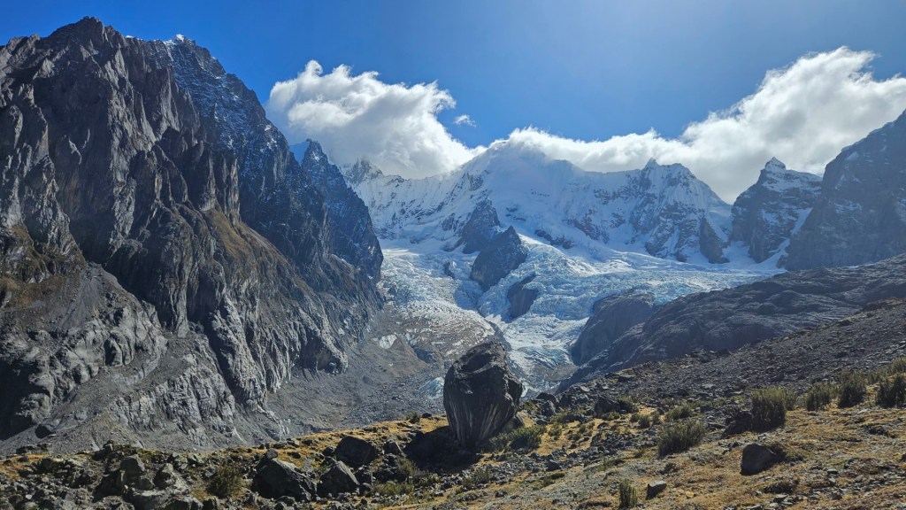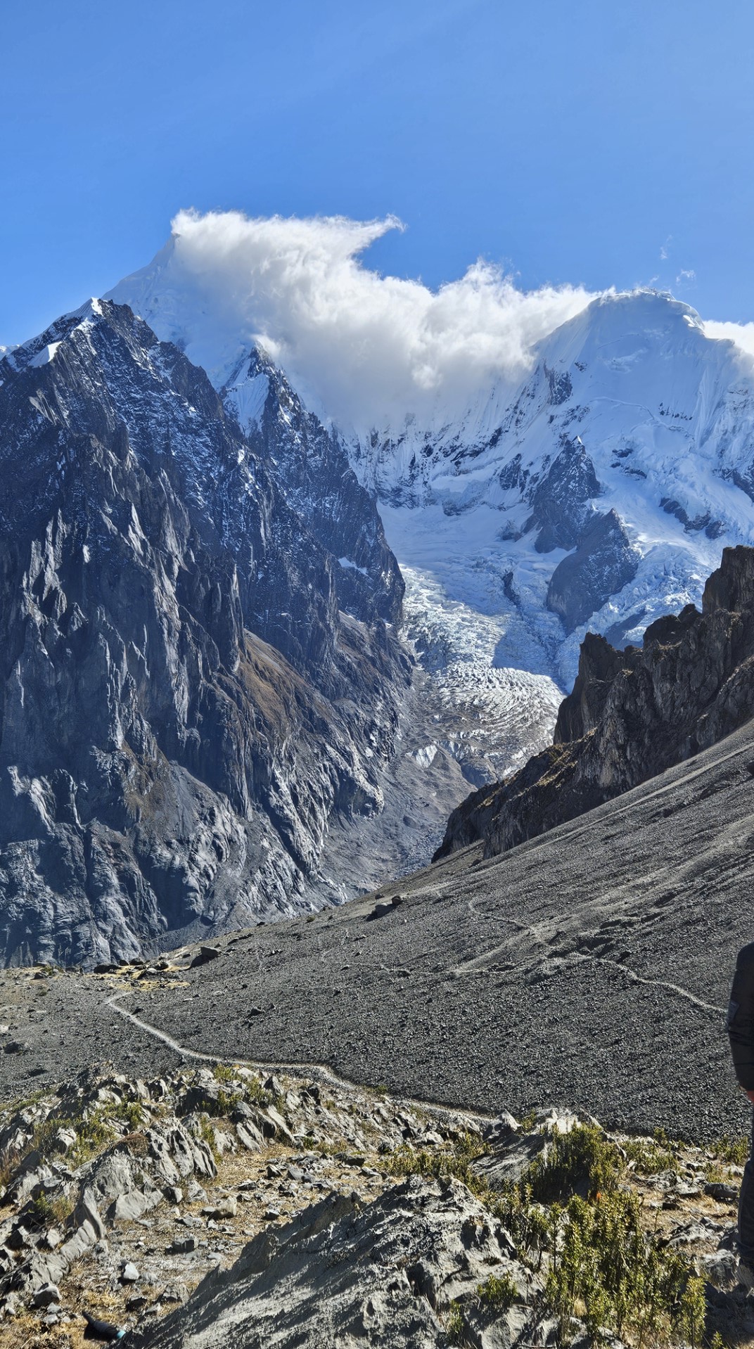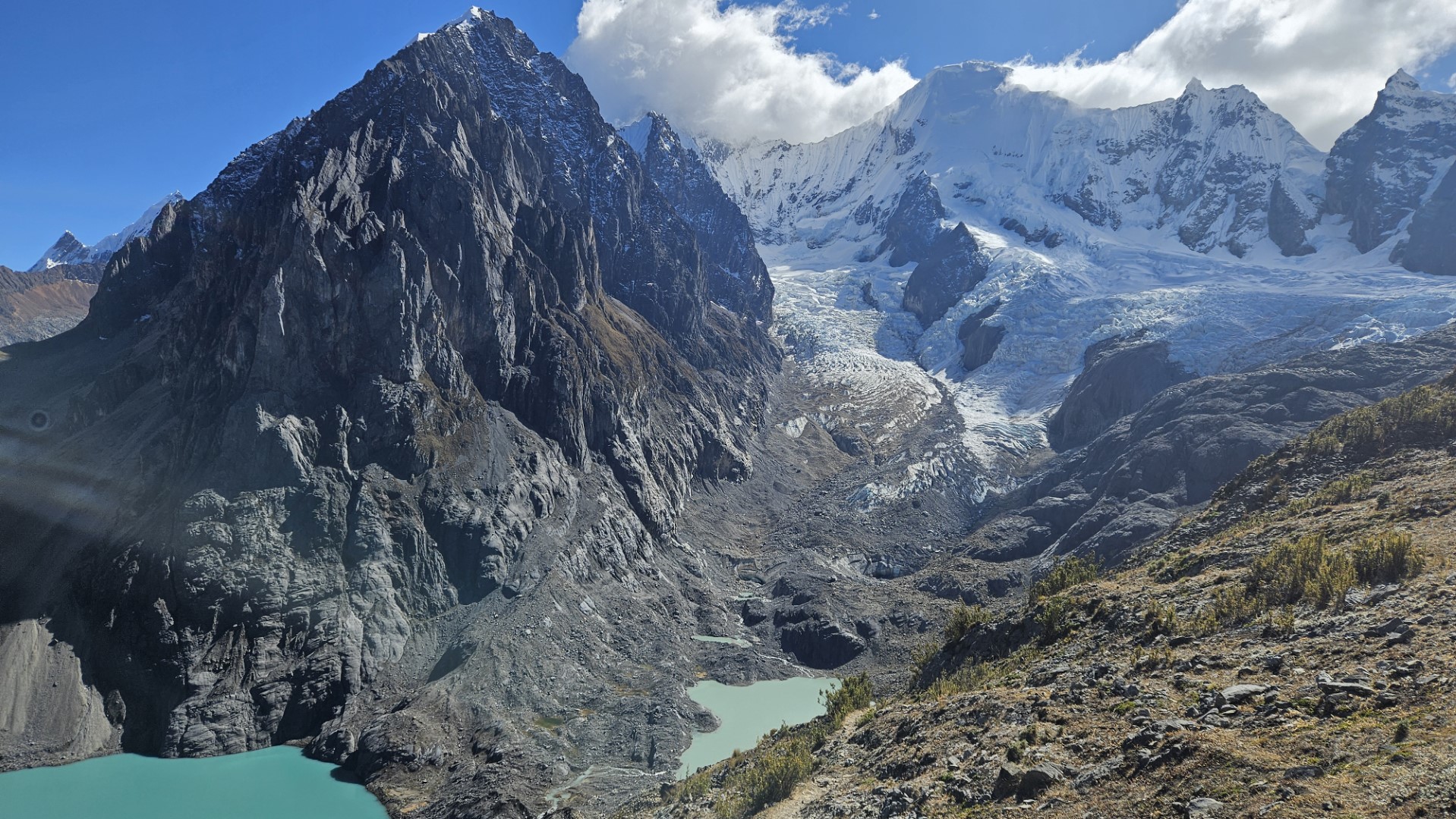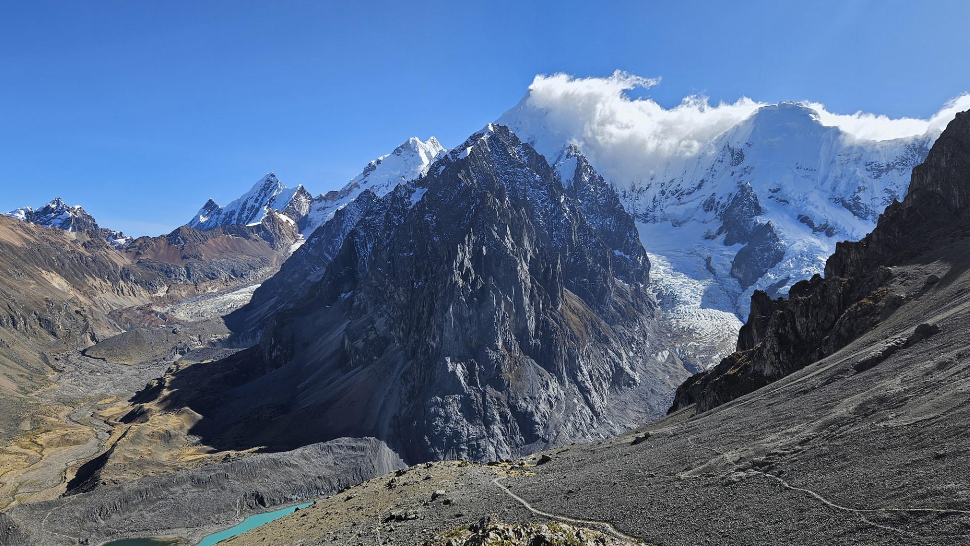 La ascensión es dura, pero la recompensa es inmensa. A estas alturas, pocas fotos apetece hacer en la subida. Al llegar a la cima, situada a 5072 metros, las vistas nos dejan sin aliento: dos gigantes de piedra y hielo, el Carnicero (5560 m) y el Sarapo (6127 m), dominan el paisaje, con sus imponentes glaciares extendiéndose a sus pies.