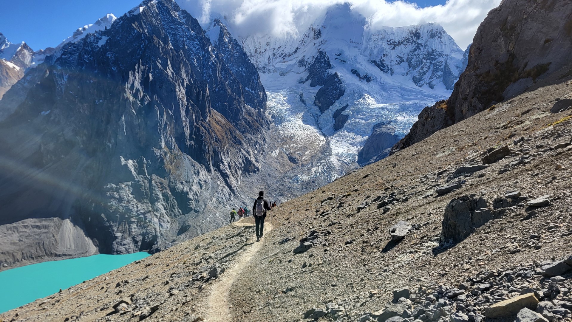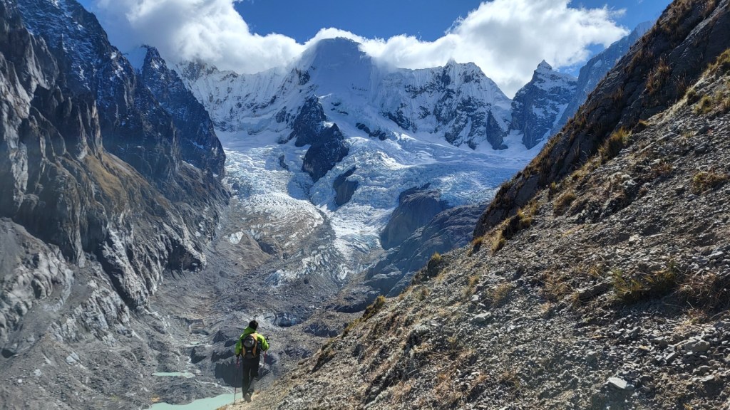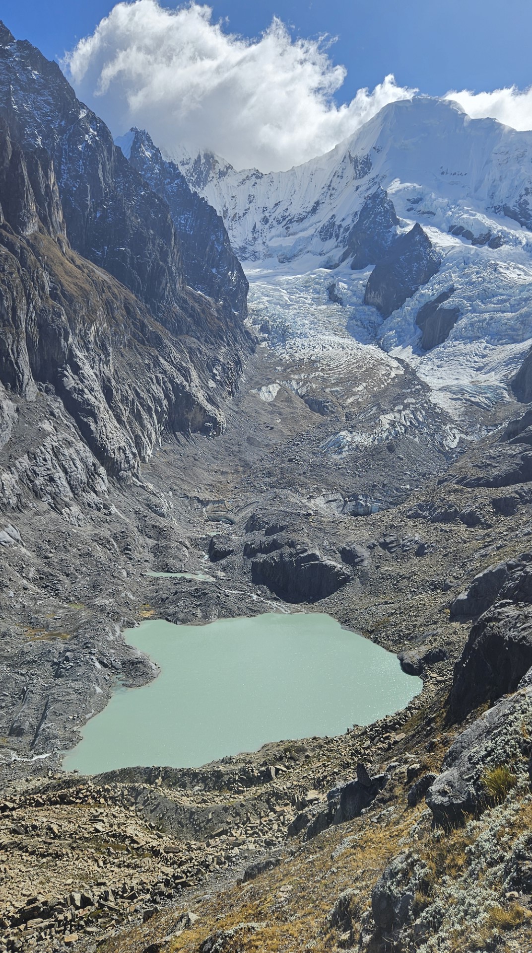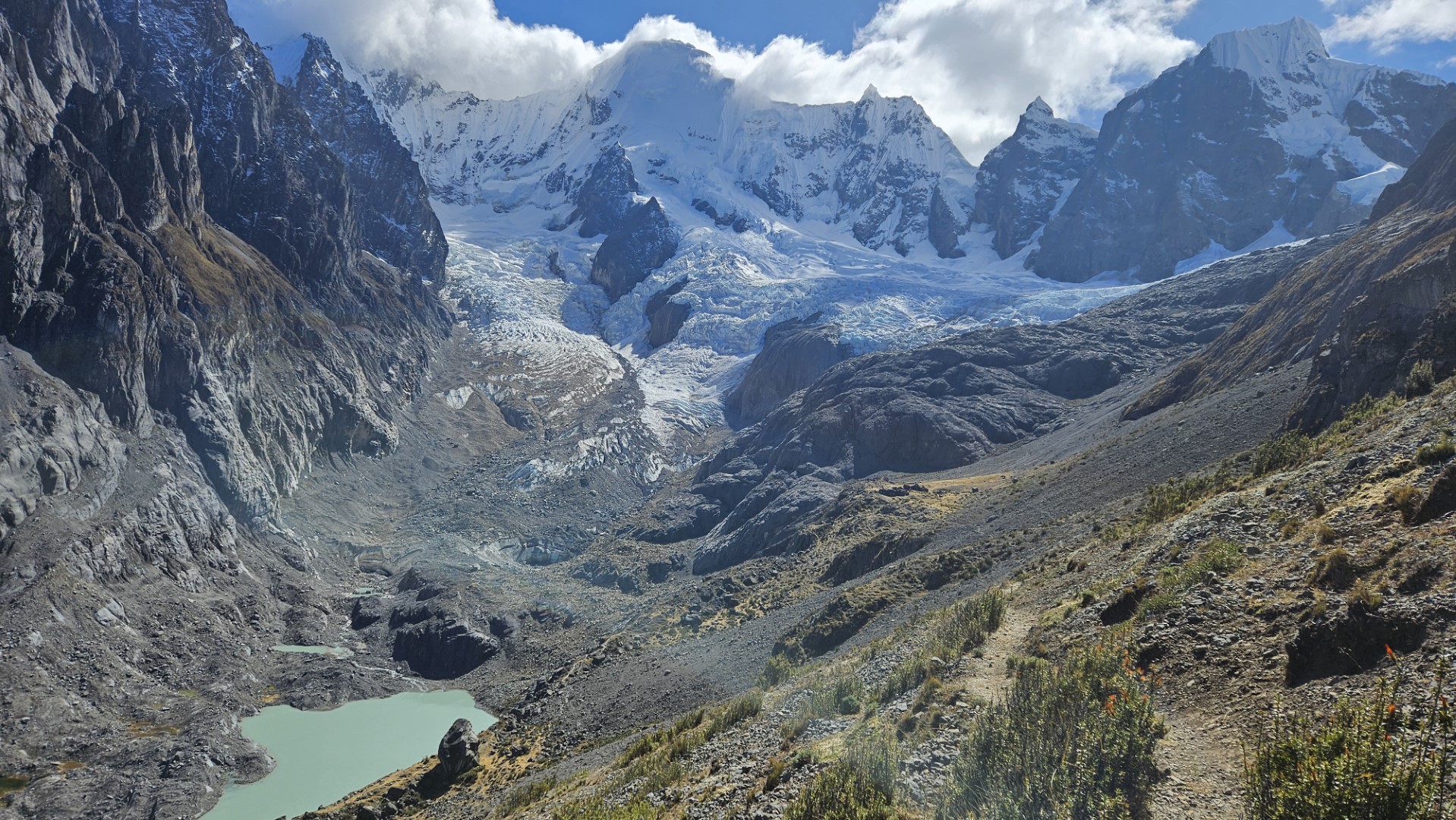 La ascensión es dura, pero la recompensa es inmensa. A estas alturas, pocas fotos apetece hacer en la subida. Al llegar a la cima, situada a 5072 metros, las vistas nos dejan sin aliento: dos gigantes de piedra y hielo, el Carnicero (5560 m) y el Sarapo (6127 m), dominan el paisaje, con sus imponentes glaciares extendiéndose a sus pies.