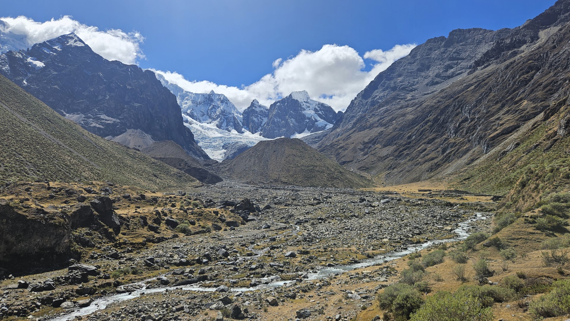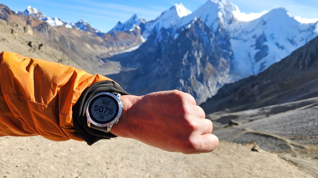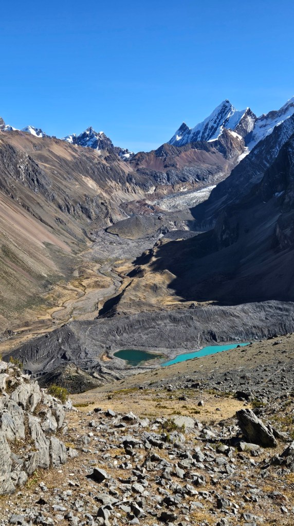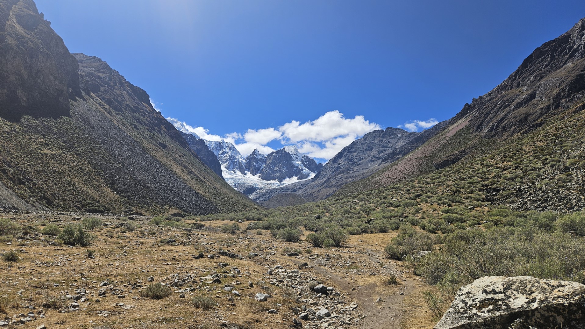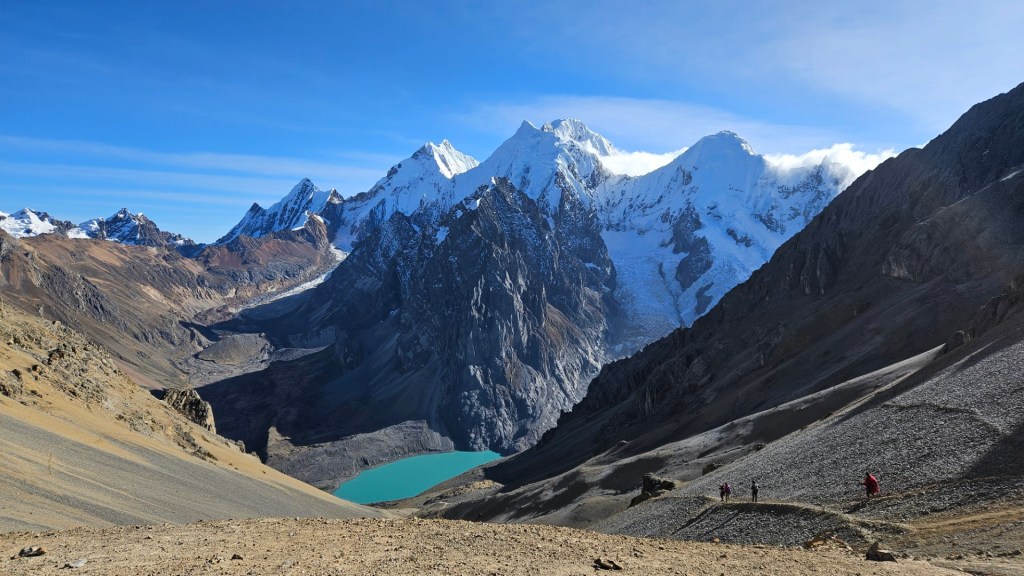 La ascensión es dura, pero la recompensa es inmensa. A estas alturas, pocas fotos apetece hacer en la subida. Al llegar a la cima, situada a 5072 metros, las vistas nos dejan sin aliento: dos gigantes de piedra y hielo, el Carnicero (5560 m) y el Sarapo (6127 m), dominan el paisaje, con sus imponentes glaciares extendiéndose a sus pies.