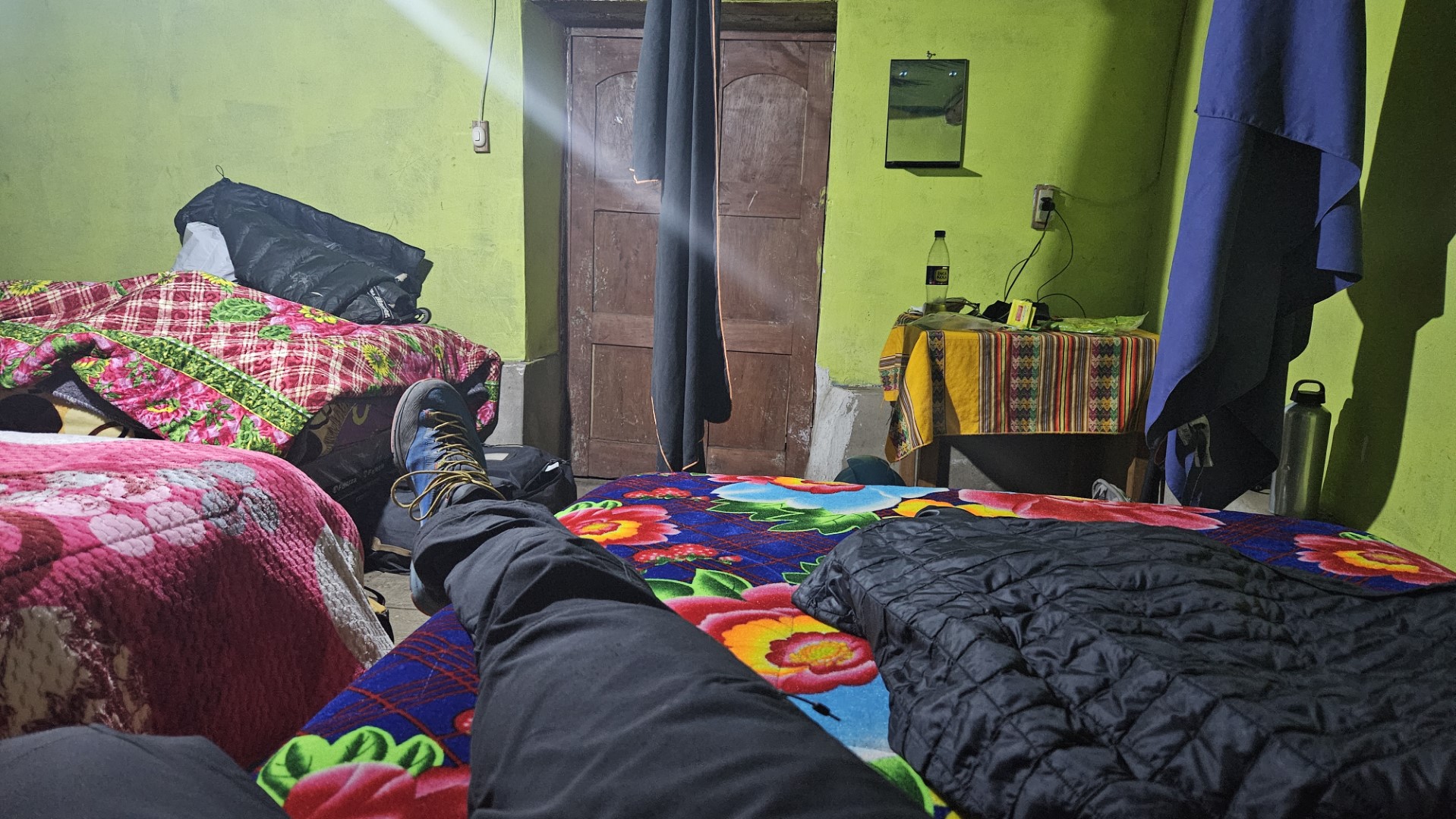 La bajada se vuelve extenuante, pero la perspectiva de pasar la noche en un hotel, con la promesa de unas horas extra de sueño y una buena ducha, nos impulsa a seguir. Después de tantos días de frío, la idea de una cama y un techo es simplemente irresistible.