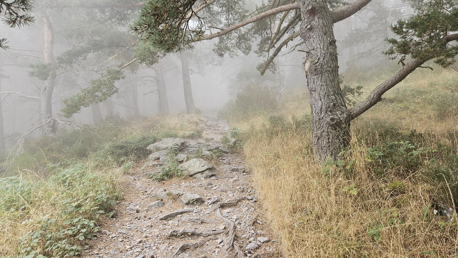El sendero que seguimos se adentraba rápidamente en el bosque. Estamos envueltos en una espesa niebla que da a la ruta un aire misterioso y silencioso. Apenas podíamos ver más allá de unos metros, lo que hacía que el bosque pareciera infinito. El camino no era complicado, pero las raíces de los árboles y las rocas mojadas nos obligaban a caminar con cuidado.