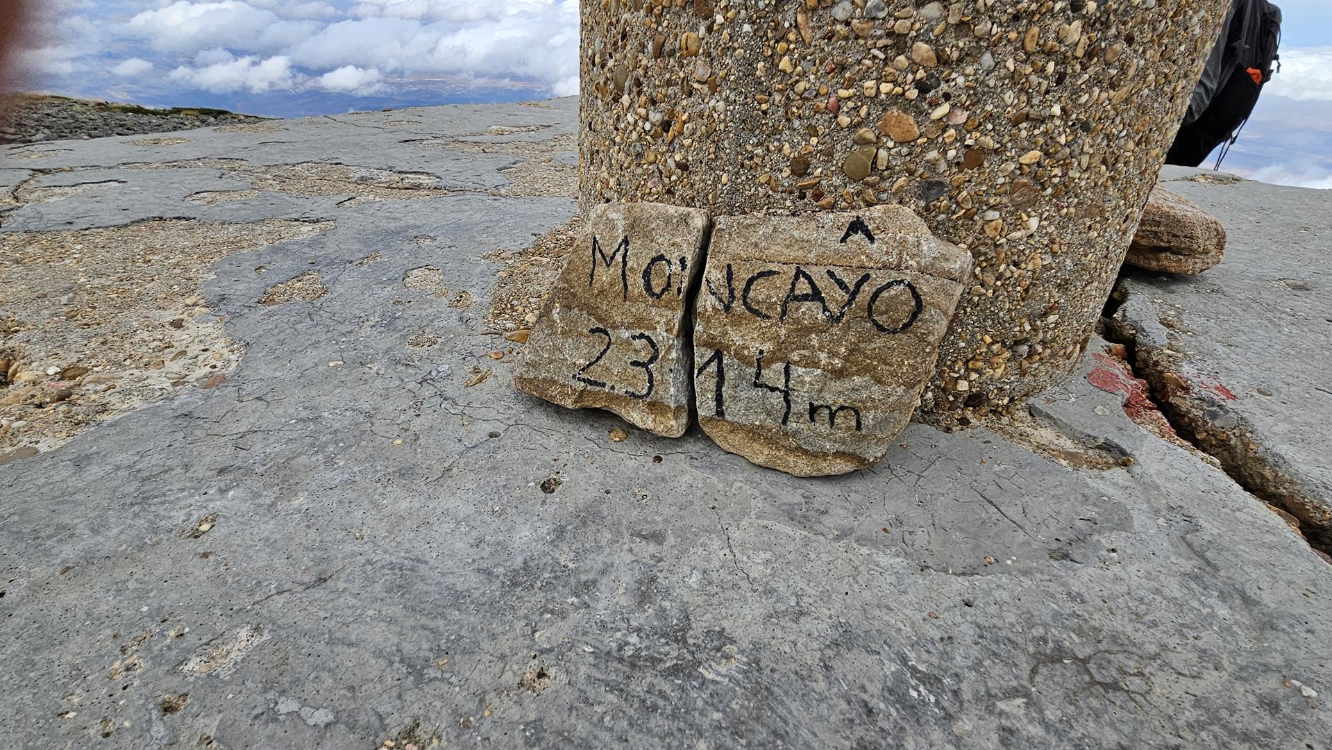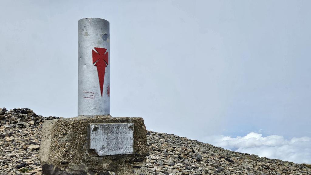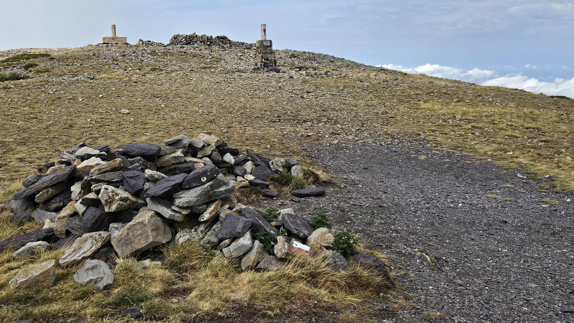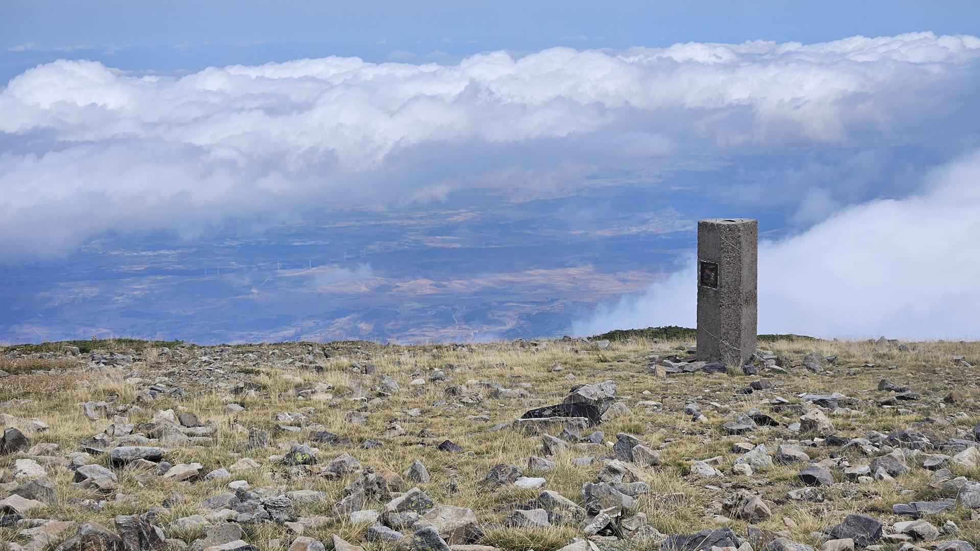 Finalmente, alcanzamos la cima del Moncayo, a 2.314 metros de altitud. Encontramos el vértice geodésico que marca el punto más alto y algunos buzones e hitos de piedra que otros montañeros habían construido. La cima es pedregosa y árida. El viento era fuerte, pero las vistas espectaculares.