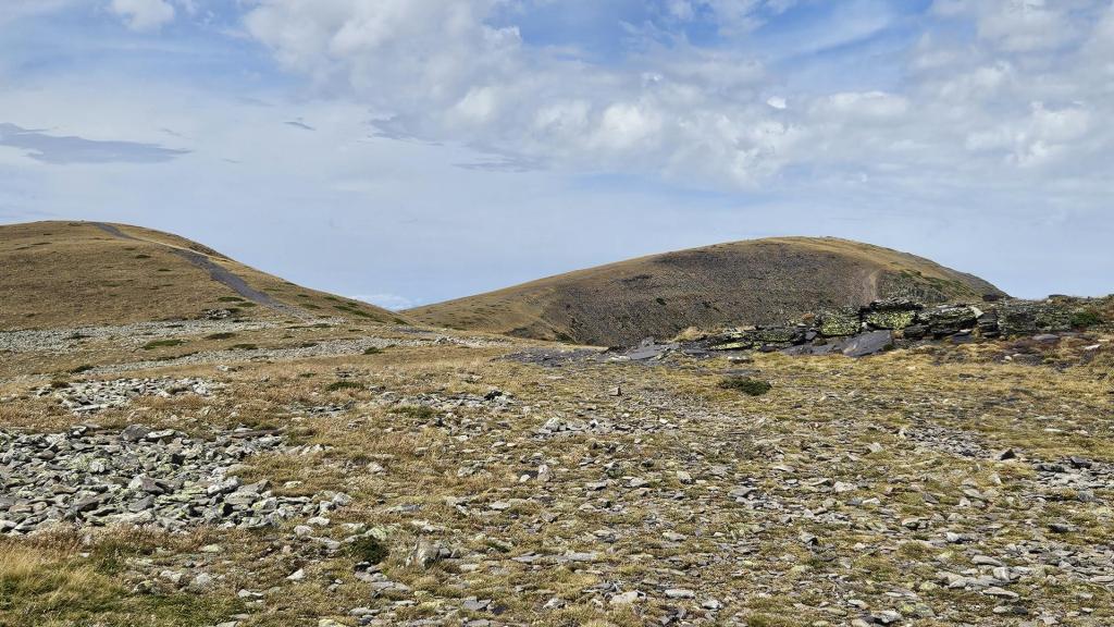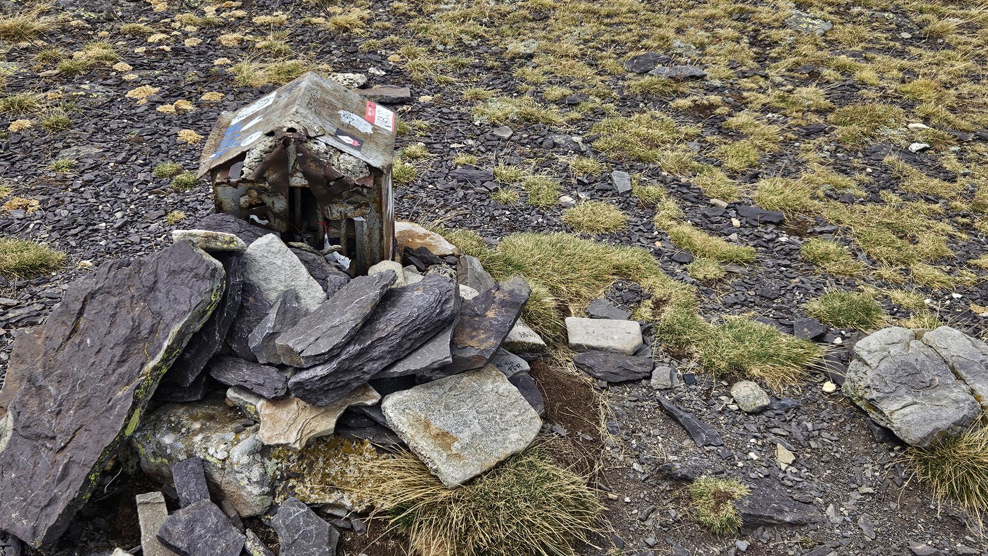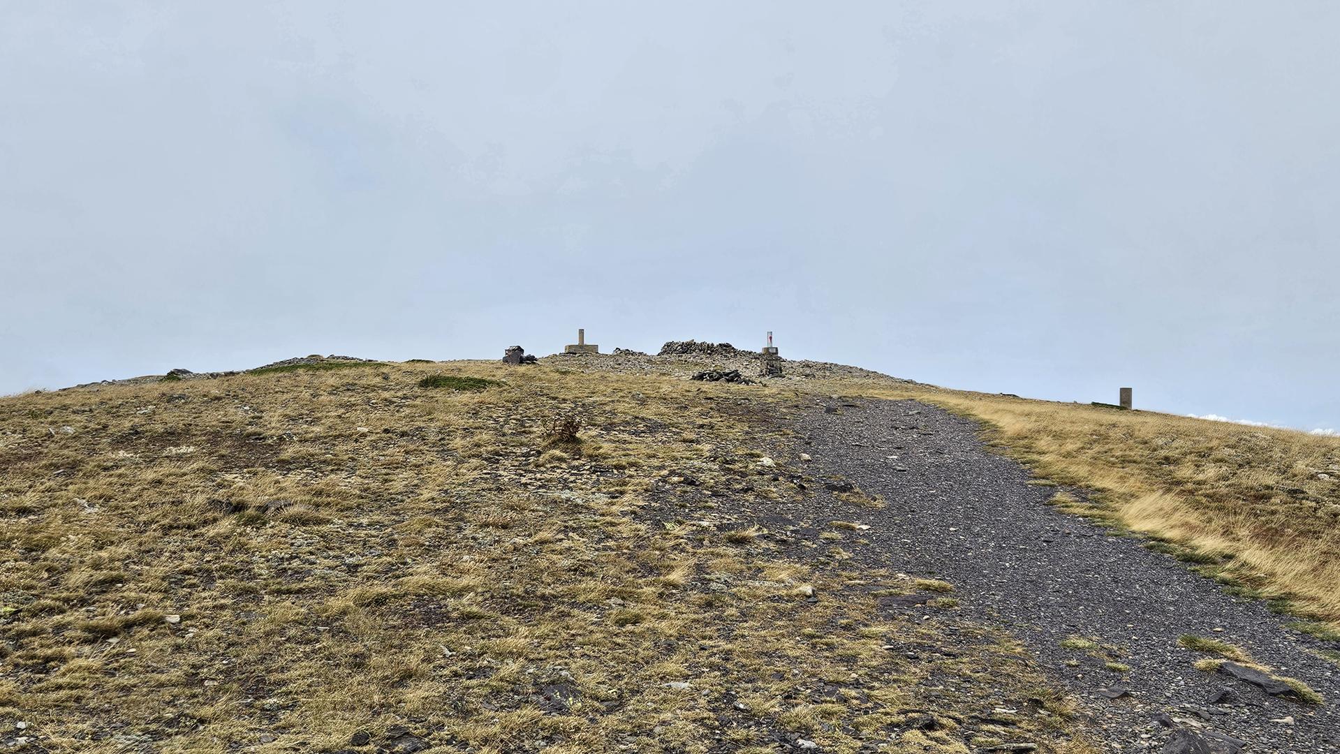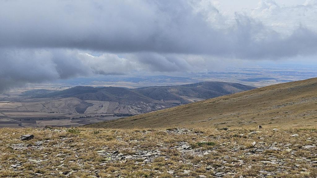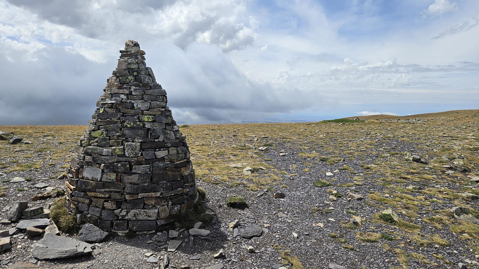 Finalmente, alcanzamos la cima del Moncayo, a 2.314 metros de altitud. Encontramos el vértice geodésico que marca el punto más alto y algunos buzones e hitos de piedra que otros montañeros habían construido. La cima es pedregosa y árida. El viento era fuerte, pero las vistas espectaculares.