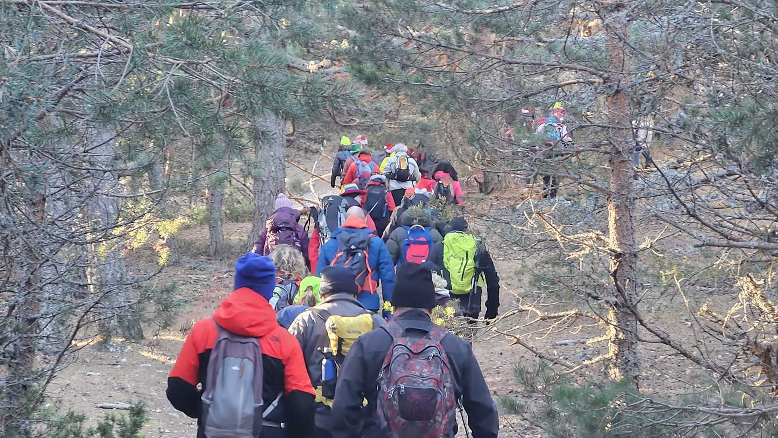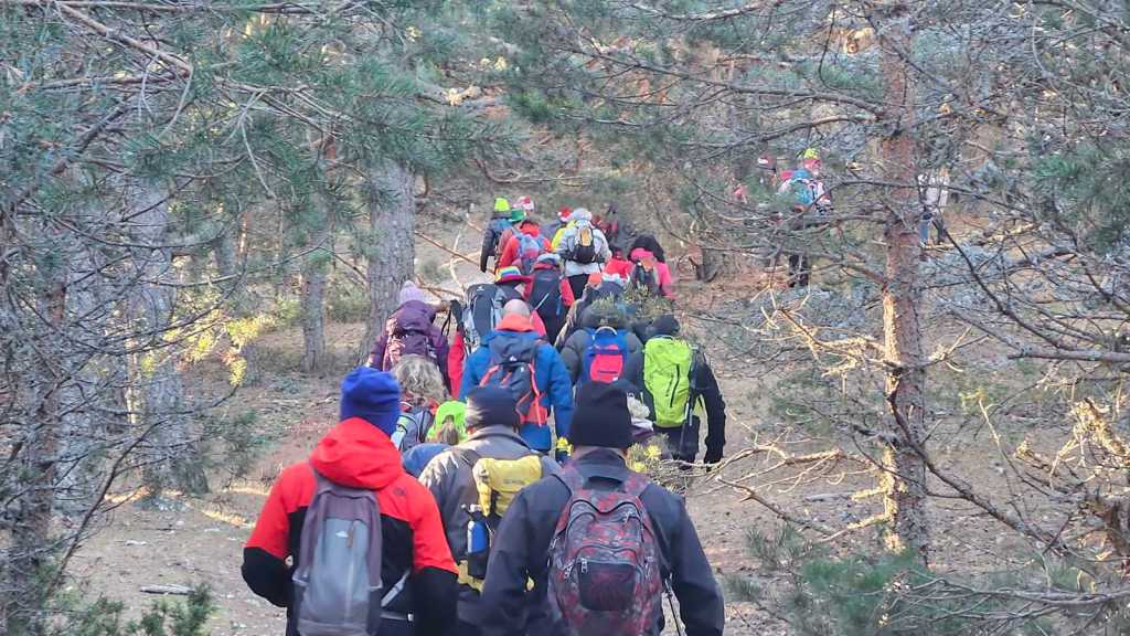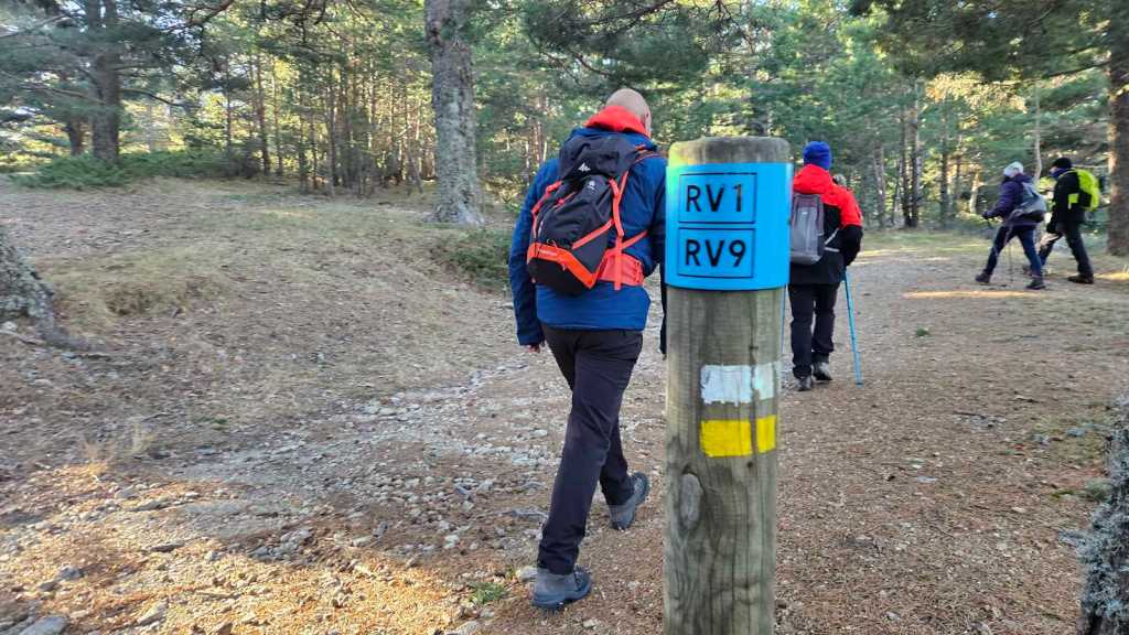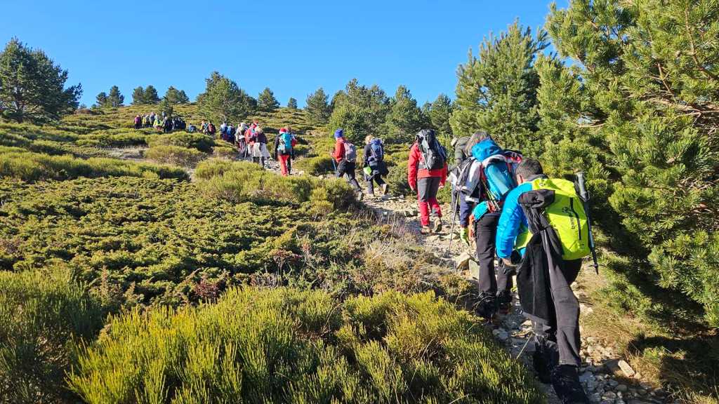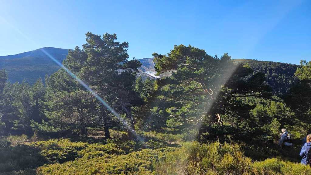La subida transcurre por una senda que serpentea en medio de un frondoso pinar. Nuestro guía realiza varias paradas estratégicas para compartir datos interesantes sobre la flora y fauna de la sierra y sobre todas las cimas que tenemos alrededor.