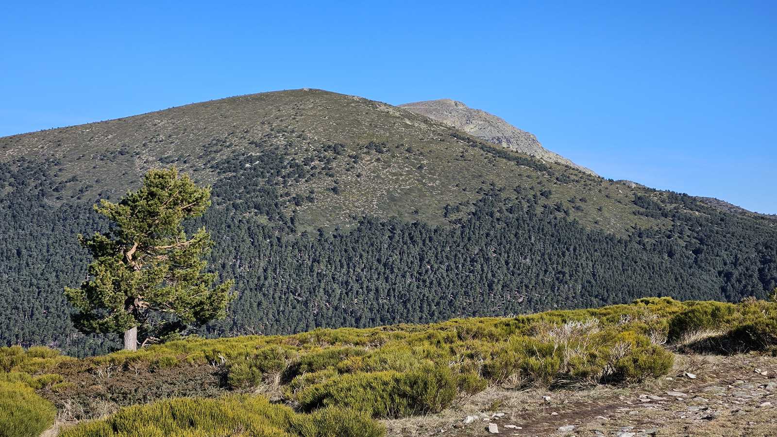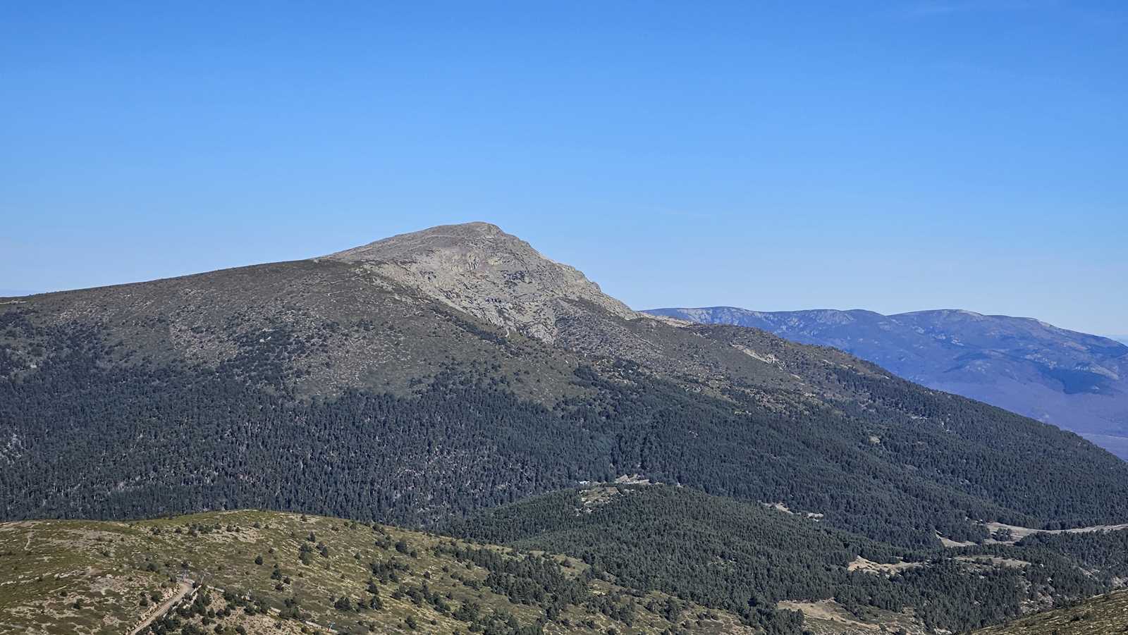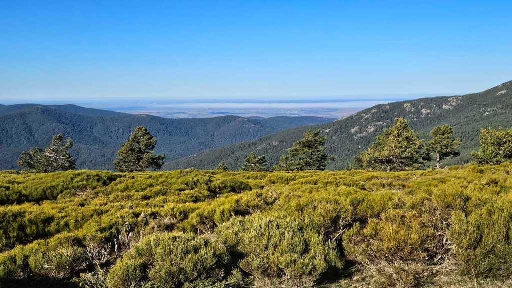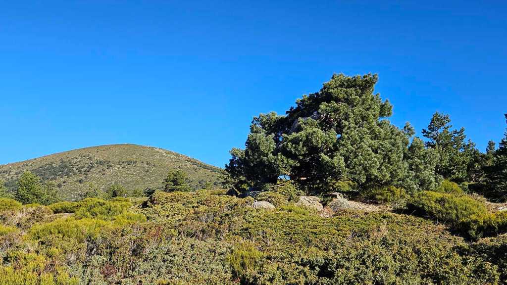 Mientras avanzamos hacia la cumbre, dejamos a nuestras espaldas el majestuoso Pico de Peñalara, el punto más alto de la Sierra de Guadarrama, con sus imponentes 2.428 metros de altitud. Nos encontramos en una zona de repoblación de pinos, un claro ejemplo de cómo la naturaleza y la intervención humana pueden trabajar juntas para restaurar el equilibrio del entorno.