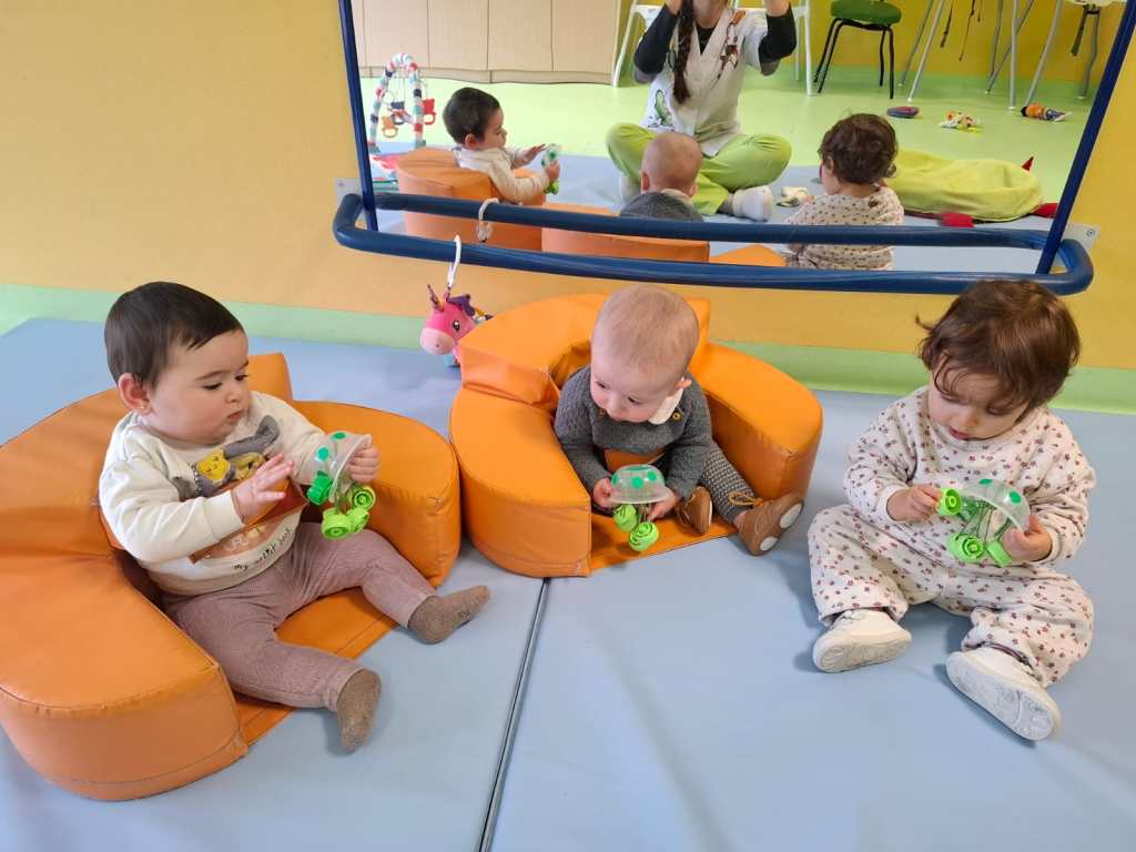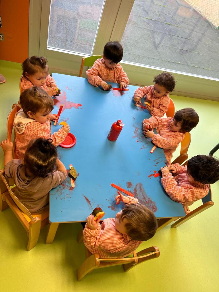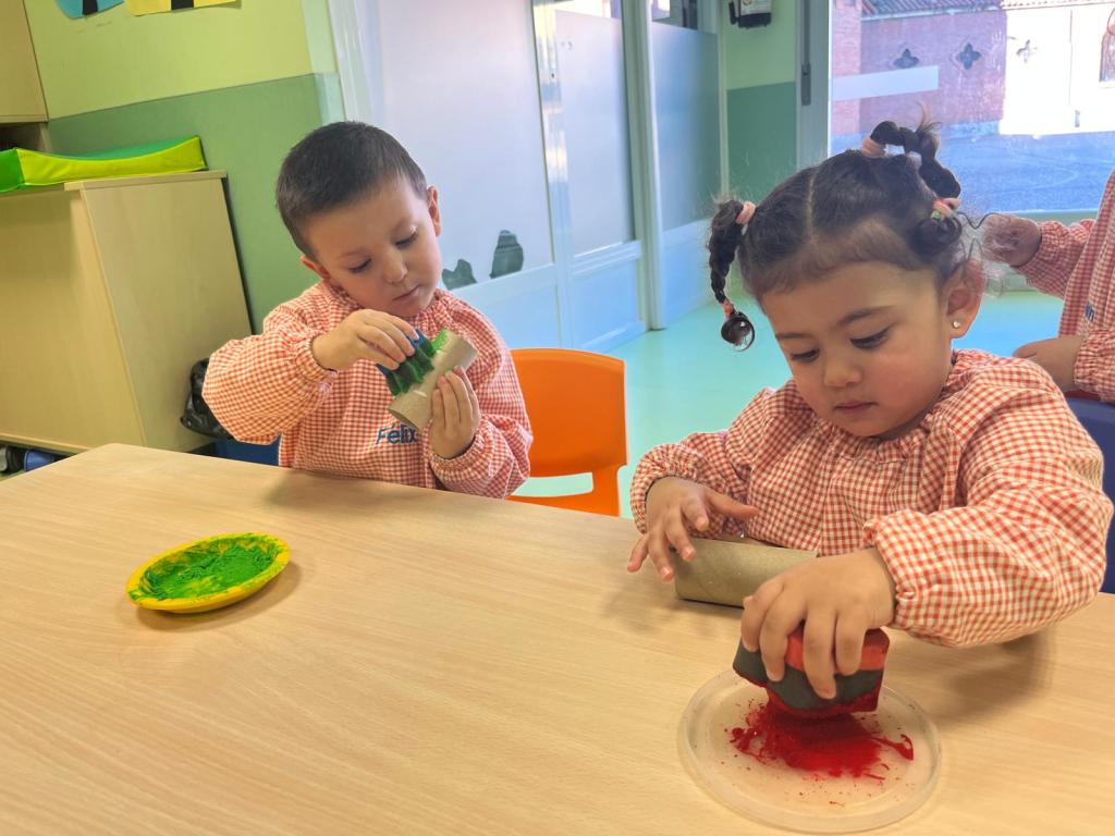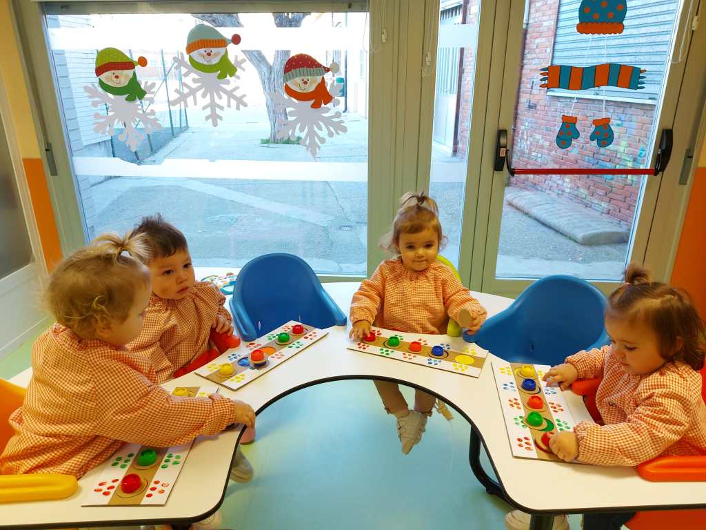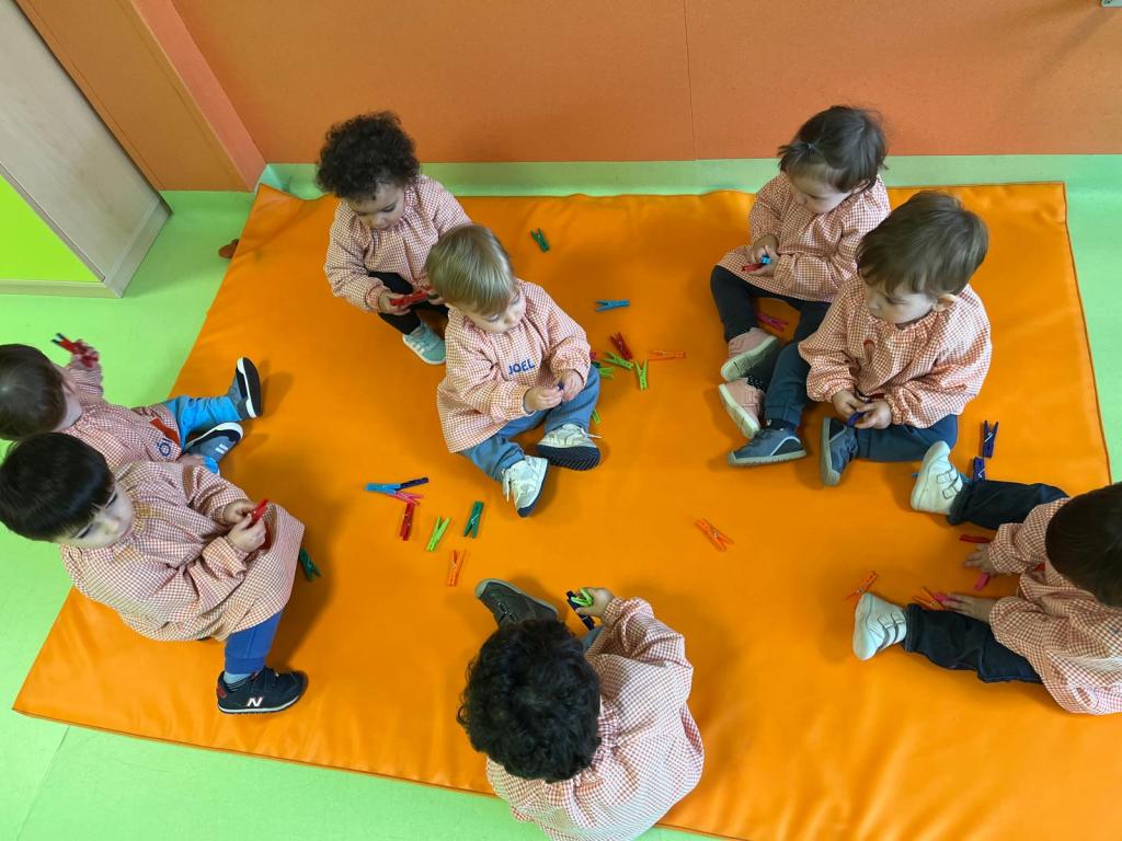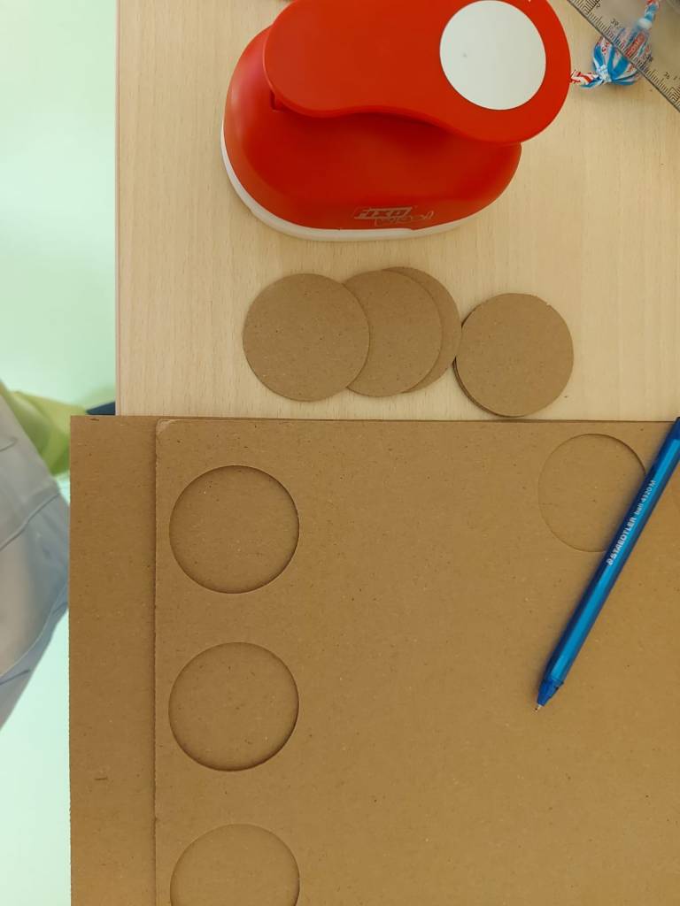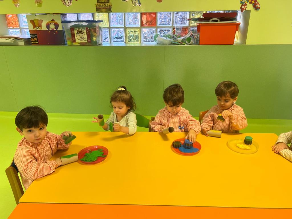 En el aula de 1-2 A nos hemos puesto creativos y hemos montado “un puzzle de círculos” usando cartón y tapones de yogur. Lo decoramos con nuestras huellas y gomets de colores. Antes de montar el juguete, estuvimos jugando y experimentando con los tapones y cajas de cartón.