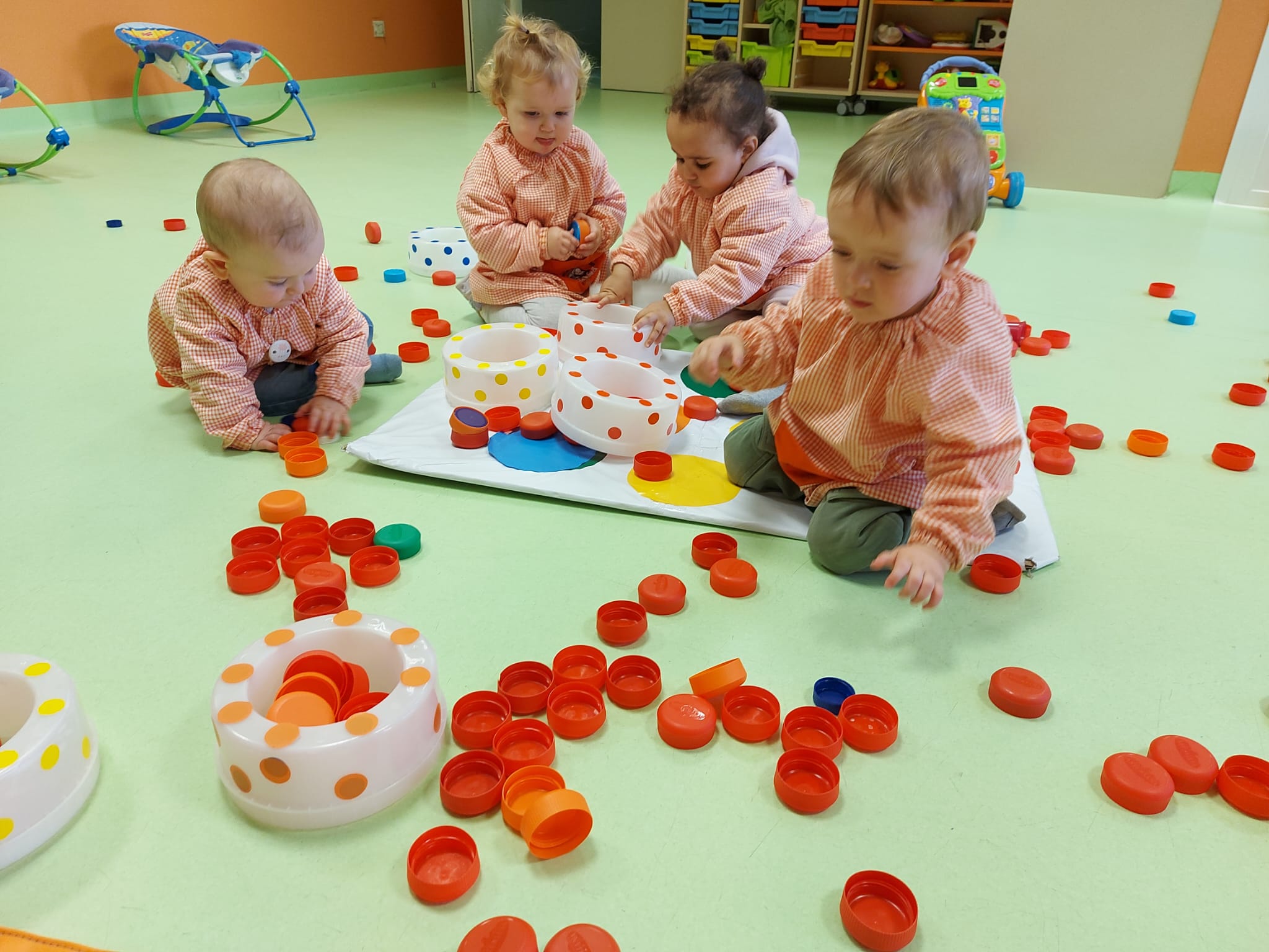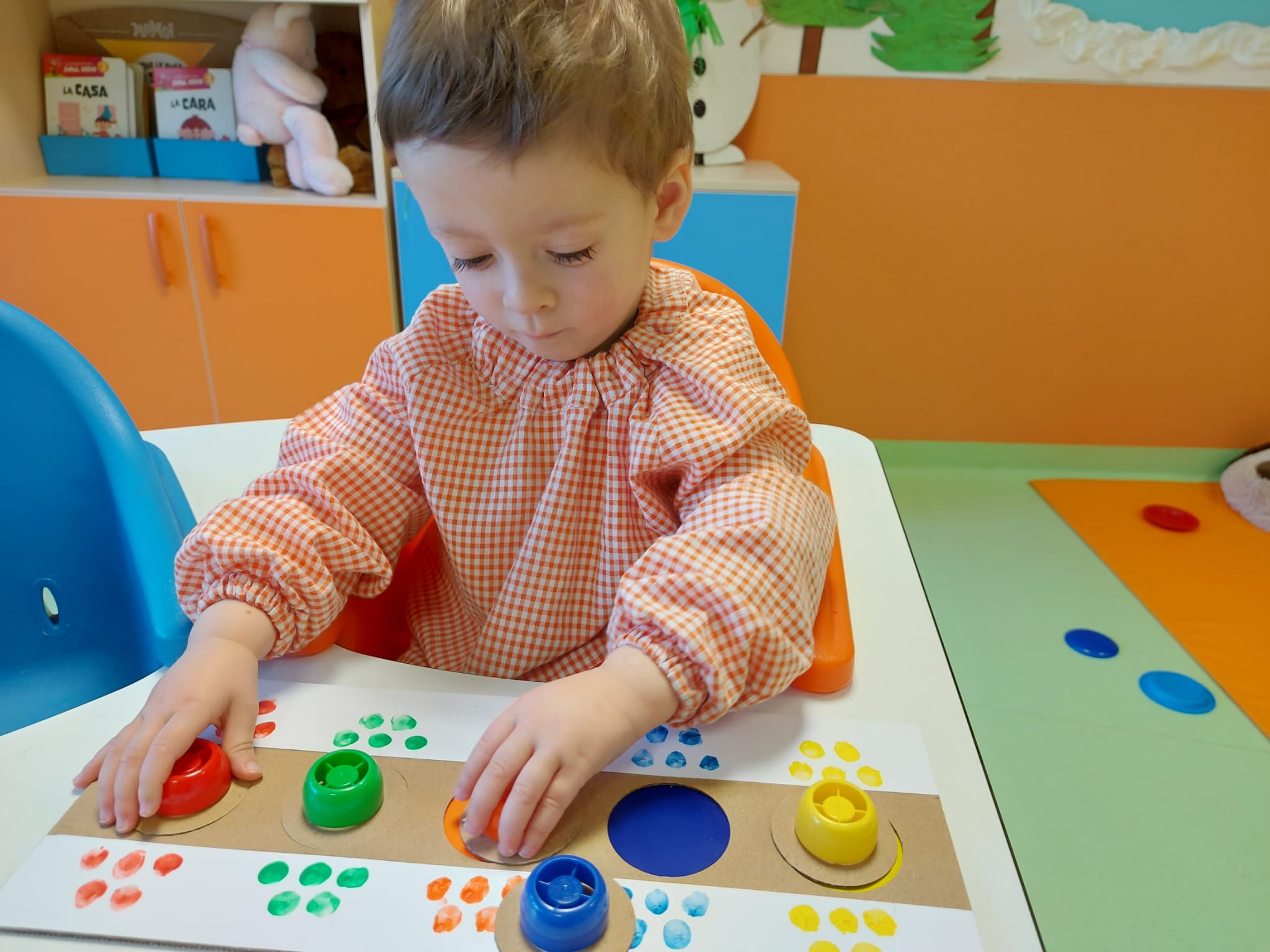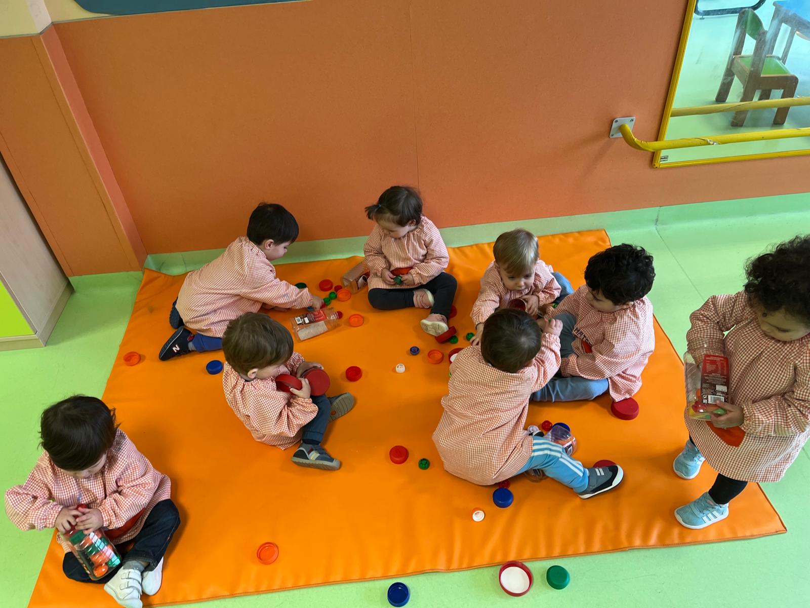 En el aula de 1-2 A nos hemos puesto creativos y hemos montado “un puzzle de círculos” usando cartón y tapones de yogur. Lo decoramos con nuestras huellas y gomets de colores. Antes de montar el juguete, estuvimos jugando y experimentando con los tapones y cajas de cartón.