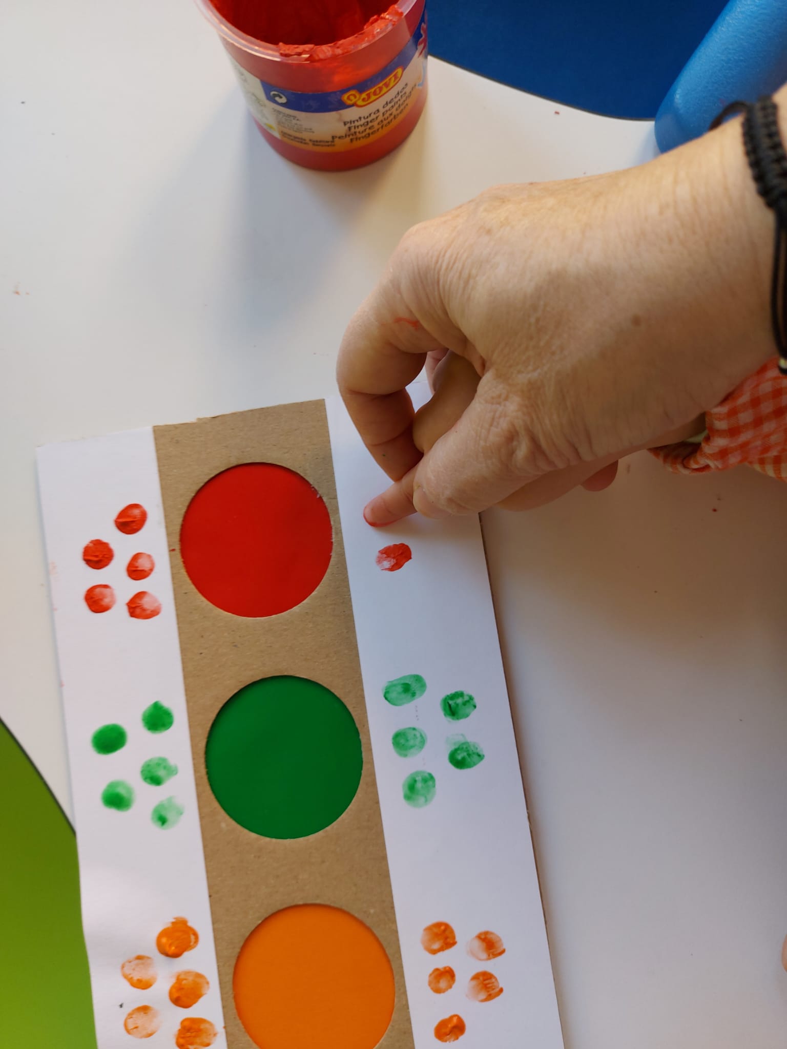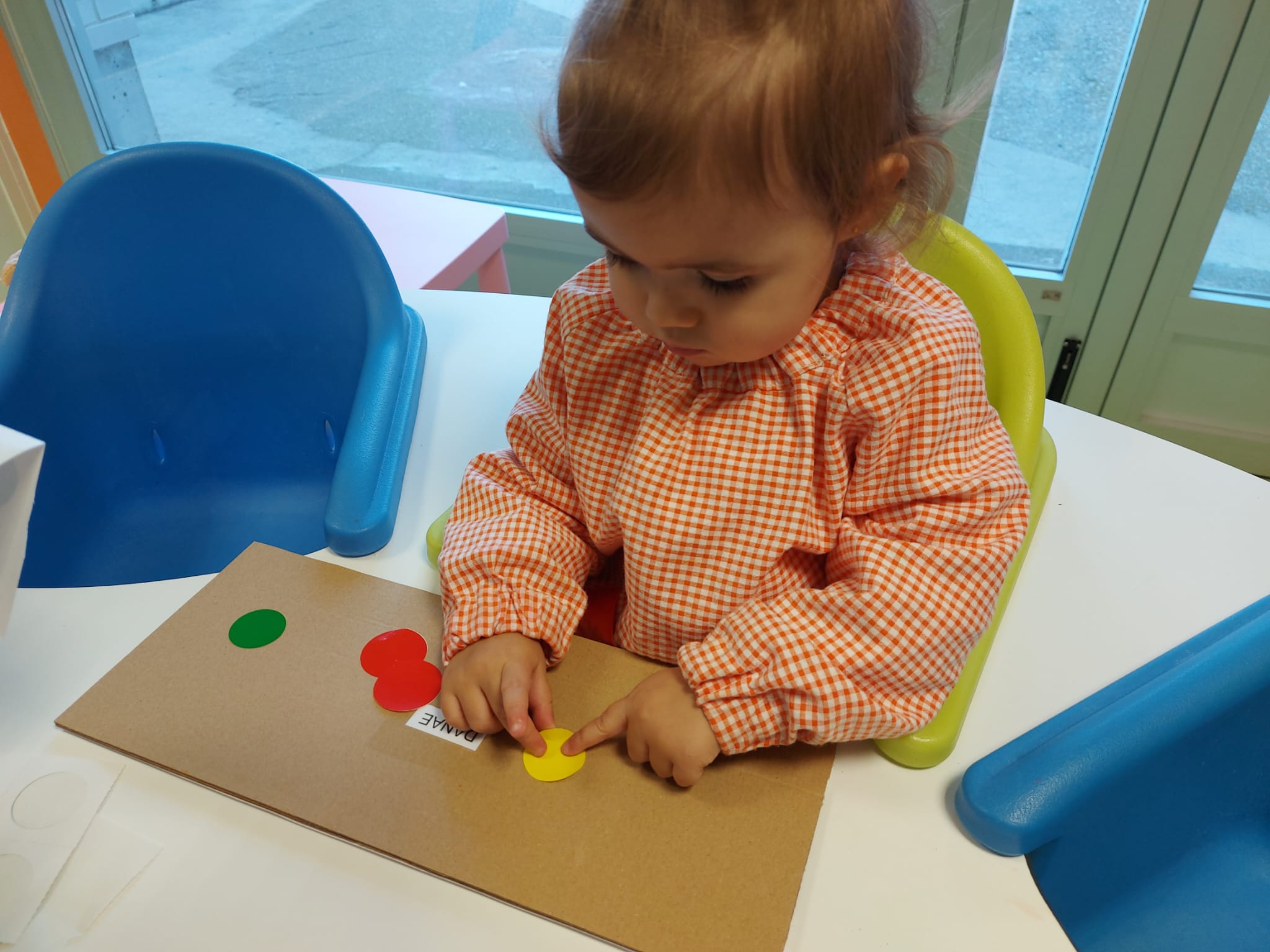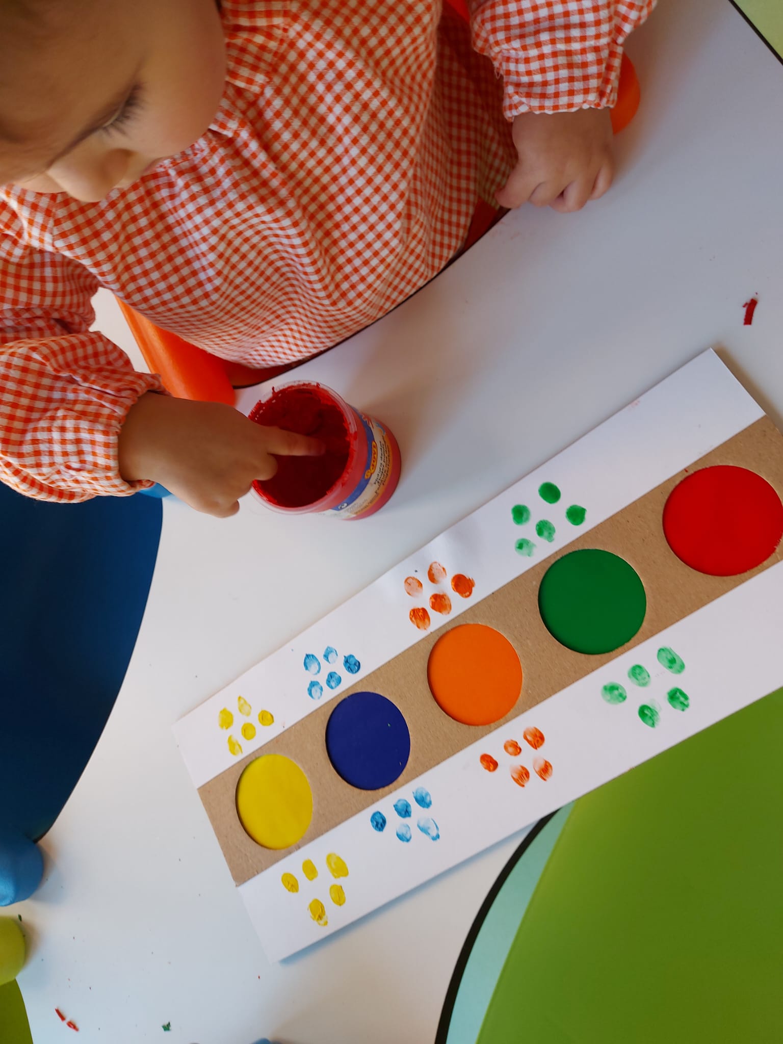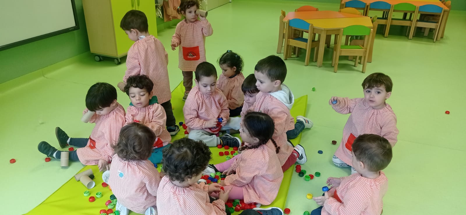 En el aula de 1-2 A nos hemos puesto creativos y hemos montado “un puzzle de círculos” usando cartón y tapones de yogur. Lo decoramos con nuestras huellas y gomets de colores. Antes de montar el juguete, estuvimos jugando y experimentando con los tapones y cajas de cartón.