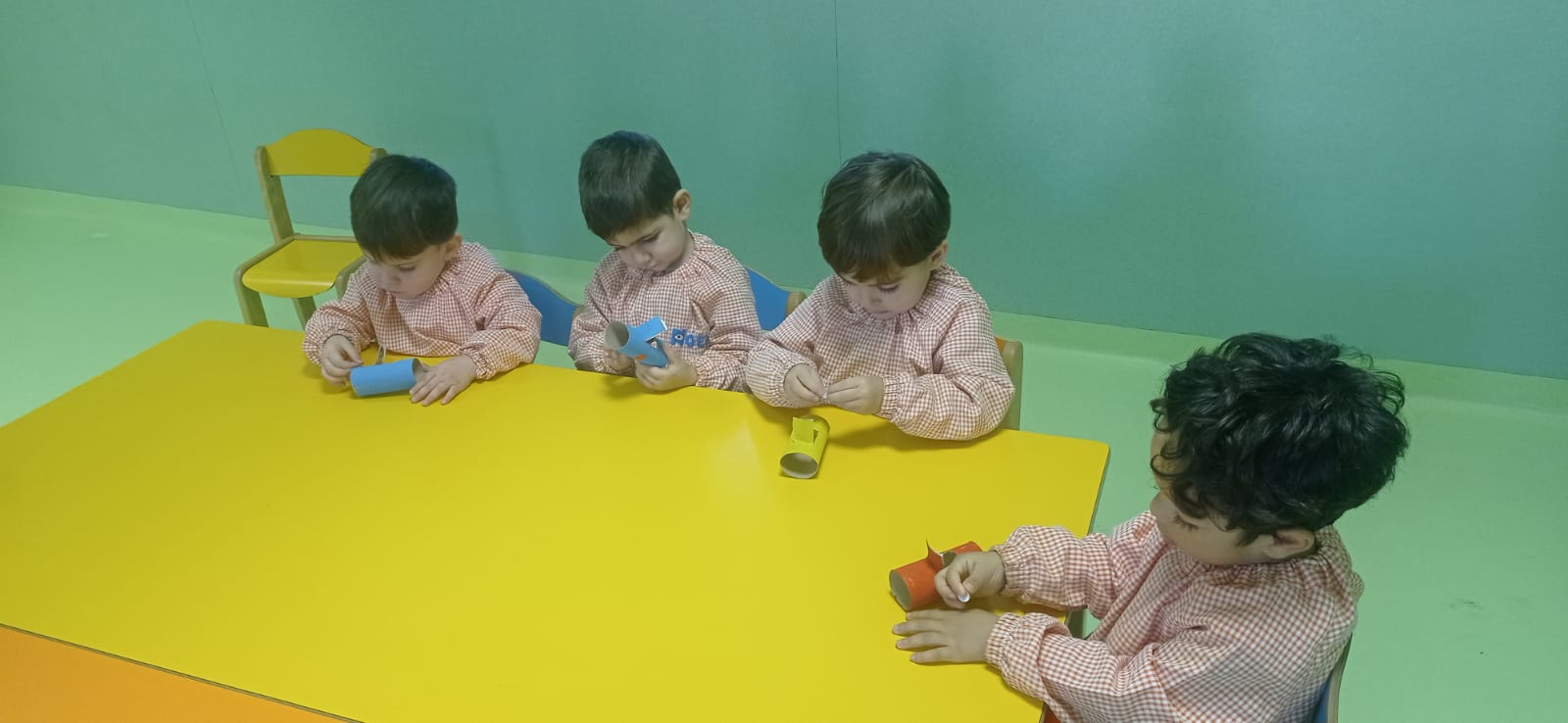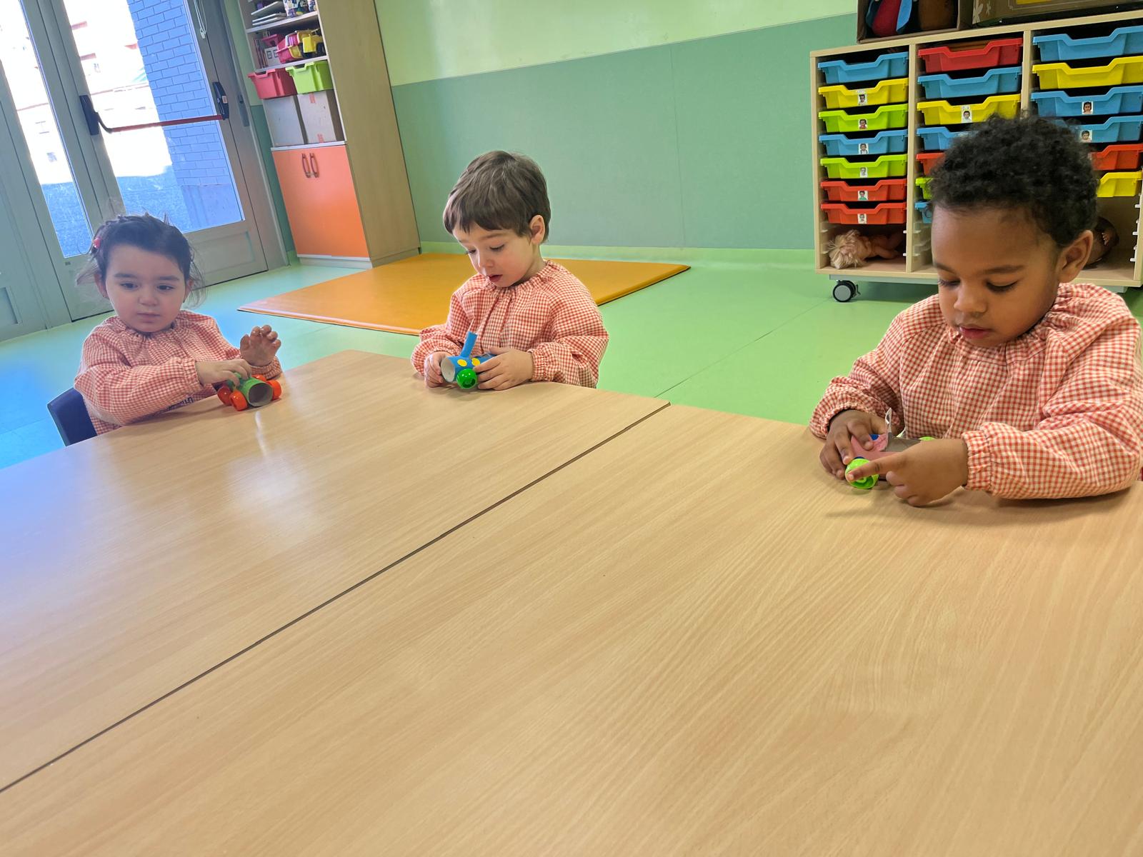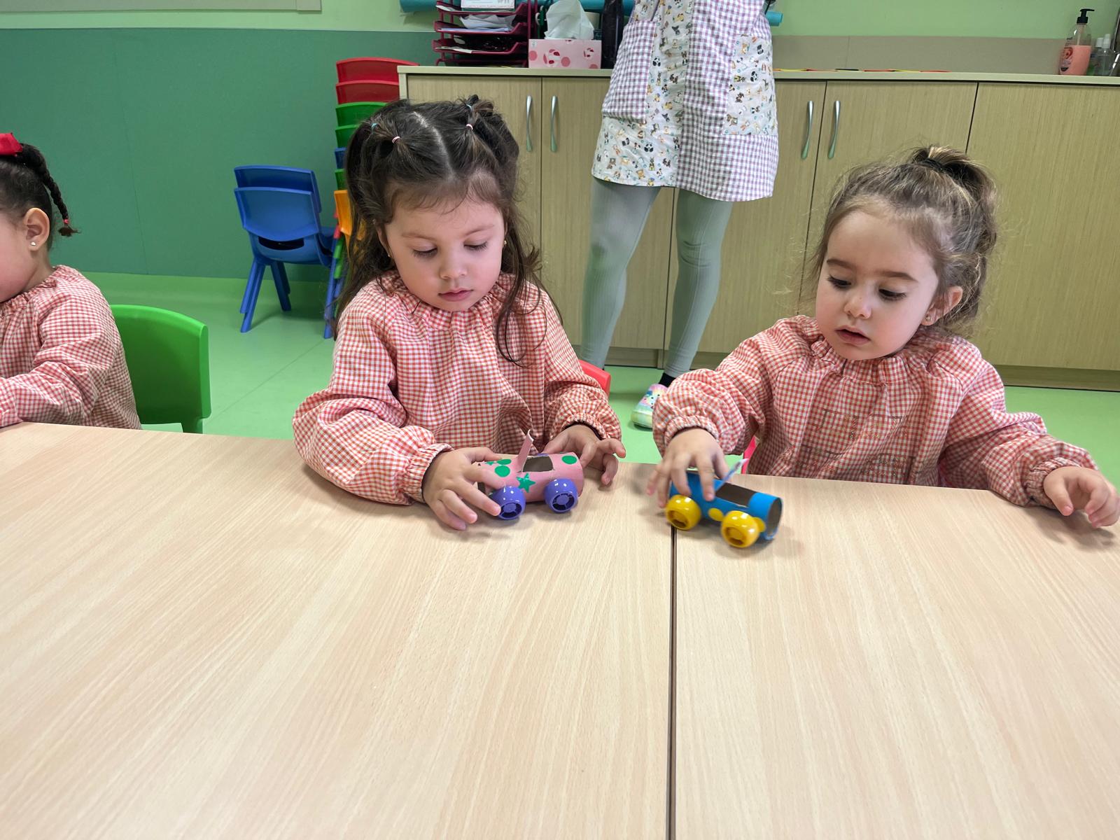 Por último, los mayores de 2-3 años creamos “un coche” reutilizando materiales como un rollo de papel higiénico y tapones de plástico de bebibles.