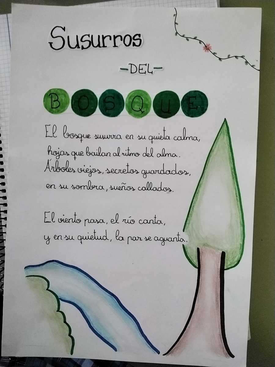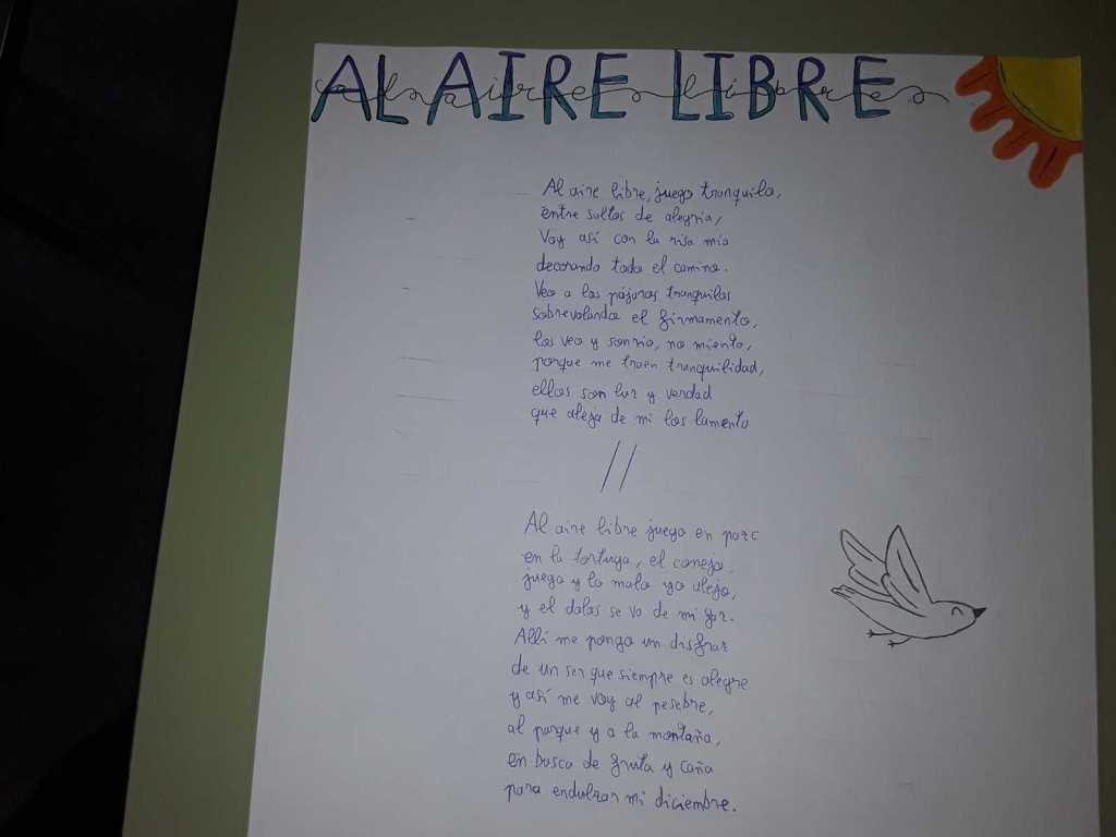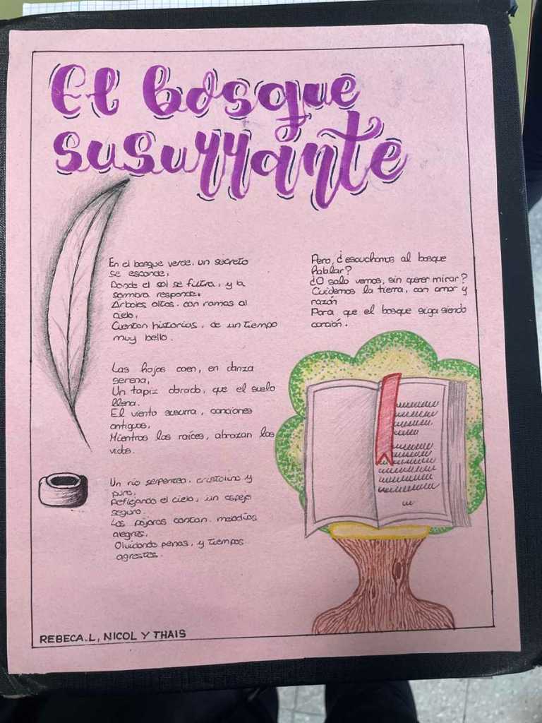 🔹 Expresión artística: una vez elegido el poema, cada grupo lo transcribió en una cartulina y lo decoró con elementos visuales acordes al contenido: dibujos, hojas secas, texturas naturales y colores evocadores. El objetivo era dar vida a la poesía desde lo plástico, conectando palabra e imagen.