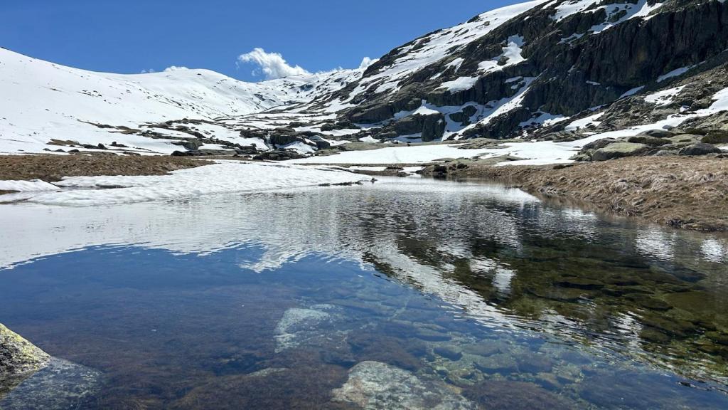 Comenzamos a caminar en dirección a Prado Pozas, siguiendo el antiguo camino empedrado, y pronto nos encontramos con las primeras manchas de nieve, que acompañarían gran parte de nuestro recorrido. Cruzamos el característico puente de piedra y emprendimos la subida hacia los Barrerones, donde la nieve ya era constante, cubriendo el paisaje de un manto blanco impresionante.