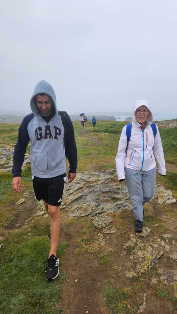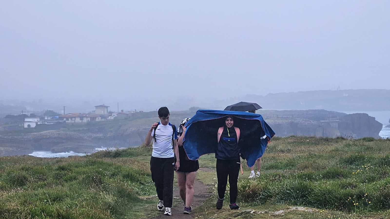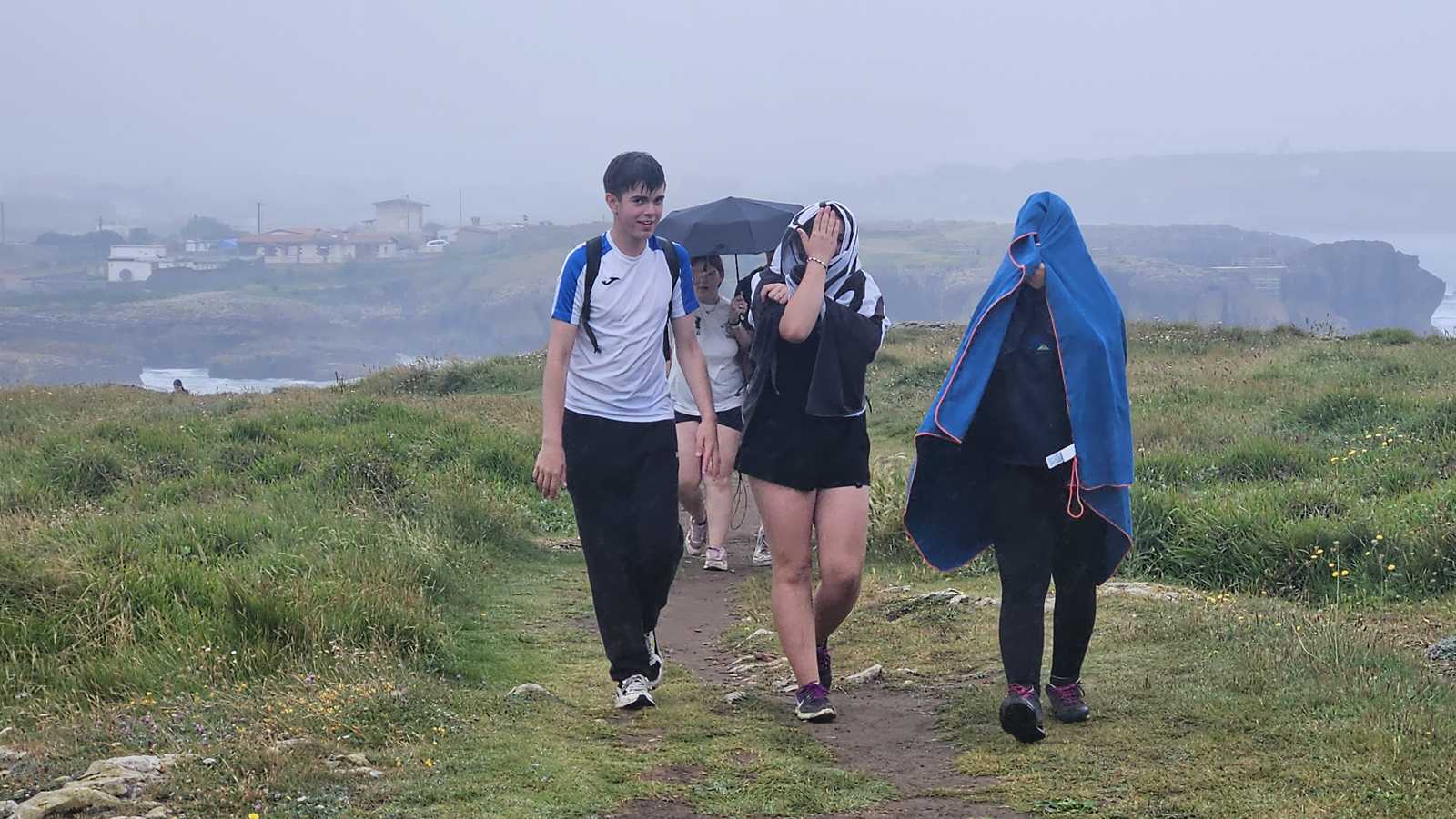 Nuestra ruta comenzó en la Ermita de la Virgen del Mar. Desde allí, tras reunirnos todo el grupo, iniciamos el recorrido bordeando la costa. El sonido de las olas, el olor a salitre y la brisa marina nos acompañaron desde el primer paso. A pesar de la llovizna, el ambiente era alegre y tranquilo, ideal para empezar a caminar en compañía de amigos y profesores.