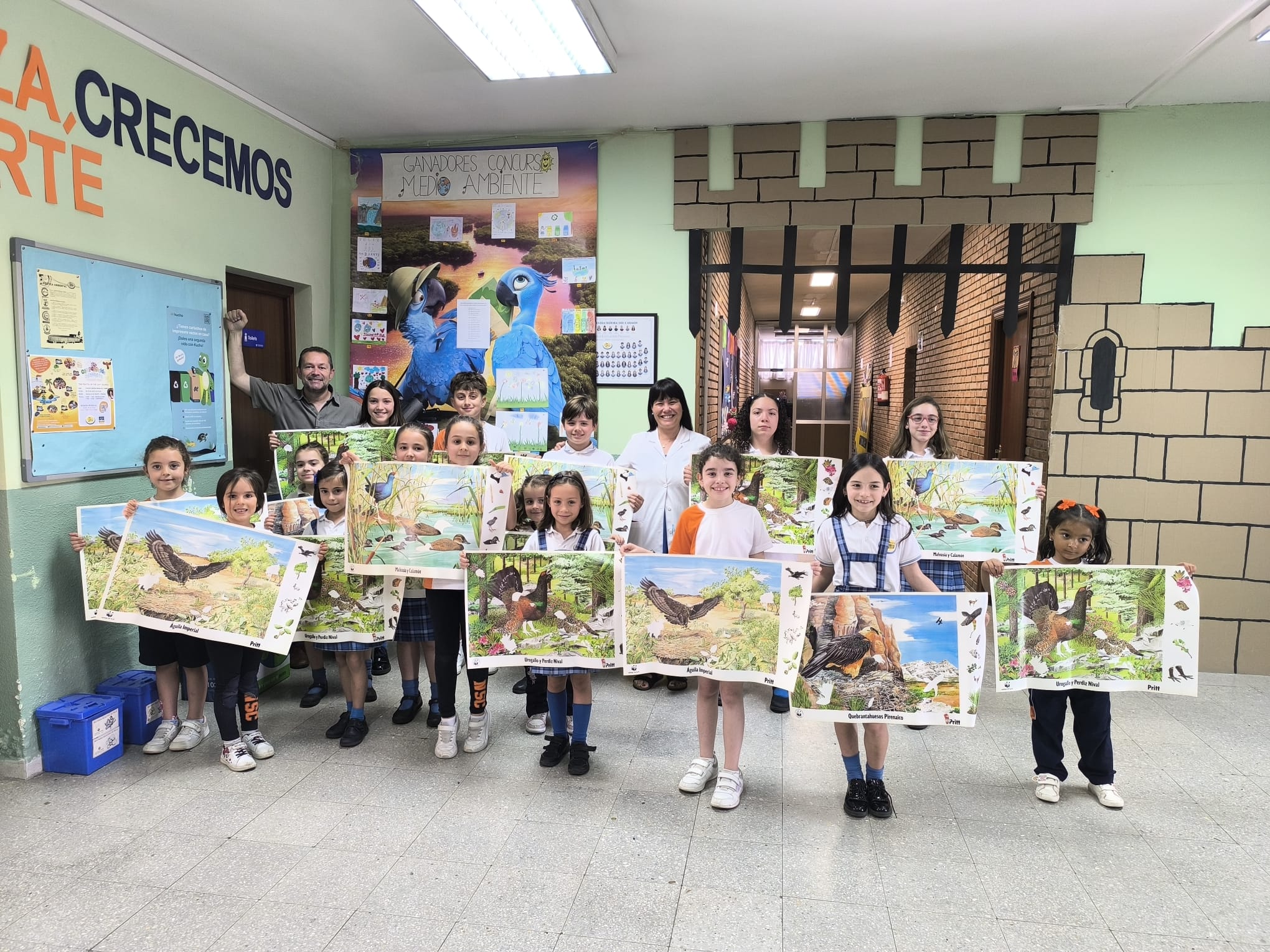 El mural final —presidido por el cartel “Ganadores Concurso Medio Ambiente” y rodeado de los dibujos premiados— ha sido un auténtico escaparate de talento y esperanza. También hemos compartido con orgullo el gran póster colaborativo elaborado con las piezas-puzle que cada aula diseñó, símbolo de que juntos sumamos para construir un futuro mejor.