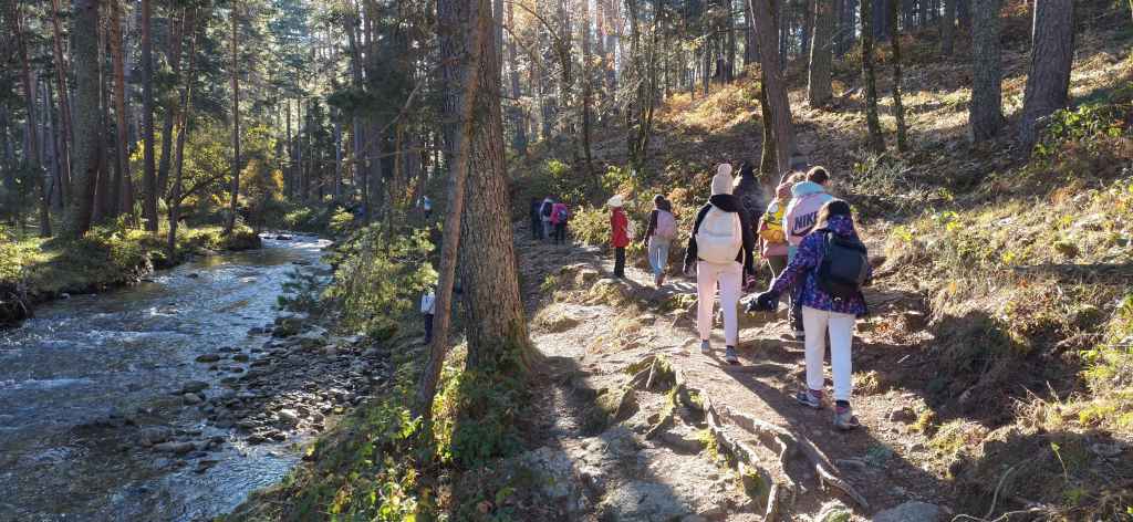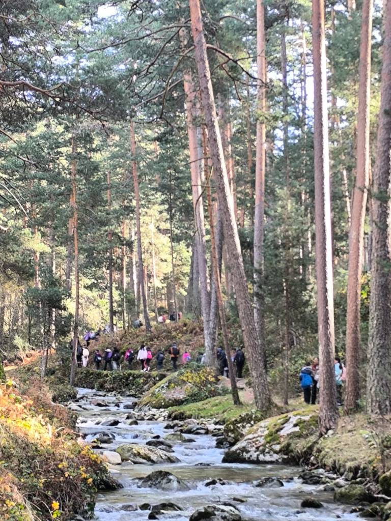 El paseo discurrió entre caminos cubiertos de hojas, el olor característico de la resina y el sonido constante del Eresma acompañando al grupo. Tras un ascenso gradual fuimos llegando al nacimiento del río, un rincón cargado de simbolismo natural e histórico que muchos alumnos visitaban por primera vez.