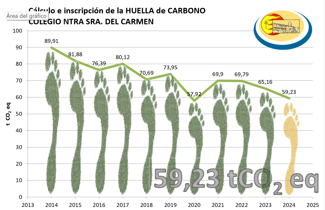 En el ejercicio 2024, la huella de carbono total del centro ha sido de 59,23 toneladas de CO₂ equivalente, incluyendo las actividades de Educación Infantil, Primaria, Secundaria y Bachillerato desarrolladas en todos los edificios e instalaciones del Colegio.
