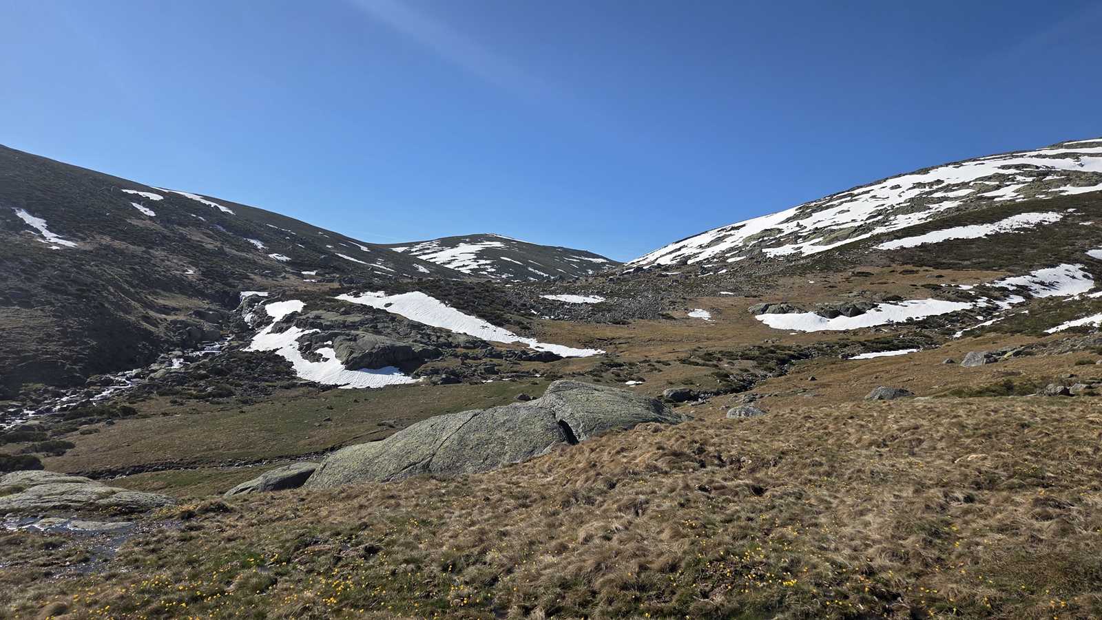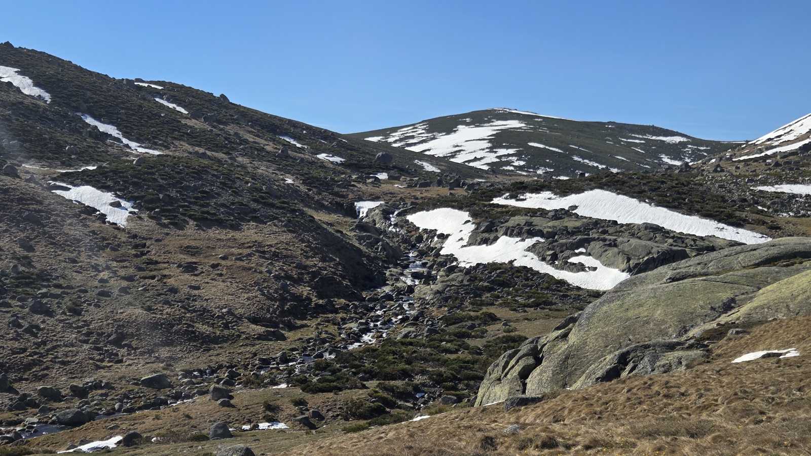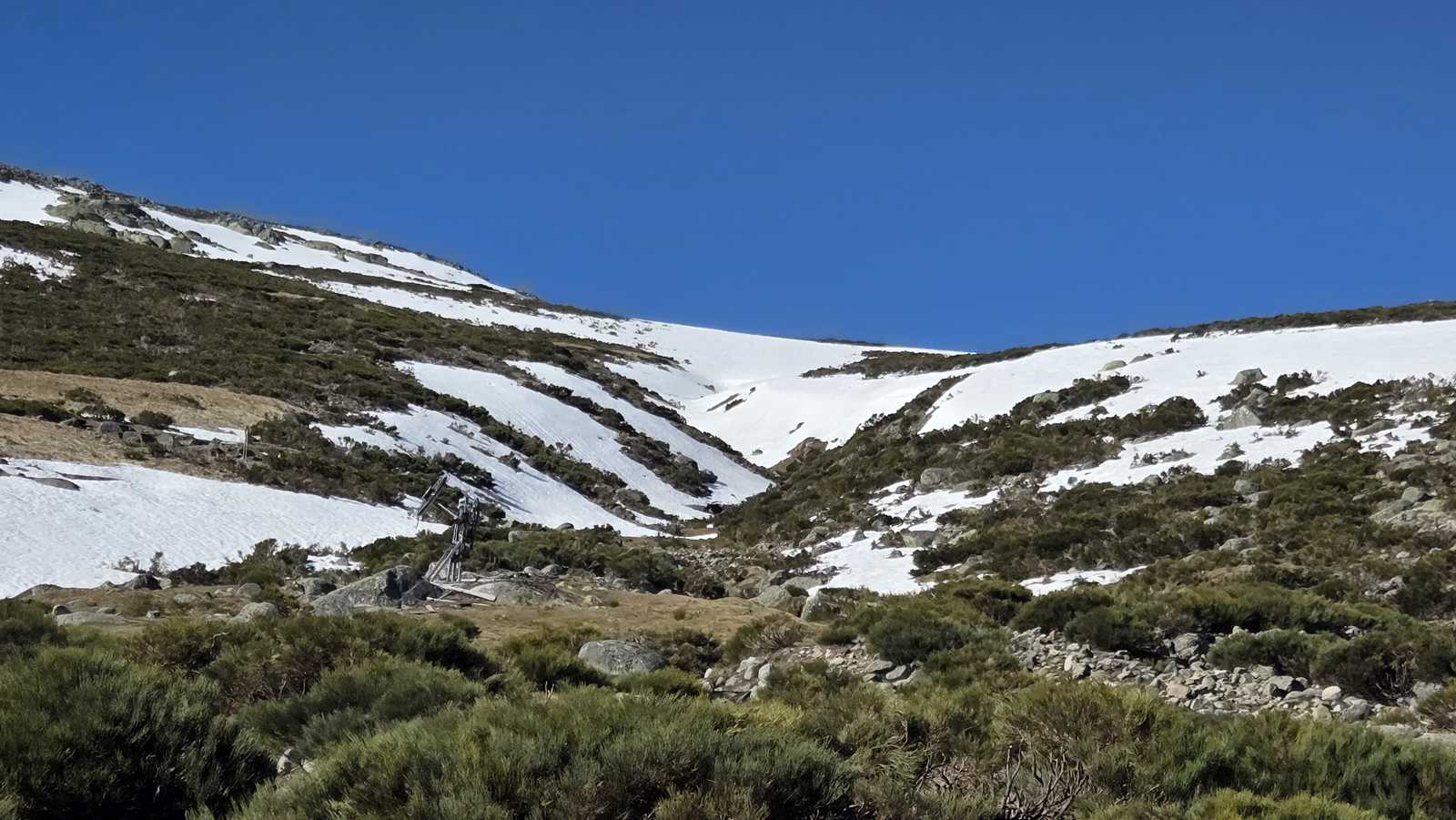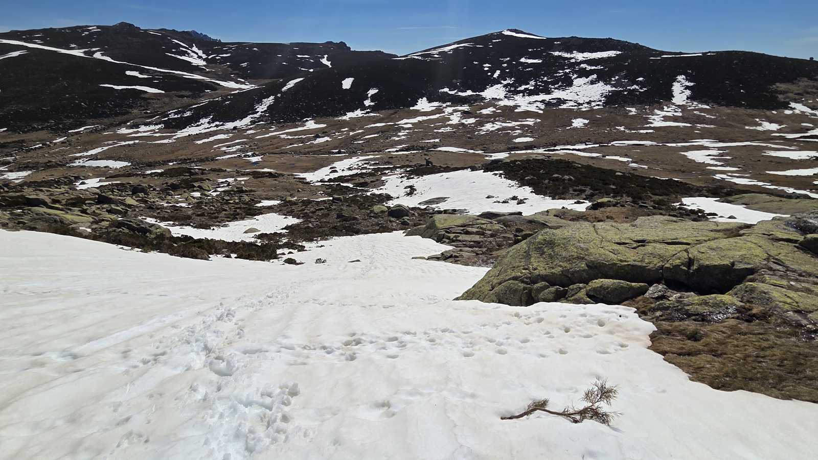 El descenso lo realizamos por la loma, perdiendo altura de forma progresiva sobre un terreno todavía cubierto de nieve, hasta regresar de nuevo al valle y recuperar el camino hacia la plataforma.