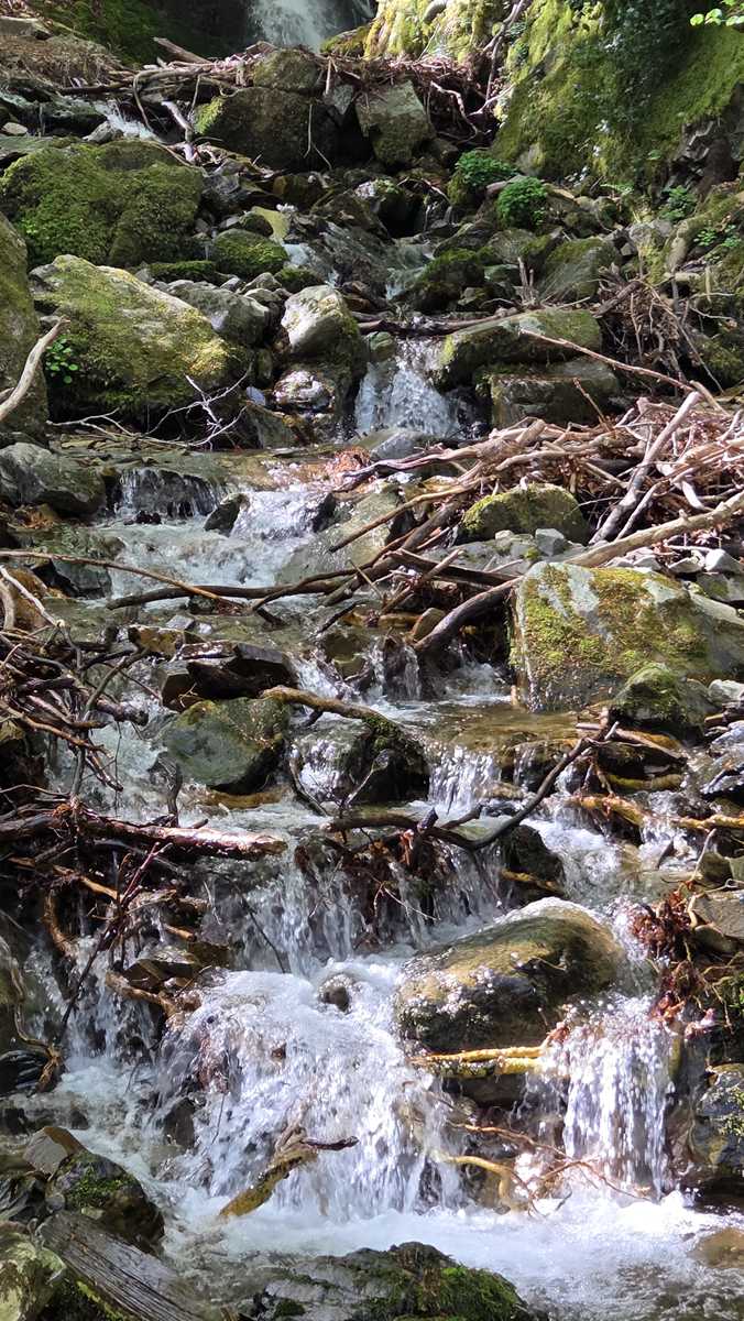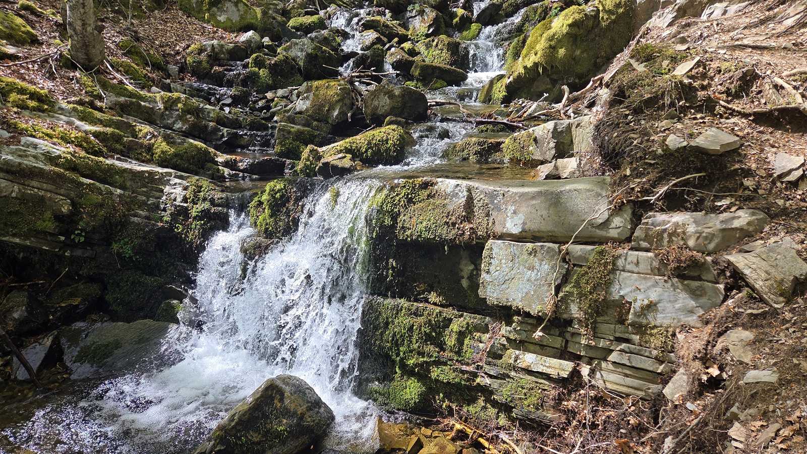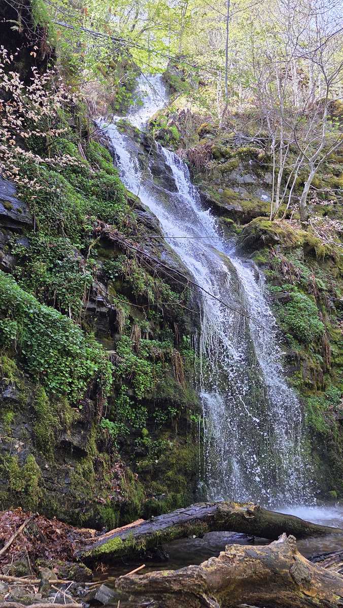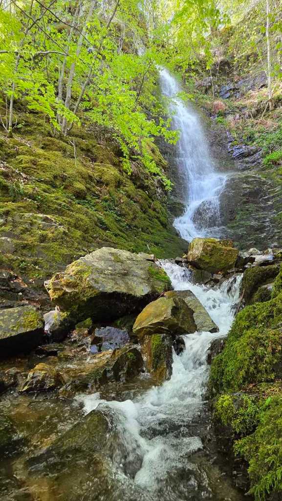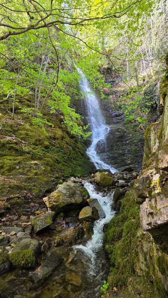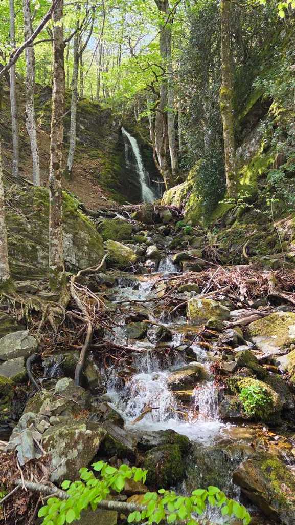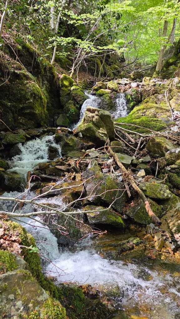 La recompensa no tarda en llegar. Alcanzamos la primera de las cascadas de Altuzarra, el Salto Chico, una caída de agua de unos 12 metros que nos obliga a detenernos y disfrutar del entorno. Continuamos avanzando en paralelo al arroyo, atravesándolo en varias ocasiones por donde mejor se puede, ayudándonos de piedras colocadas estratégicamente y utilizando bastones para mantener el equilibrio.
