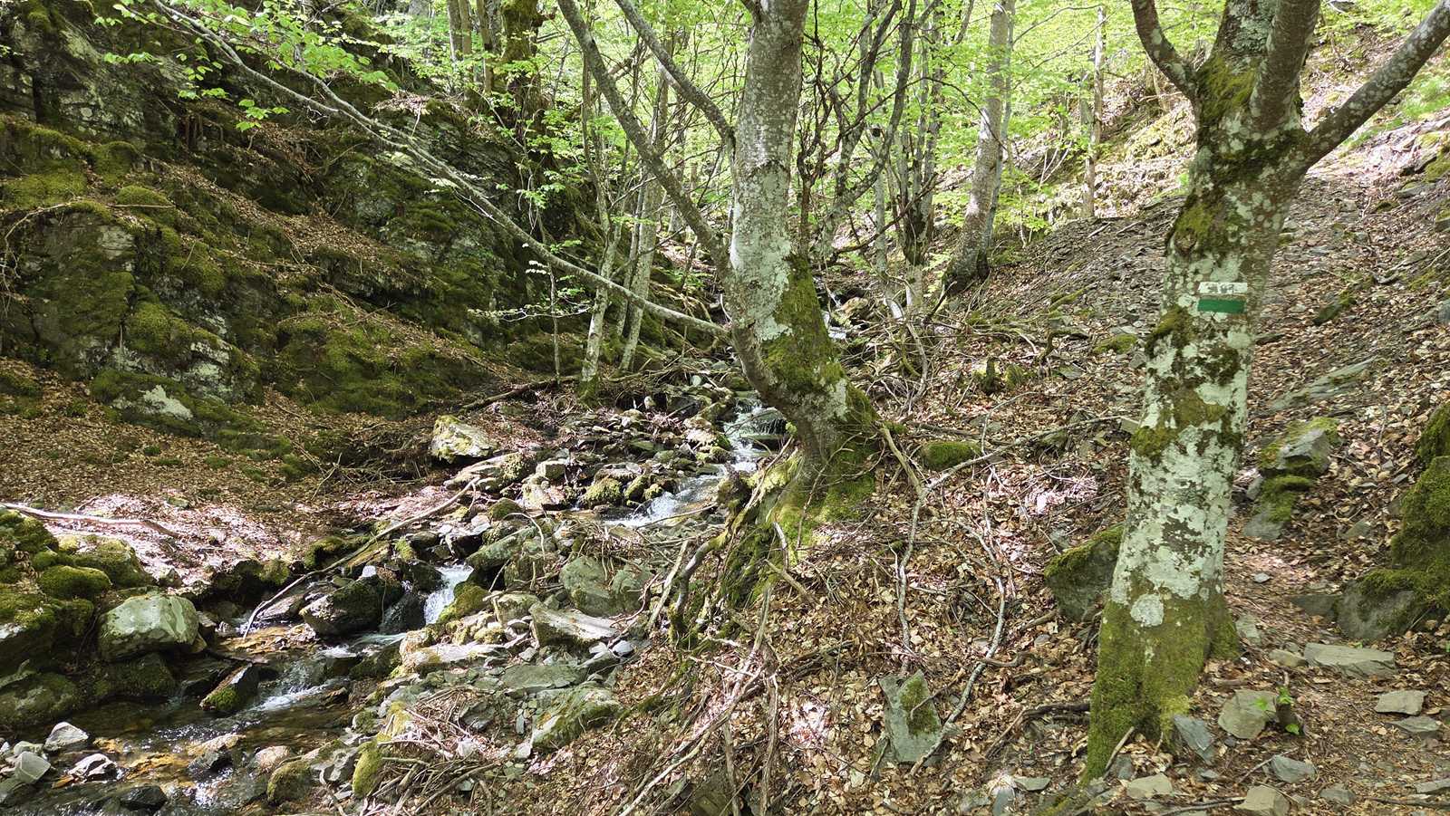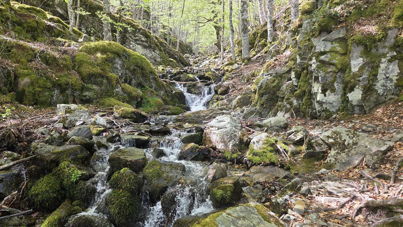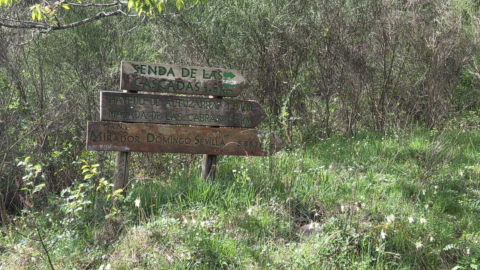 A medida que avanzamos, el paisaje evolucionaba. El sendero, que inicialmente atravesaba un pinar, da paso poco a poco a un bosque de hayas donde el frescor y la sombra se hacen notar de forma muy agradable. Tras cruzar una pasarela sobre el arroyo Altuzarra, el camino empieza a desaparecer por momentos, obligándonos a estar atentos a las marcas de piedra y a las estacas que indican la ruta correcta.