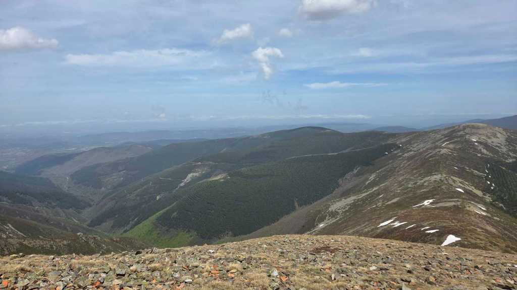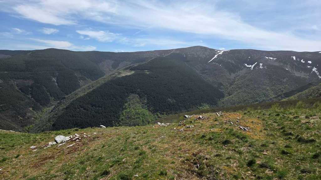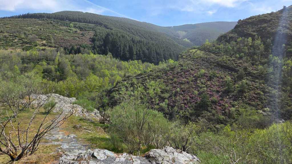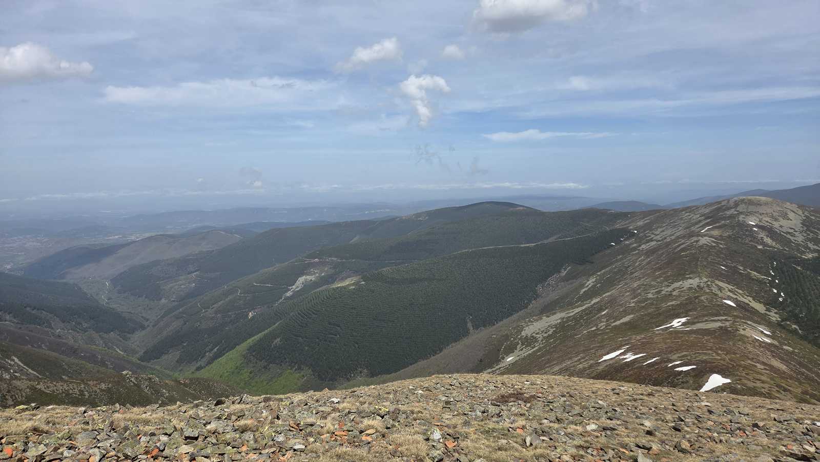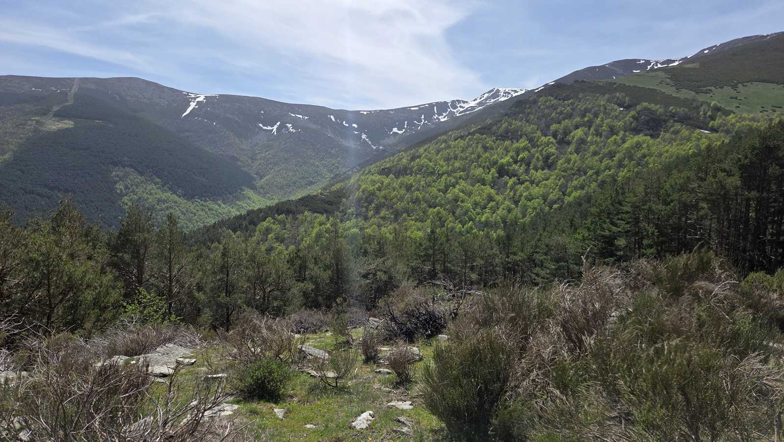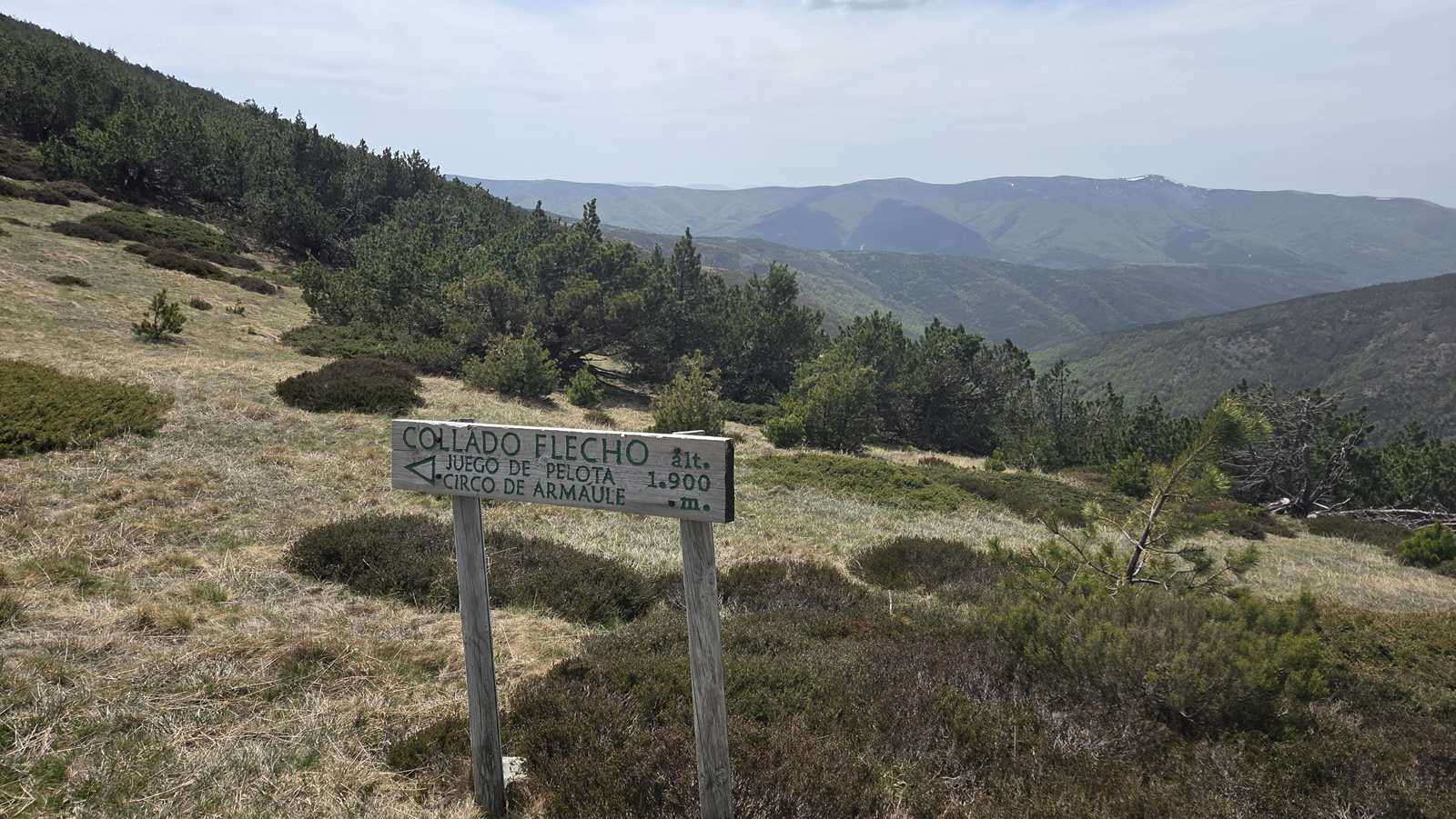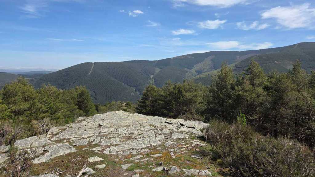 Desde ese punto, el paisaje vuelve a cambiar. Dejamos atrás el entorno más húmedo de las cascadas y el pinar comienza a reaparecer, acompañándonos en una ascensión más directa hasta alcanzar el Alto de la Garrula (1.501 metros). Desde aquí, las vistas son realmente impresionantes.