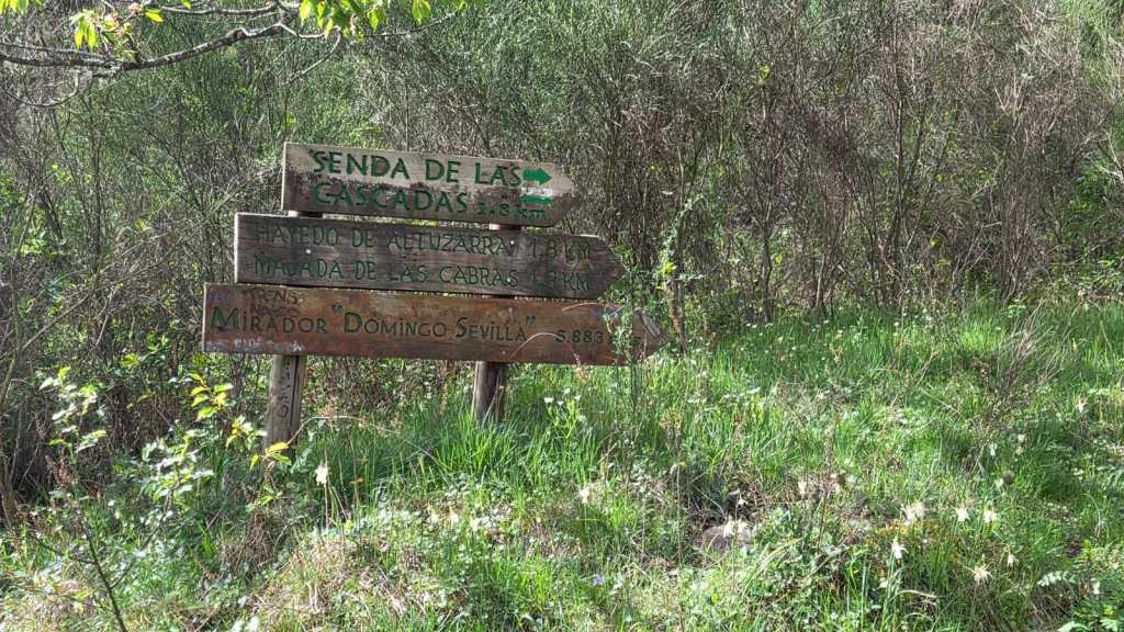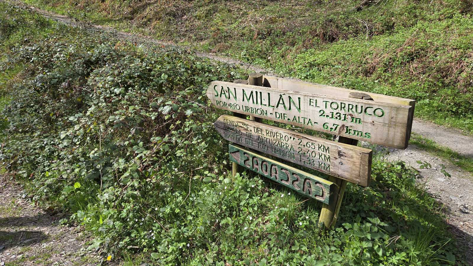 Nada más arrancar, una señal nos ofrece varias opciones para ascender al San Millán: por el desfiladero de Urbión o por las cascadas de Altuzarra. Elegimos esta última para realizar una ruta circular. Una vez en la cima intentaremos descender por el barranco. Tomamos el sendero de la izquierda, acompañados en todo momento por el río Urbión, que discurre a nuestra izquierda mientras pasábamos junto a pequeñas granjas hasta llegar a una pasarela que cruzaba el arroyo Abanza.